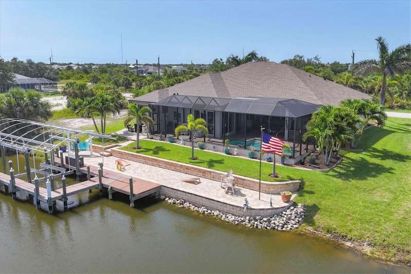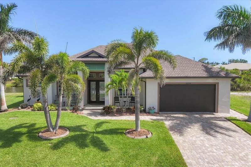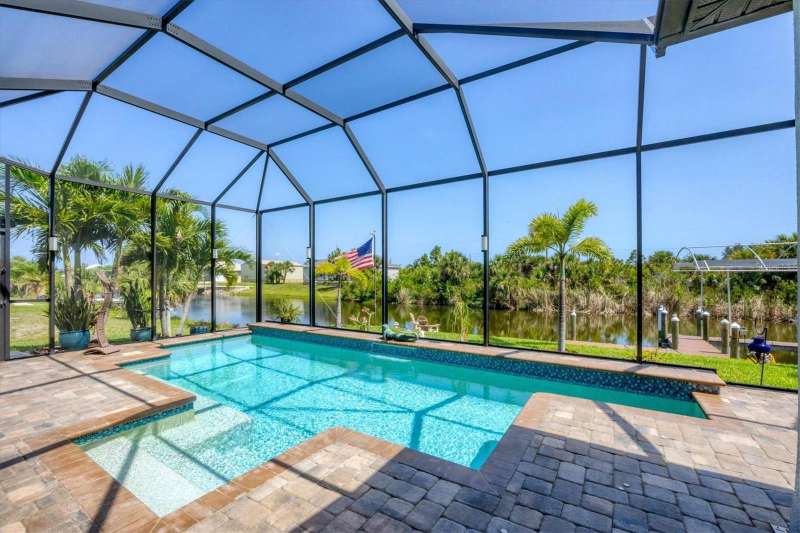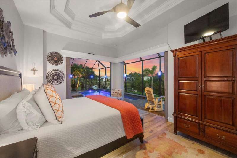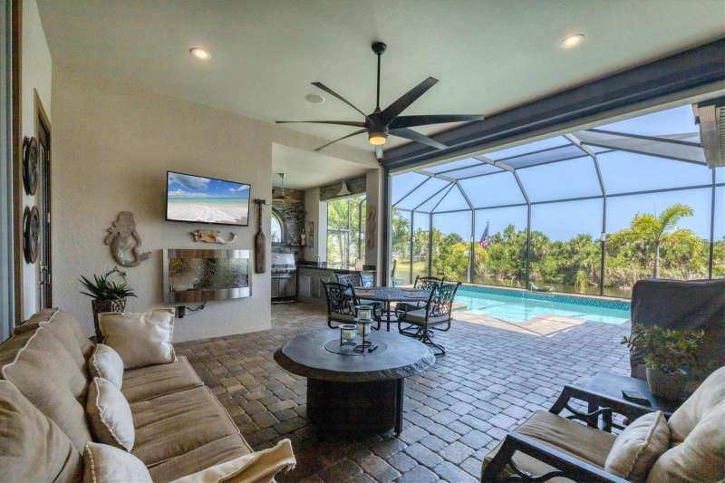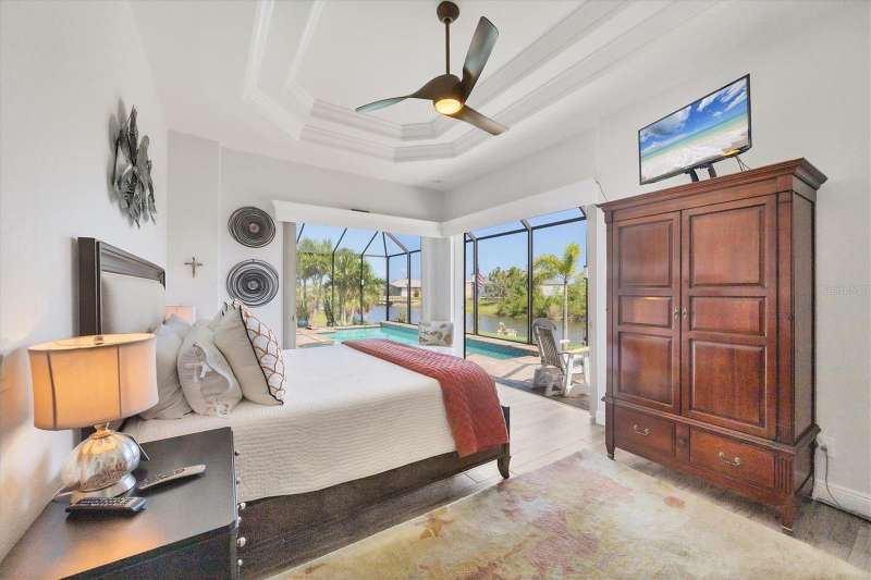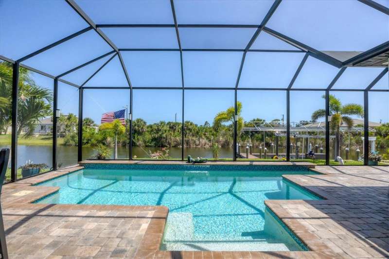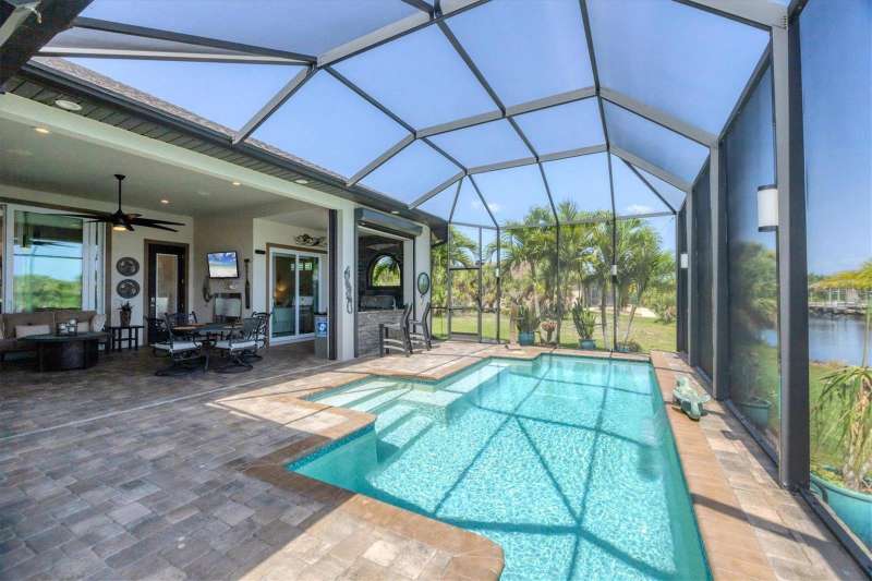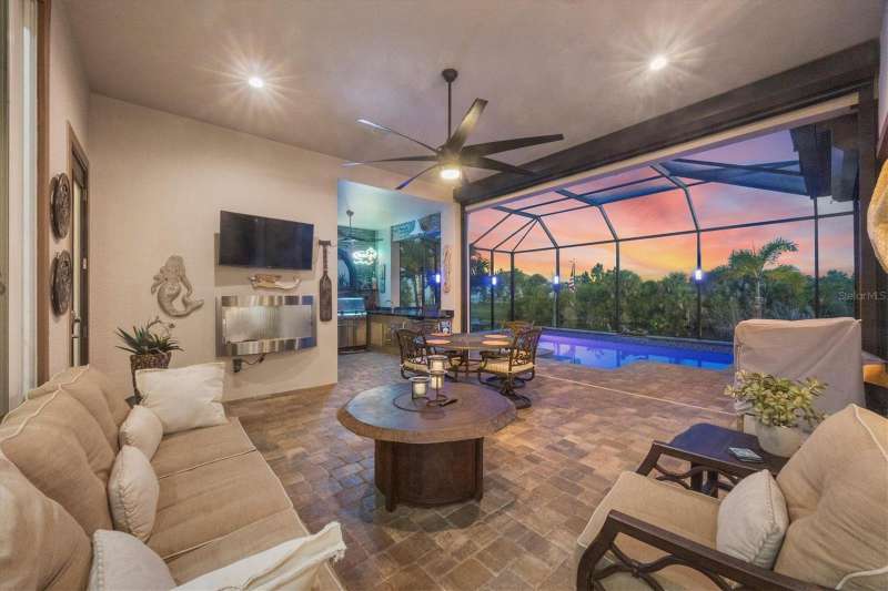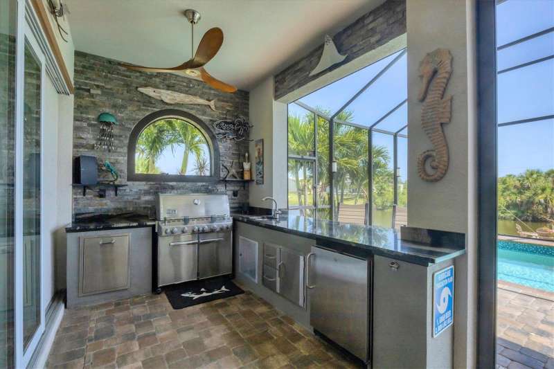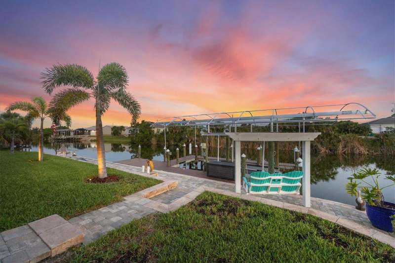 Tucked in a serene Florida waterfront community, this elegant 3-bedroom, 2-bath custom home is the perfect blend of luxury, comfort, and smart design. From the moment you arrive, it’s clear that every inch of this property has been thoughtfully crafted—from the paver driveway and travertine entrance to the gorgeous etched glass double doors that make a striking first impression. Inside, you’re greeted by rich wood-look tile flooring, custom tray ceilings, and a welcoming open layout that flows effortlessly from room to room. The living space is bright and open, with oversized sliders framing stunning water views that never get old. Whether you’re hosting a holiday party or simply relaxing by the electric fireplace with family, this home makes it easy to live beautifully. And the kitchen? It’s a chef’s dream. With a massive 9-foot quartz island, an Electrolux 5-burner induction cooktop, wall ovens, an oversized refrigerator/freezer, and high-end fixtures, cooking becomes a joy — not a chore. You’ll find yourself gathering here often, whether for morning coffee or sunset hors d'oeuvres. The primary suite is a peaceful retreat. Wake up to water views and step directly out to the lanai. The spa-style en-suite bathroom features an oversized walk-through shower, dual vanities, and a 13x8 walk-in closet so spacious it could be its own room. Across the home, two guest bedrooms ensure privacy and comfort for family or visitors. Step out onto the lanai and your private resort awaits. A heated saltwater pool with a soothing water feature invites you in for a dip. Entertain at the fully equipped summer kitchen with a Webber Summit grill and expansive bar space—perfect for laid-back evenings with friends. New pool screens installed in 2023 keep everything fresh and beautiful. And when a storm rolls in? Just press a button—automatic hurricane shutters protect everything, no need to move a single chair. As the sun sets, stroll down the lighted captain’s walk to your private 16-foot composite dock, complete with water and electric hookups and a walk-around 10,000 lb. boat lift—making every boat day easy and effortless. This home is not just beautiful, it’s built for peace of mind. From impact-resistant glass and electric shutters to Icynene insulation, Nest smart home features, and a newly painted exterior (2023), it’s as smart and secure as it is stunning. There are too many extras to list—but one walk through will show you: this is more than a home, it’s a lifestyle. Schedule your private tour today and experience the very best in Florida luxury living.