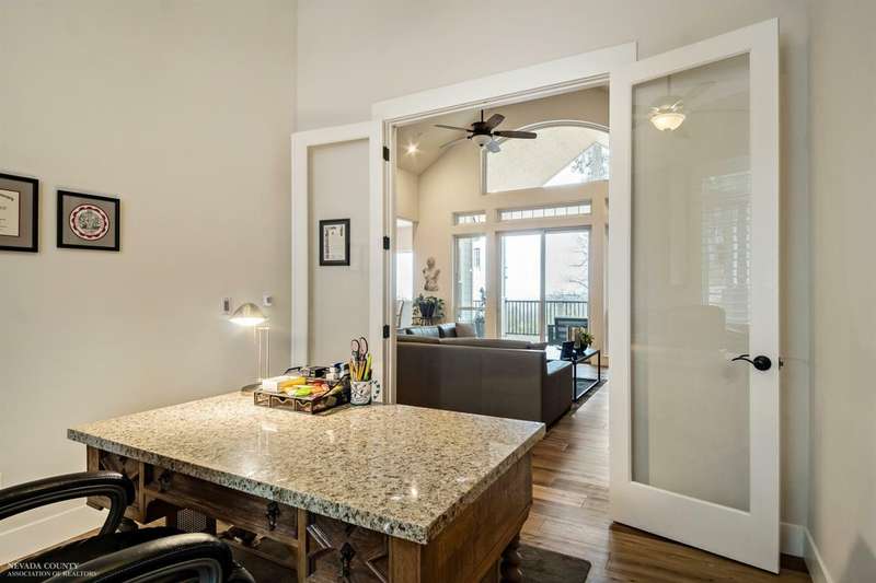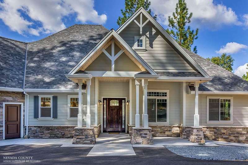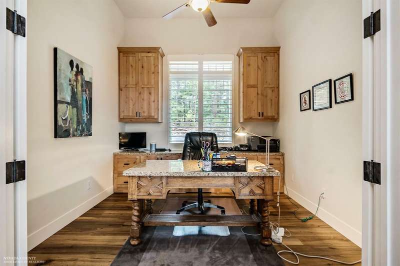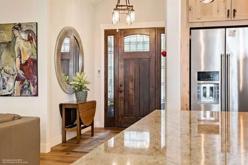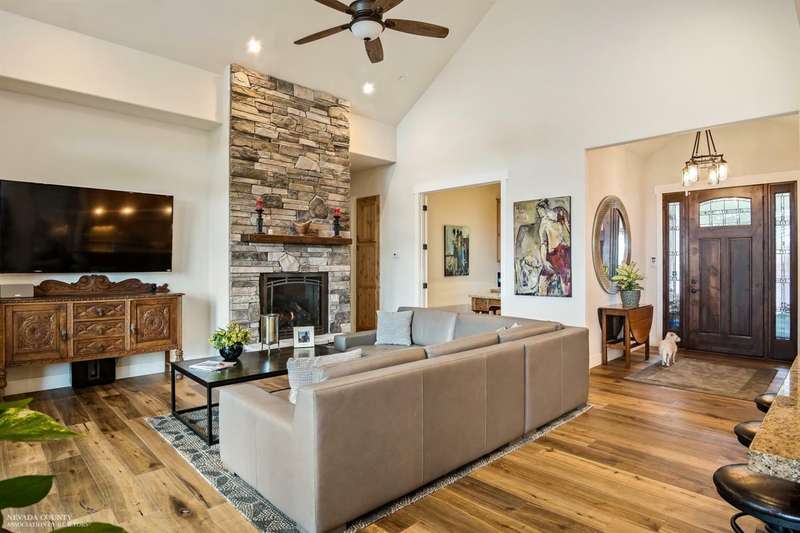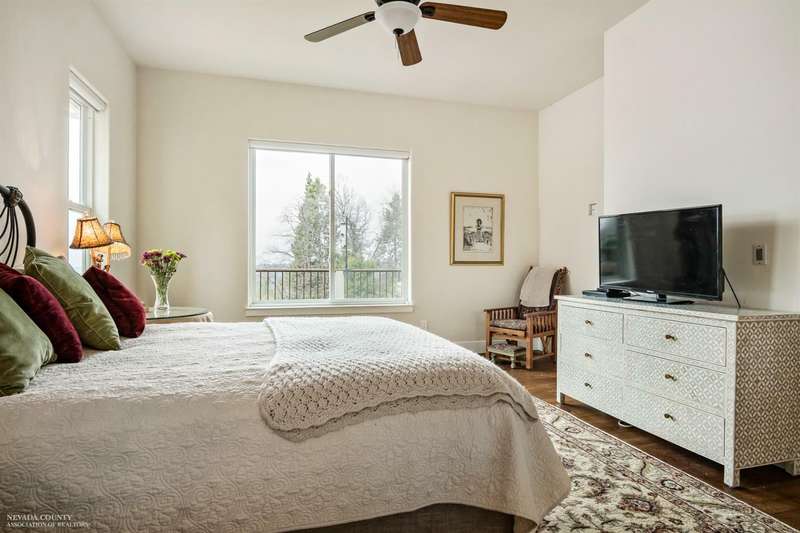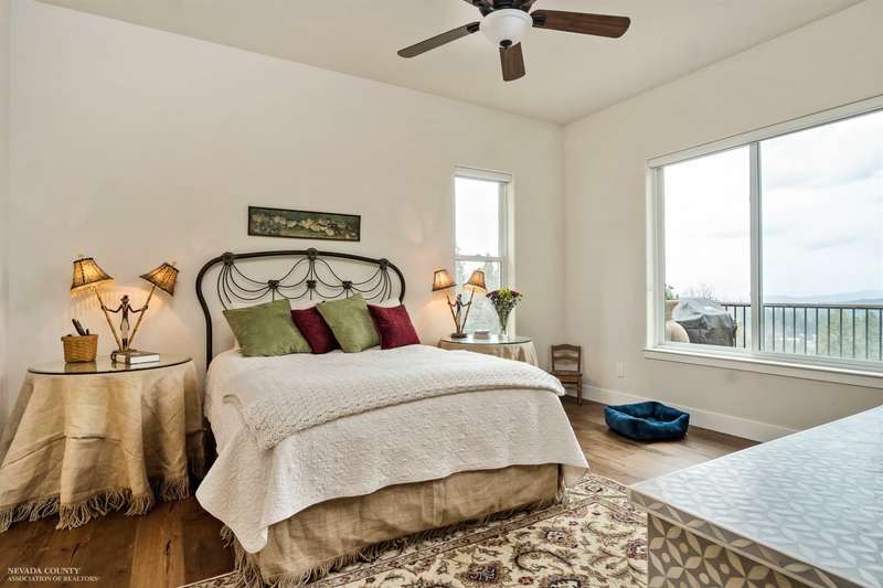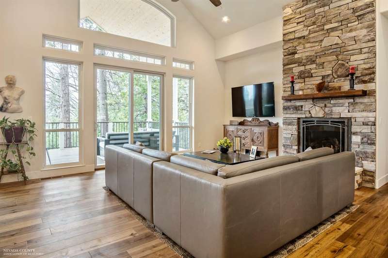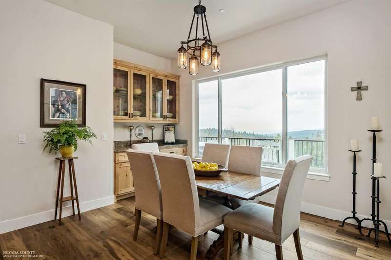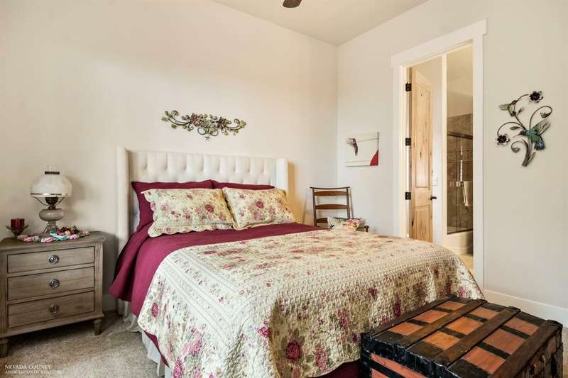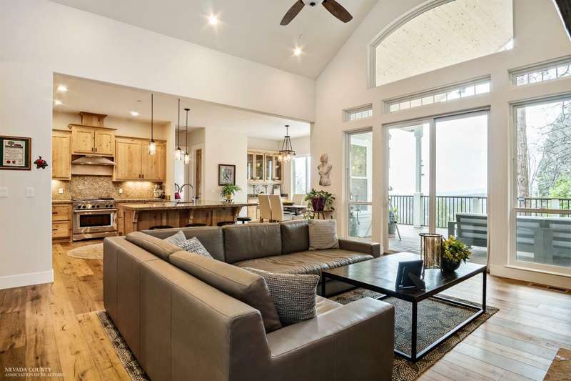 Stunning Craftsman style home built in 2016 with one of the most beautiful views in Nevada City! Great open floor plan with 10'-18' vaulted ceilings, natural stone fireplace, solid Brazilian walnut hardwood floors and fabulous open entertainment kitchen with center island, alder cabinets, granite counters and stainless appliances. Oversized sliding glass doors lead to a large and very private covered deck with hot tub and spectacular sunset views for year-round enjoyment. All living is on the main level with a large Master suite with walk in closet, and huge master bath. Lovely and generous guest rooms with bath on opposite end of the house from the master, as well as an office off the main living area with alder cabinets and granite countertop. Huge upstairs bonus loft with vaulted ceilings and hardwood floors. 3+ car garage and additional parking for 4 vehicles on a low maintenance, 2 acre parcel with natural gas and public water. Tankless water heater. Fire suppression system