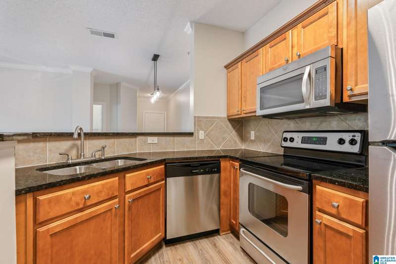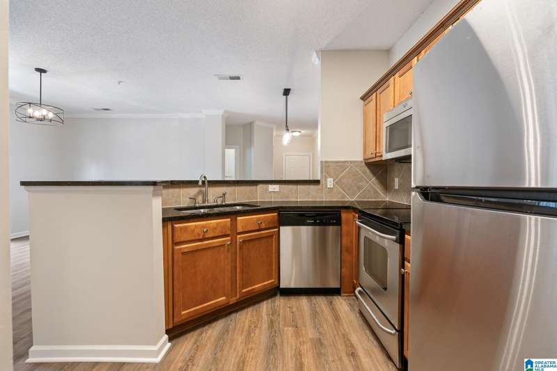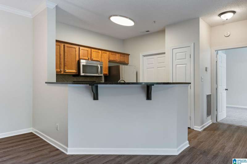 Wonderful main level condo with no steps to entryway & easy access from parking lot. This 2-bedroom, 2-bath unit offers fresh updates including new LVP flooring in living spaces, new carpet in bedrooms & fresh paint throughout. The open floor plan connects the living room, dining area & kitchen that is perfect for entertaining. Kitchen features a breakfast bar, granite countertops & stainless appliances: electric stove, built-in microwave, dishwasher & refrigerator. The oversized primary suite includes a large walk-in closet & en-suite bath with a subway tile flooring & a tiled shower. The 2nd bedroom is spacious with ample closet space, & the hall bath features new tile flooring & a tub/shower combo. A separate laundry room offers cabinet storage & space for full-size washer & dryer. Enjoy relaxing on the covered balcony with storage room. Prime location'just 8 minutes to the Galleria, 12 minutes to Riverchase Country Club, & acess to quick I-65!