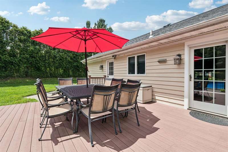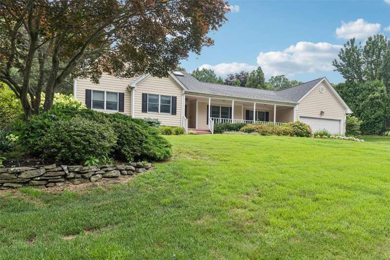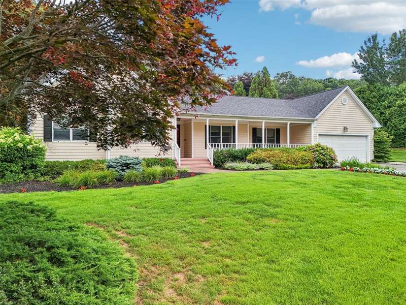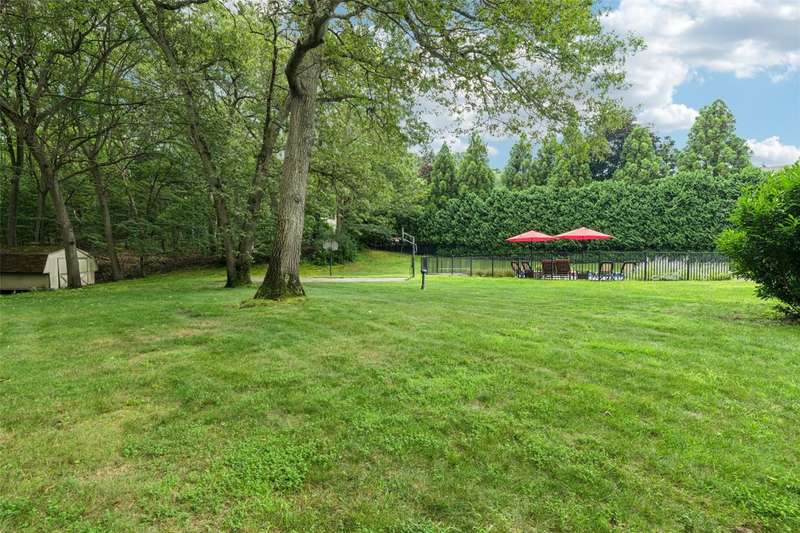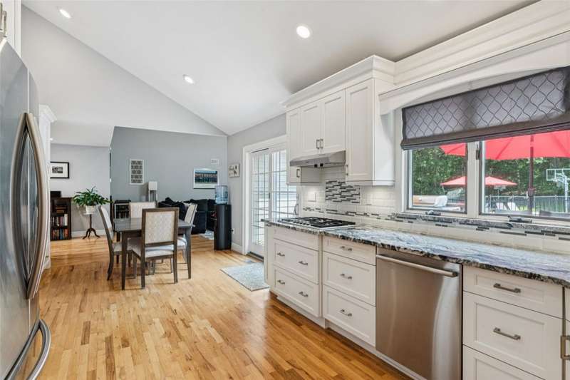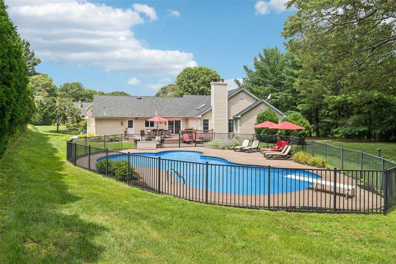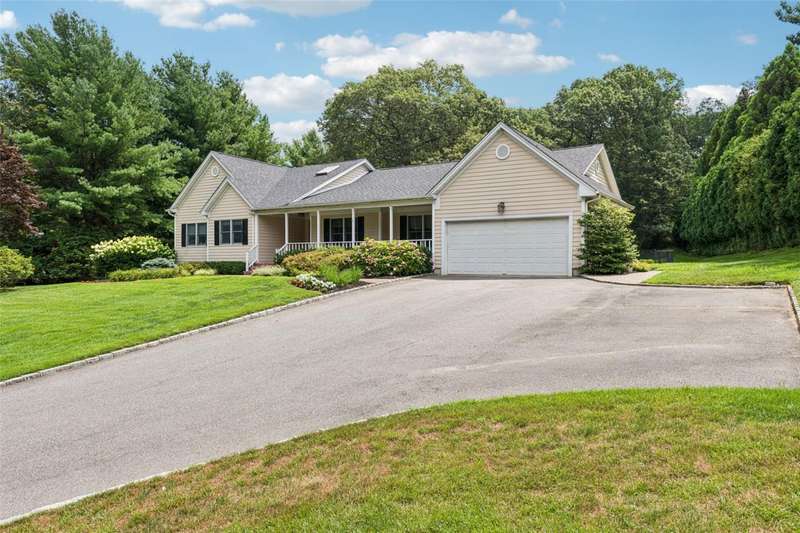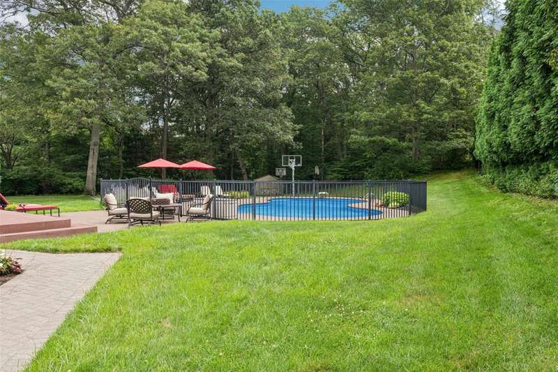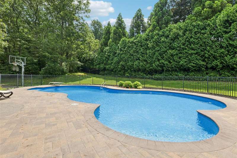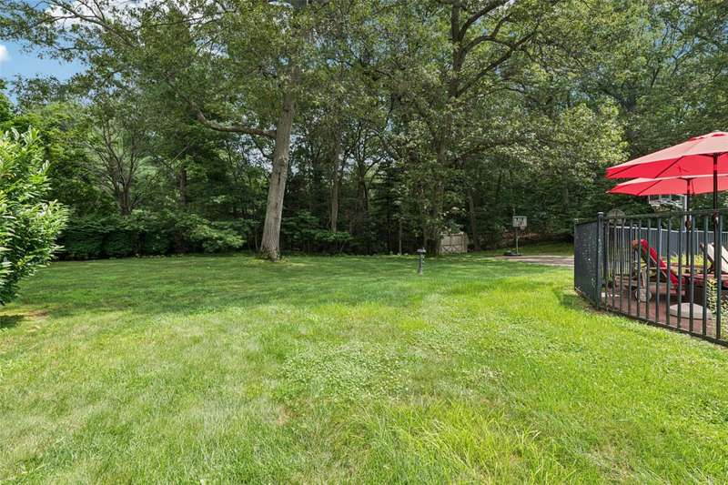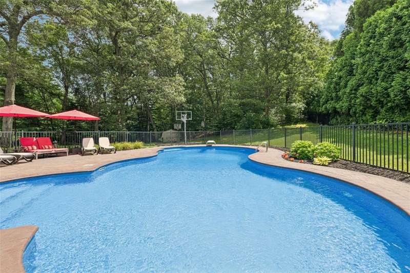 Welcome to 17 Wood Hollow Lane - a beautifully updated 5-bedroom, 2.5-bath ranch nestled in a quiet cul-de-sac in Northport's desirable Fort Salonga community. Located within the Kings Park School District and set on 1.1 private, park-like acres, this home offers a rare blend of comfort, functionality, and luxurious indoor-outdoor living.With over 2,800 square feet on the main level, the home is thoughtfully designed for both everyday living and entertaining. At its heart is a stunning open-concept kitchen with vaulted ceilings, granite countertops, stainless steel appliances, and rich wood cabinetry-seamlessly connecting to the dining area and large deck beyond. The adjacent vaulted den features a skylight, a cozy wood-burning fireplace and expansive windows that fill the space with light and frame serene views of the backyard oasis.The private primary suite is a true retreat, featuring a walk-in closet and a newly renovated spa-inspired bath with a soaking tub, glass-enclosed rain shower, and dual vanity. Four additional bedrooms and a stylish full bath offer flexibility for guests, home office, or multigenerational living.Additional highlights include a beautifully renovated powder room, laundry area, a full bath, gleaming hardwood floors, recessed lighting, gas heat, and a smart thermostat for year-round comfort. The partially finished basement offers even more living space, abundant storage, and access to the main level and attached two-car garage.Step outside to a fully fenced, resort-style backyard-complete with a beautiful in-ground pool, expansive patio, lush lawn, and a basketball court tucked to the side. Whether you're hosting summer gatherings or enjoying a quiet moment poolside, this outdoor space is sure to impress.Located just minutes from beaches, parks, golf, and the charming village of Northport, 17 Wood Hollow Lane offers the privacy you crave with the convenience you need-truly move-in ready and made for modern living.