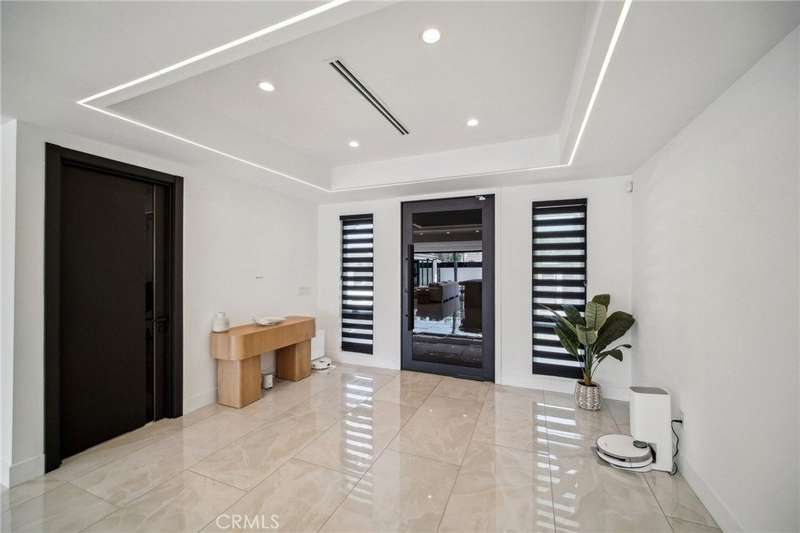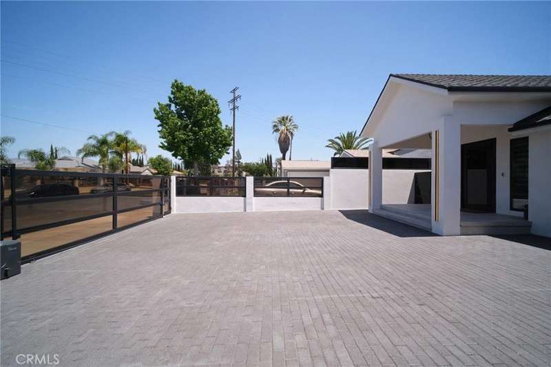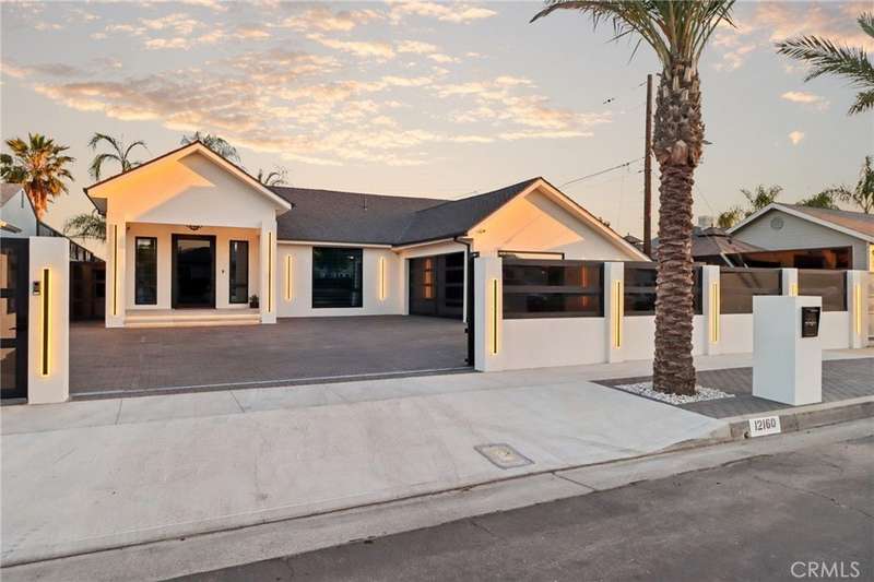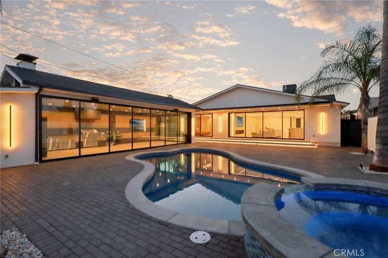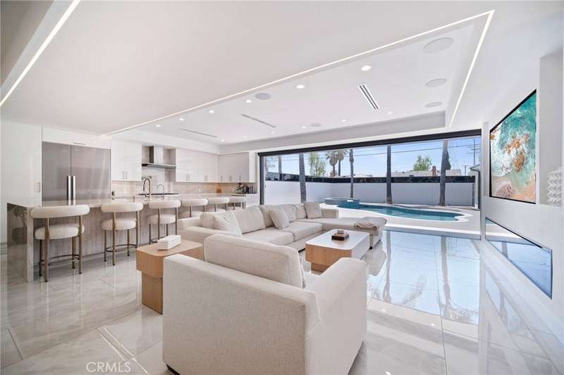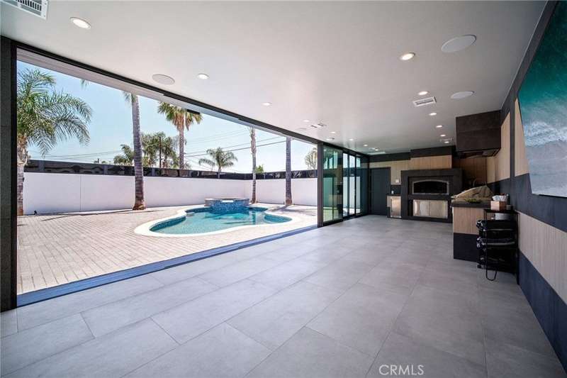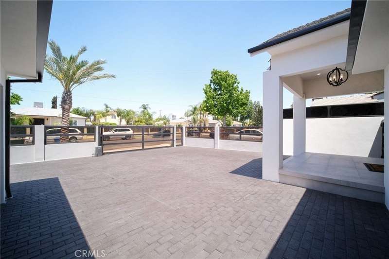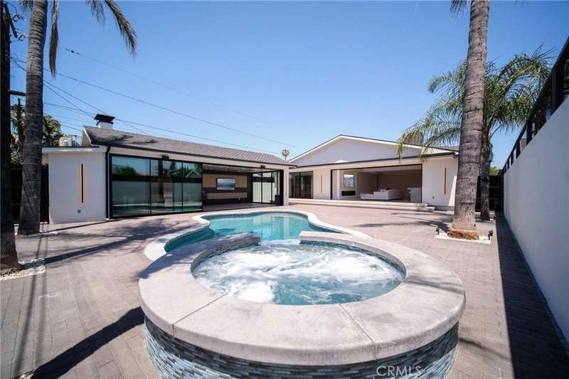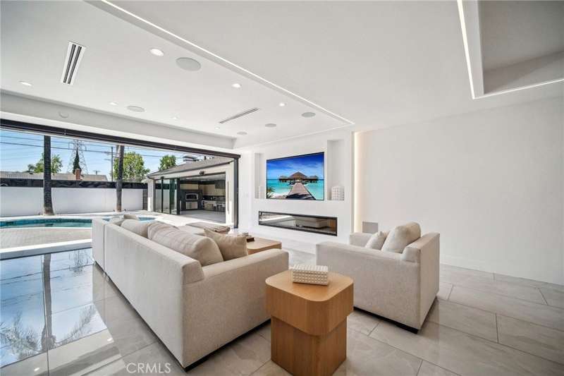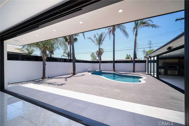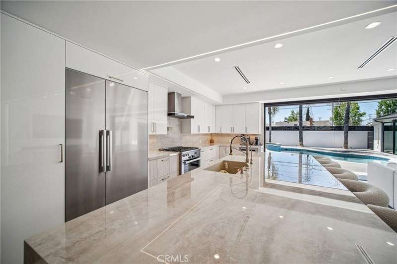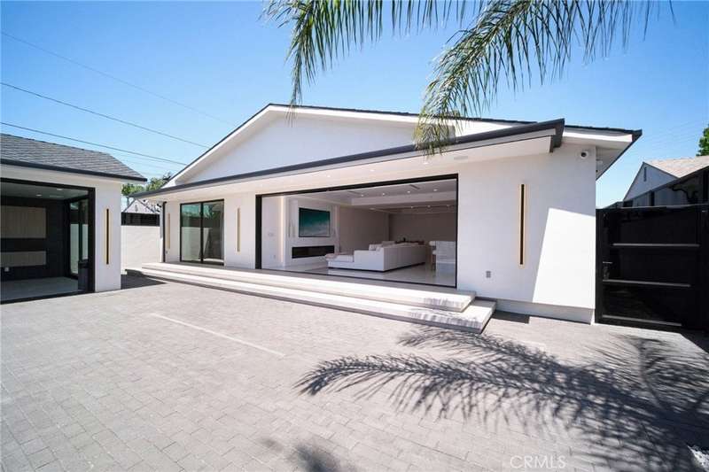 This bold European modern estate in North Hollywood is a true architectural statement. Privately gated and finished in crisp black-and-white tones with presidential roof shingles, it delivers immediate impact. A grand glass pivot door ushers you into an expansive 2,332 square foot open concept interior defined by custom tray ceilings, ambient LED strip lighting, recessed lighting, designer tile flooring, and minimalist infinity vents with integrated speakers seamlessly merging innovation and design. The custom chef’s kitchen features sophisticated two-tone cabinetry, a dramatic 12-foot waterfall island with extensive built-in storage, Taj Mahal countertops, a built-in stainless steel refrigerator, Miele appliances, and a disappearing pocket door for uninterrupted flow. The living room centers around an abstract fireplace wall with custom shelving and an electric fireplace. The wall extends beyond its frame with backlit LED detailing, creating a striking visual effect and an unforgettable centerpiece. The primary suite offers a private retreat, complete with a custom walk-in closet, spa-inspired bathroom, and full-height sliding glass doors that open to a verdant backyard sanctuary. Three bedrooms and three bathrooms including two en-suite configurations plus a thoughtfully designed powder room, are finished with warm wood floors and designer tilework throughout. The finished garage includes a half bathroom and a discreet laundry area. Both the front and back yards are meticulously designed with large-format modern pavers, mature palms, and lush landscaping, all enclosed with clean-lined fencing for enhanced privacy. The backyard evokes a resort-like atmosphere, featuring a shimmering pool, elevated spa, and a 615 square foot pool house designed for versatility and style. Highlighting the space is an impressive 7-panel, over-30-foot pocket door system that fully stacks at the final panel creating a seamless indoor-outdoor transition. The pool house also features bamboo-style tile in black and gray tones, a fully outfitted custom BBQ center, a full bathroom, and dedicated storage for outdoor essentials. Additionally, the property includes brand-new air conditioning and heating systems, two gas-powered Rinnai tankless water heaters—one serving the main residence and one for the pool house—and a newly installed roof. Refined, contemporary, and built to impress—this home redefines European modern living in the heart of North Hollywood.