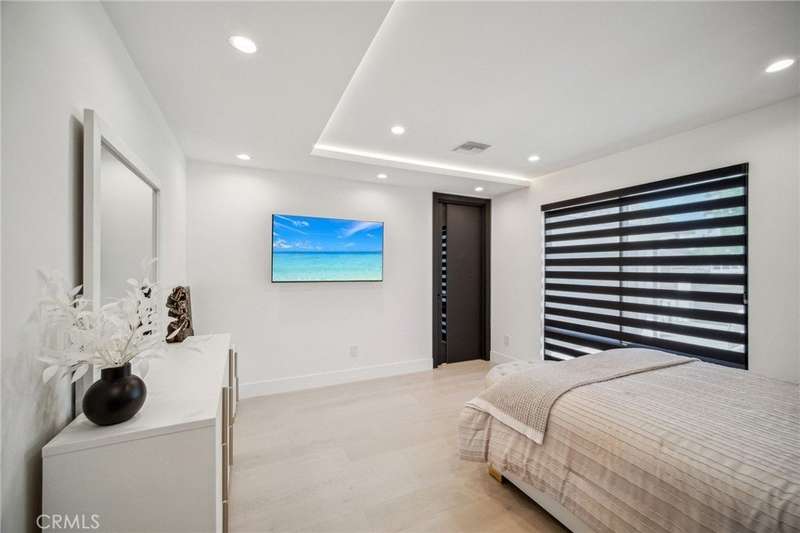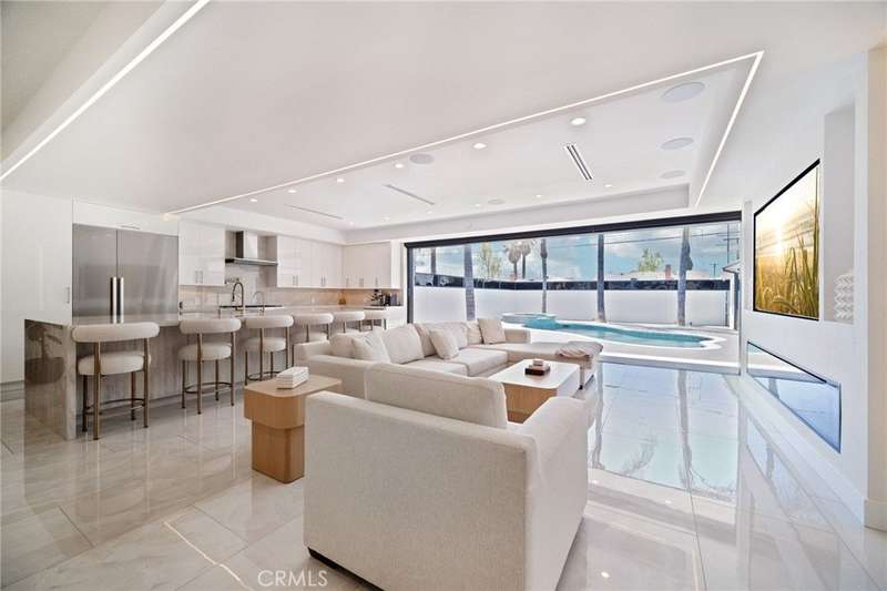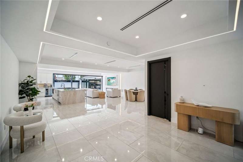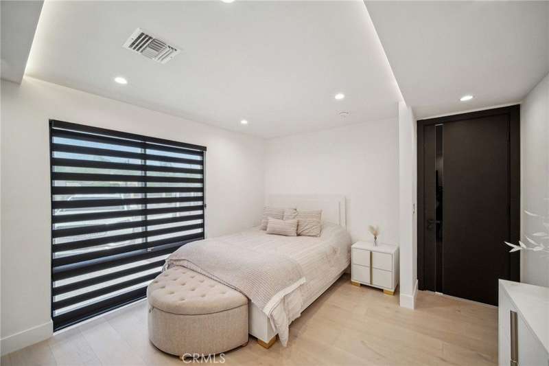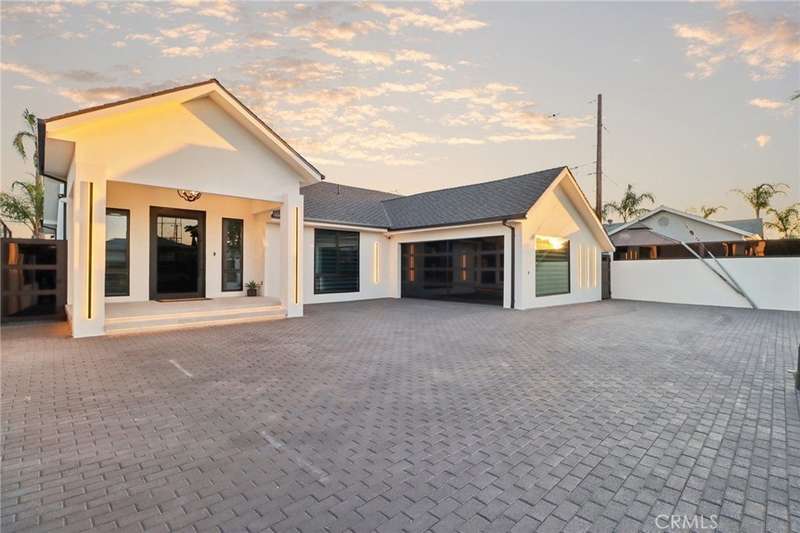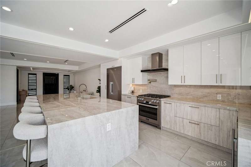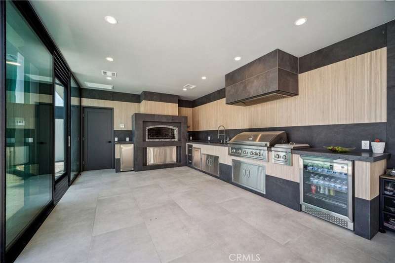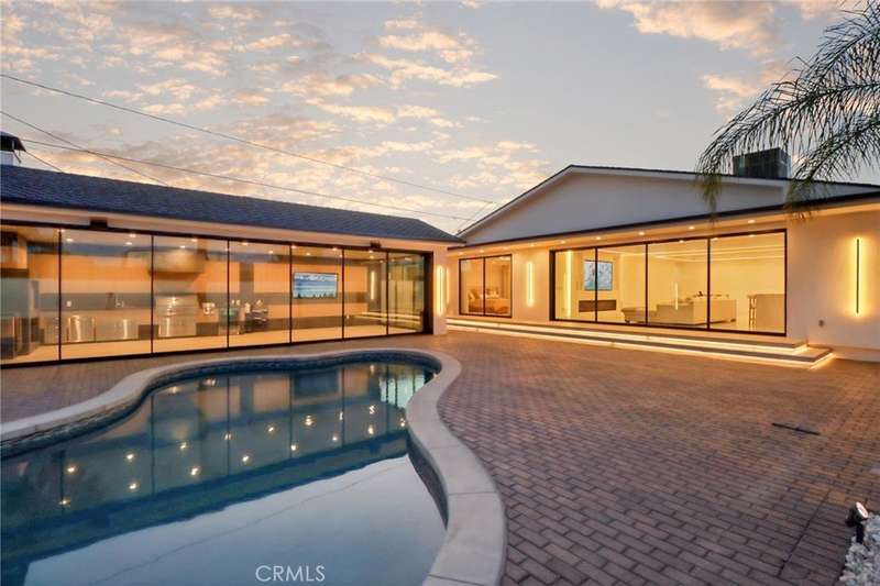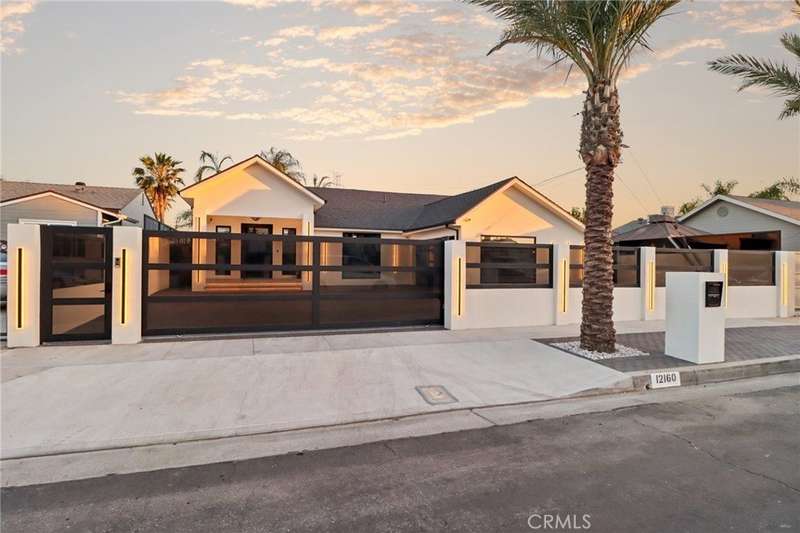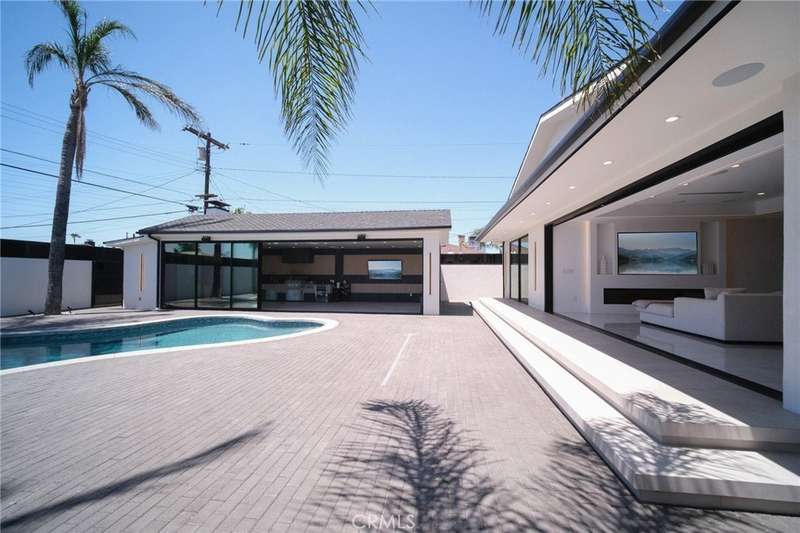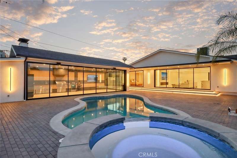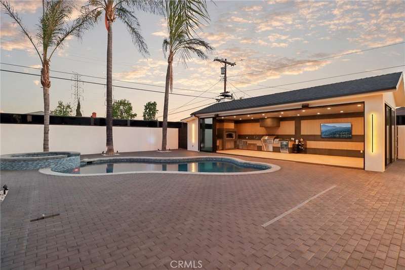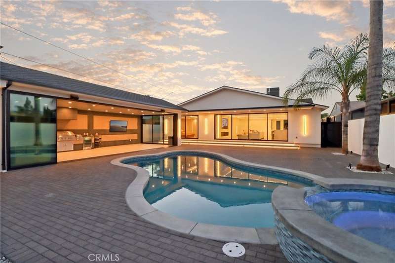 This bold European modern estate in North Hollywood is a true architectural statement. Privately gated and finished in crisp black-and-white tones with presidential roof shingles, it delivers immediate impact. A grand glass pivot door ushers you into an expansive 2,332 square foot open concept interior defined by custom tray ceilings, ambient LED strip lighting, recessed lighting, designer tile flooring, and minimalist infinity vents with integrated speakers seamlessly merging innovation and design. The custom chef’s kitchen features sophisticated two-tone cabinetry, a dramatic 12-foot waterfall island with extensive built-in storage, Taj Mahal countertops, a built-in stainless steel refrigerator, Miele appliances, and a disappearing pocket door for uninterrupted flow. The living room centers around an abstract fireplace wall with custom shelving and an electric fireplace. The wall extends beyond its frame with backlit LED detailing, creating a striking visual effect and an unforgettable centerpiece. The primary suite offers a private retreat, complete with a custom walk-in closet, spa-inspired bathroom, and full-height sliding glass doors that open to a verdant backyard sanctuary. Three bedrooms and three bathrooms including two en-suite configurations plus a thoughtfully designed powder room, are finished with warm wood floors and designer tilework throughout. The finished garage includes a half bathroom and a discreet laundry area. Both the front and back yards are meticulously designed with large-format modern pavers, mature palms, and lush landscaping, all enclosed with clean-lined fencing for enhanced privacy. The backyard evokes a resort-like atmosphere, featuring a shimmering pool, elevated spa, and a 615 square foot pool house designed for versatility and style. Highlighting the space is an impressive 7-panel, over-30-foot pocket door system that fully stacks at the final panel creating a seamless indoor-outdoor transition. The pool house also features bamboo-style tile in black and gray tones, a fully outfitted custom BBQ center, a full bathroom, and dedicated storage for outdoor essentials. Additionally, the property includes brand-new air conditioning and heating systems, two gas-powered Rinnai tankless water heaters—one serving the main residence and one for the pool house—and a newly installed roof. Refined, contemporary, and built to impress—this home redefines European modern living in the heart of North Hollywood.