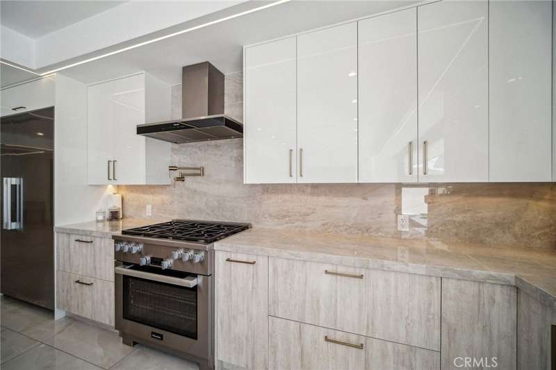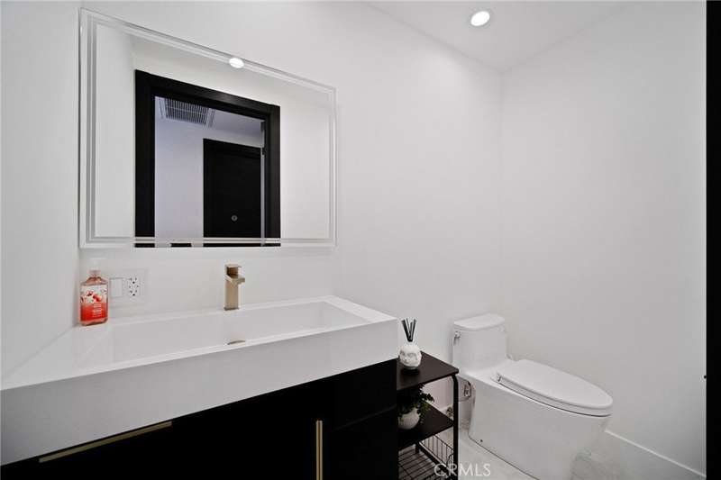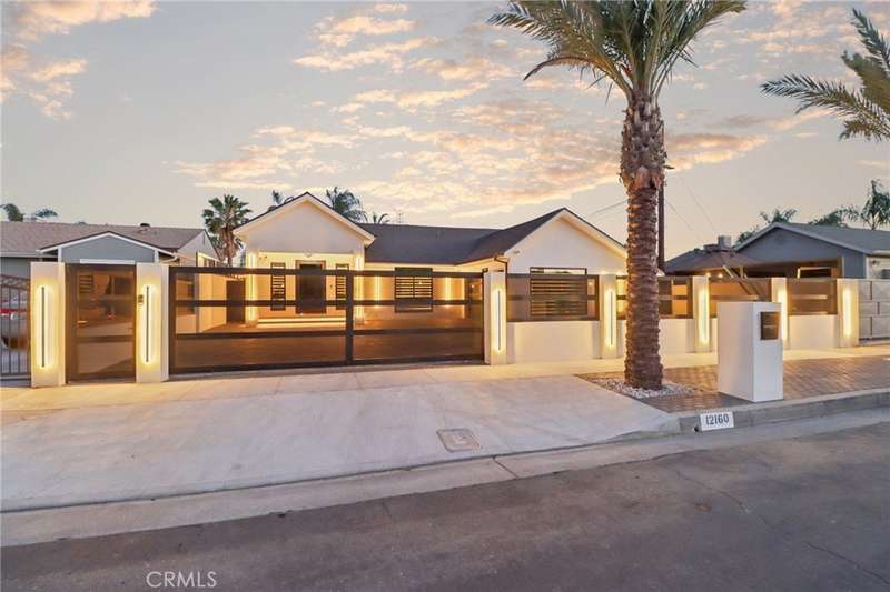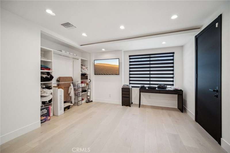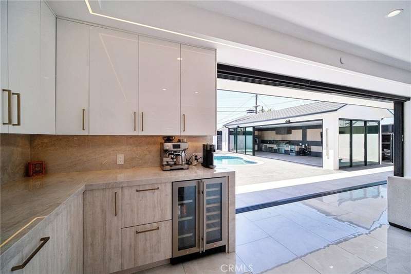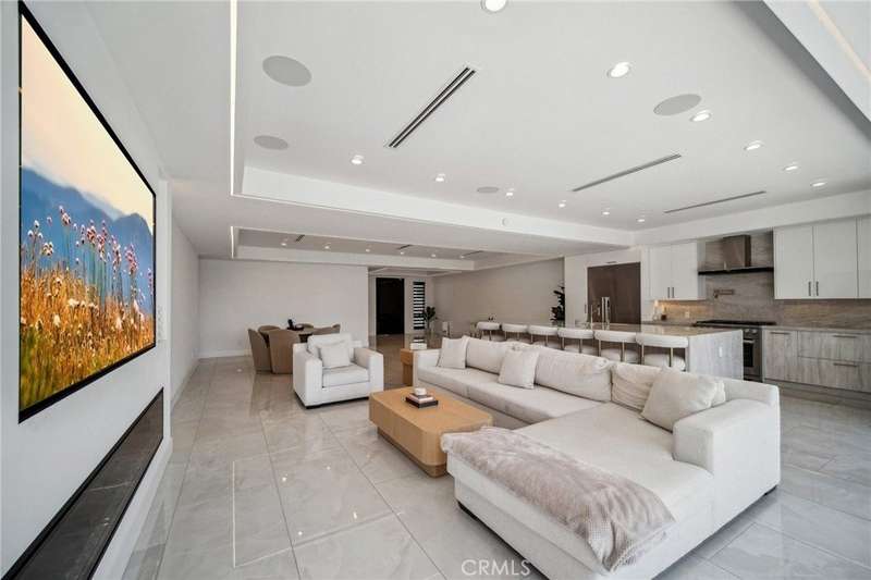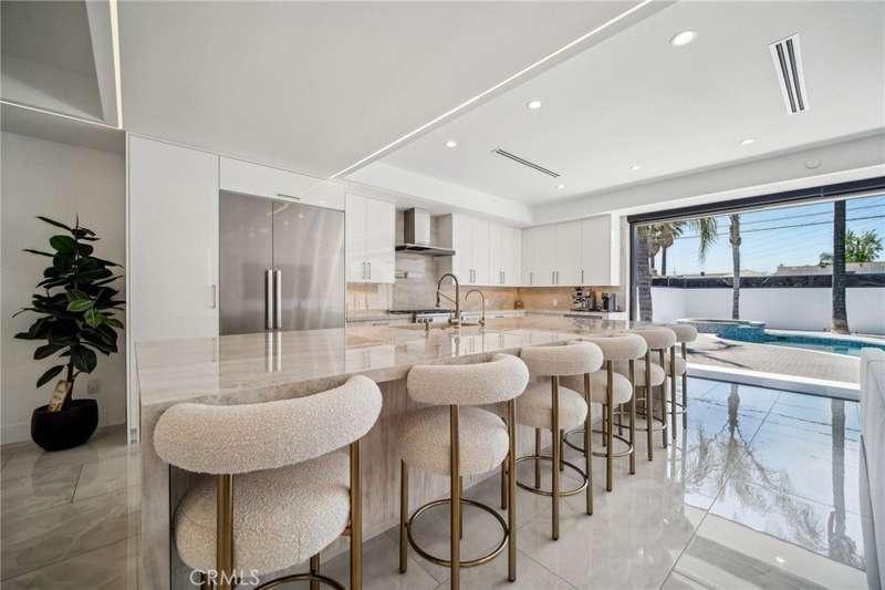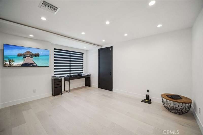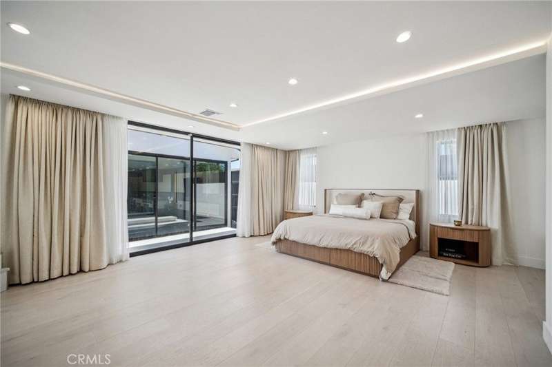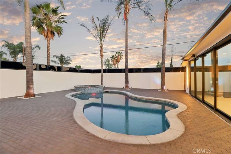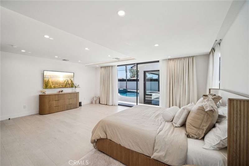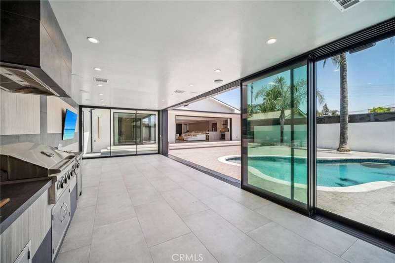 This bold European modern estate in North Hollywood is a true architectural statement. Privately gated and finished in crisp black-and-white tones with presidential roof shingles, it delivers immediate impact. A grand glass pivot door ushers you into an expansive 2,332 square foot open concept interior defined by custom tray ceilings, ambient LED strip lighting, recessed lighting, designer tile flooring, and minimalist infinity vents with integrated speakers seamlessly merging innovation and design. The custom chef’s kitchen features sophisticated two-tone cabinetry, a dramatic 12-foot waterfall island with extensive built-in storage, Taj Mahal countertops, a built-in stainless steel refrigerator, Miele appliances, and a disappearing pocket door for uninterrupted flow. The living room centers around an abstract fireplace wall with custom shelving and an electric fireplace. The wall extends beyond its frame with backlit LED detailing, creating a striking visual effect and an unforgettable centerpiece. The primary suite offers a private retreat, complete with a custom walk-in closet, spa-inspired bathroom, and full-height sliding glass doors that open to a verdant backyard sanctuary. Three bedrooms and three bathrooms including two en-suite configurations plus a thoughtfully designed powder room, are finished with warm wood floors and designer tilework throughout. The finished garage includes a half bathroom and a discreet laundry area. Both the front and back yards are meticulously designed with large-format modern pavers, mature palms, and lush landscaping, all enclosed with clean-lined fencing for enhanced privacy. The backyard evokes a resort-like atmosphere, featuring a shimmering pool, elevated spa, and a 615 square foot pool house designed for versatility and style. Highlighting the space is an impressive 7-panel, over-30-foot pocket door system that fully stacks at the final panel creating a seamless indoor-outdoor transition. The pool house also features bamboo-style tile in black and gray tones, a fully outfitted custom BBQ center, a full bathroom, and dedicated storage for outdoor essentials. Additionally, the property includes brand-new air conditioning and heating systems, two gas-powered Rinnai tankless water heaters—one serving the main residence and one for the pool house—and a newly installed roof. Refined, contemporary, and built to impress—this home redefines European modern living in the heart of North Hollywood.