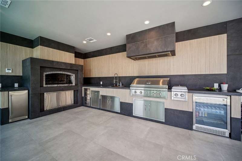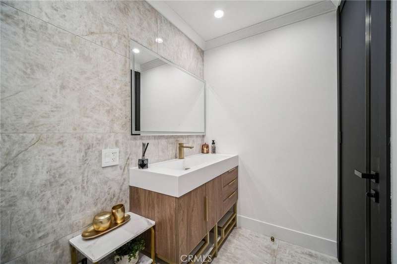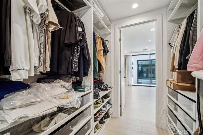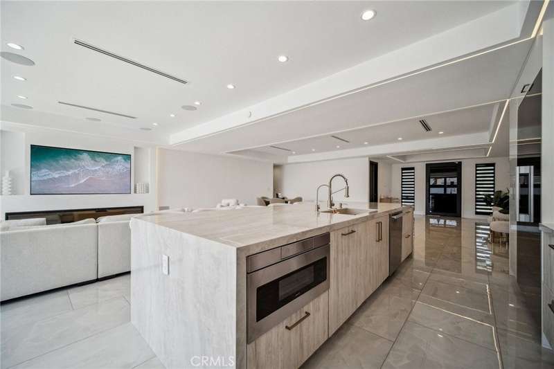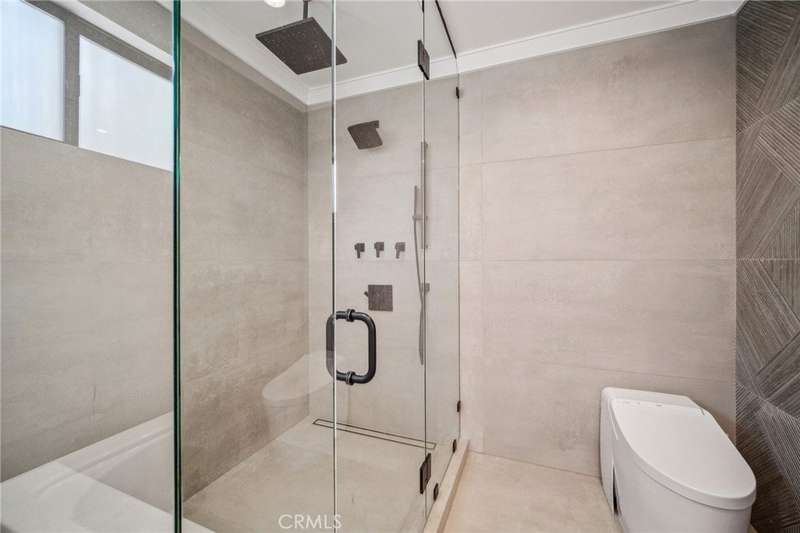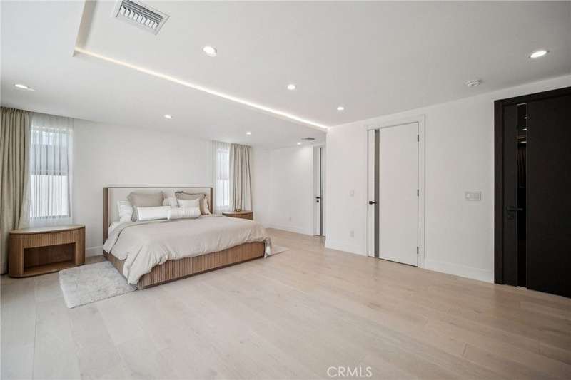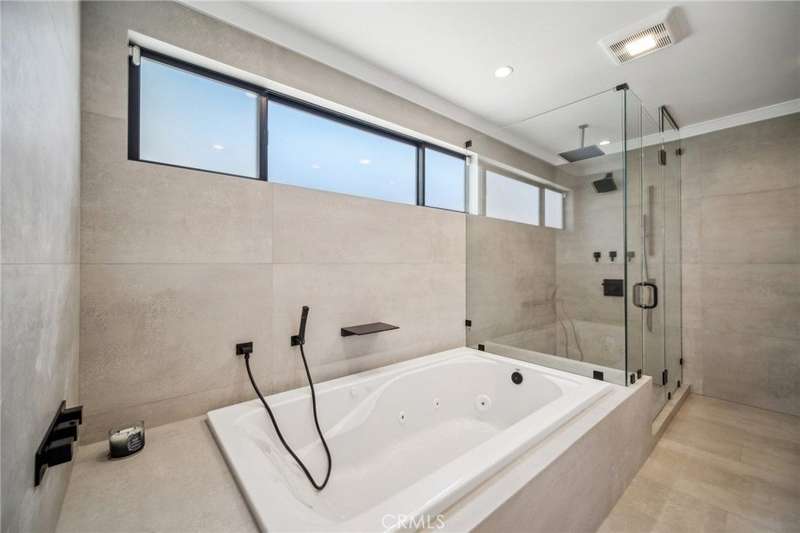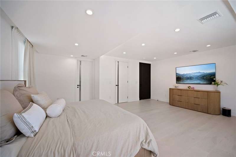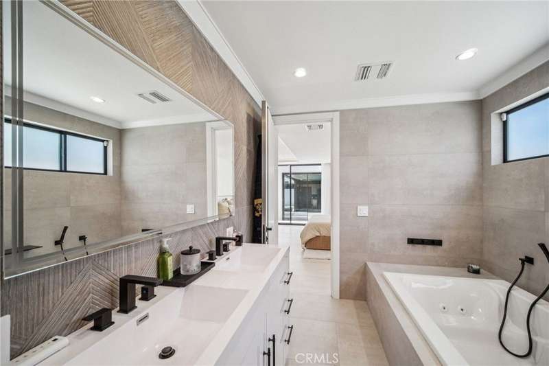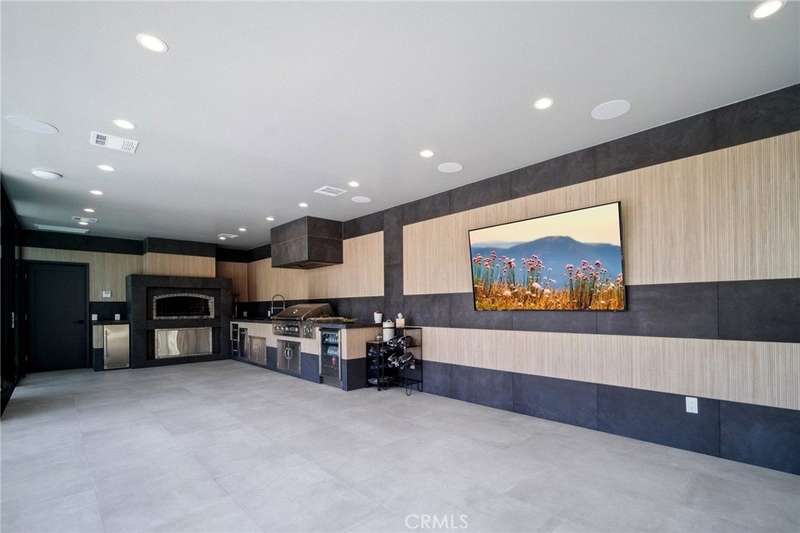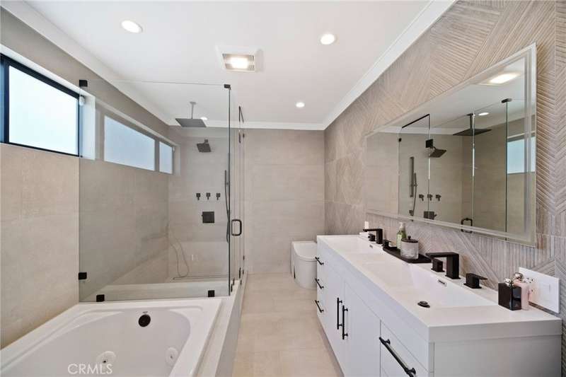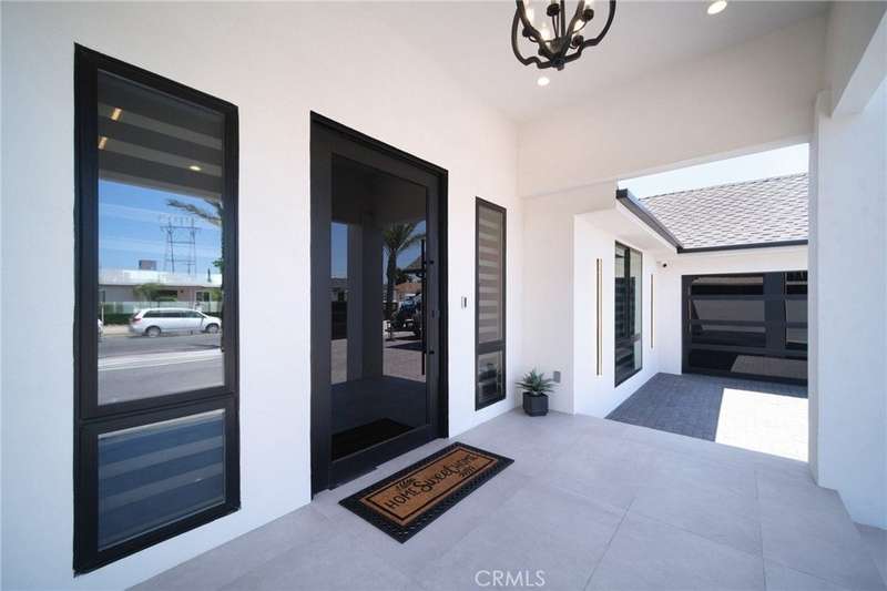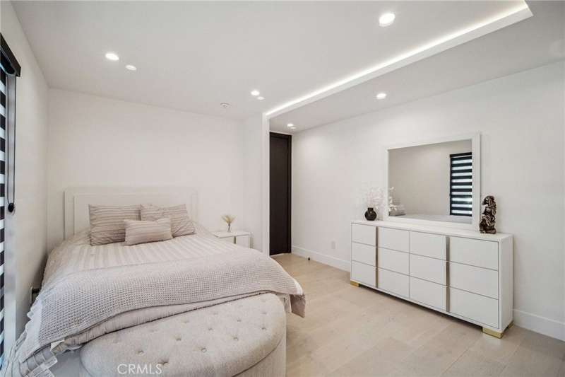 This bold European modern estate in North Hollywood is a true architectural statement. Privately gated and finished in crisp black-and-white tones with presidential roof shingles, it delivers immediate impact. A grand glass pivot door ushers you into an expansive 2,332 square foot open concept interior defined by custom tray ceilings, ambient LED strip lighting, recessed lighting, designer tile flooring, and minimalist infinity vents with integrated speakers seamlessly merging innovation and design. The custom chef’s kitchen features sophisticated two-tone cabinetry, a dramatic 12-foot waterfall island with extensive built-in storage, Taj Mahal countertops, a built-in stainless steel refrigerator, Miele appliances, and a disappearing pocket door for uninterrupted flow. The living room centers around an abstract fireplace wall with custom shelving and an electric fireplace. The wall extends beyond its frame with backlit LED detailing, creating a striking visual effect and an unforgettable centerpiece. The primary suite offers a private retreat, complete with a custom walk-in closet, spa-inspired bathroom, and full-height sliding glass doors that open to a verdant backyard sanctuary. Three bedrooms and three bathrooms including two en-suite configurations plus a thoughtfully designed powder room, are finished with warm wood floors and designer tilework throughout. The finished garage includes a half bathroom and a discreet laundry area. Both the front and back yards are meticulously designed with large-format modern pavers, mature palms, and lush landscaping, all enclosed with clean-lined fencing for enhanced privacy. The backyard evokes a resort-like atmosphere, featuring a shimmering pool, elevated spa, and a 615 square foot pool house designed for versatility and style. Highlighting the space is an impressive 7-panel, over-30-foot pocket door system that fully stacks at the final panel creating a seamless indoor-outdoor transition. The pool house also features bamboo-style tile in black and gray tones, a fully outfitted custom BBQ center, a full bathroom, and dedicated storage for outdoor essentials. Additionally, the property includes brand-new air conditioning and heating systems, two gas-powered Rinnai tankless water heaters—one serving the main residence and one for the pool house—and a newly installed roof. Refined, contemporary, and built to impress—this home redefines European modern living in the heart of North Hollywood.