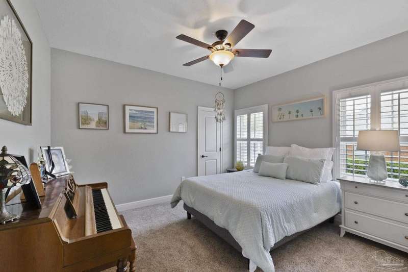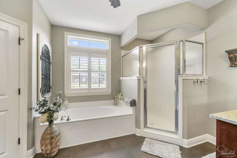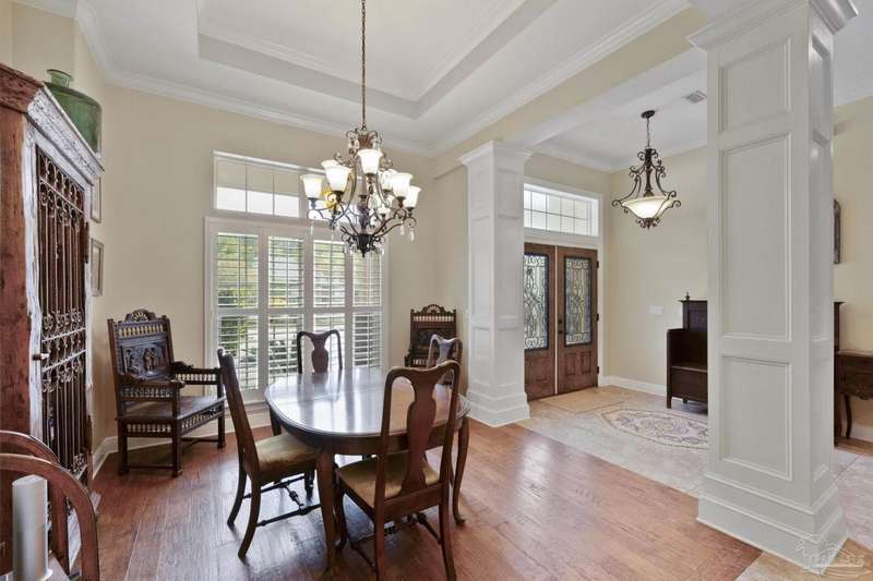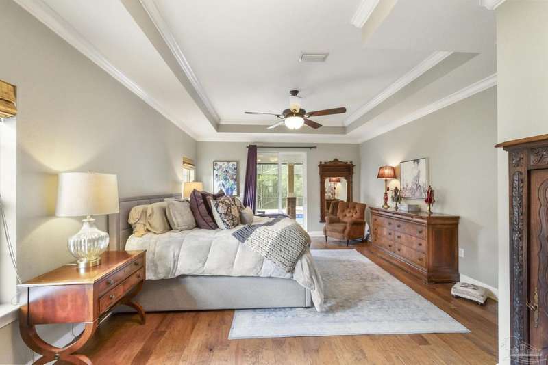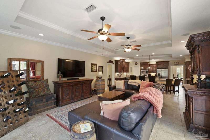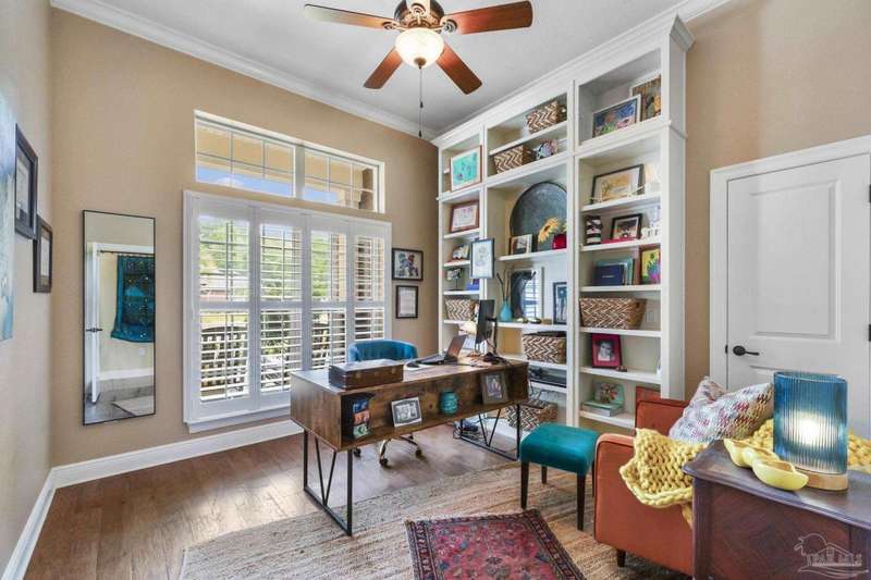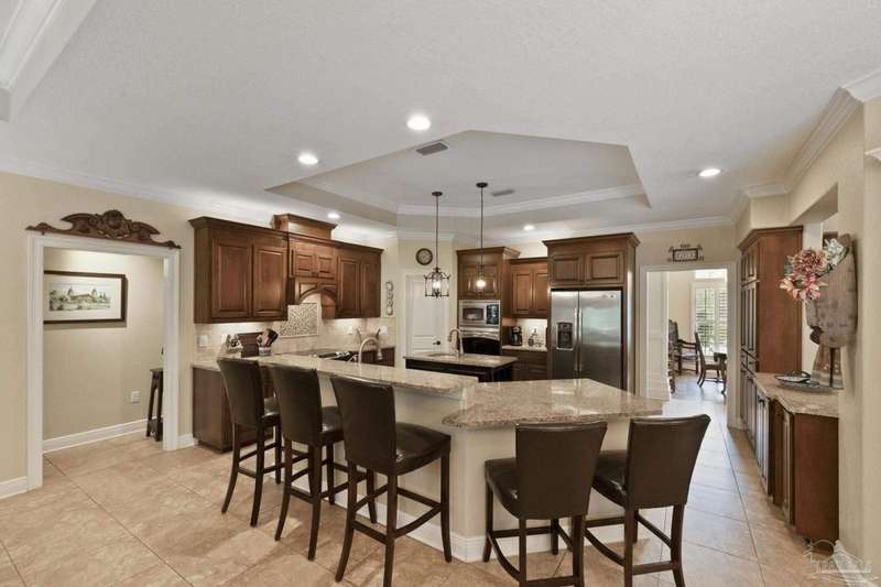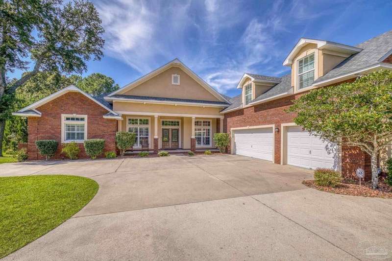 Brand new roof!! Step into elevated living in this custom-built pool home, ideally positioned on an oversized lot in one of the area's most distinguished golf course communities. A circular drive and charming front porch create a grand first impression, while inside, hardwood floors, custom tilework, and detailed millwork reflect thoughtful craftsmanship throughout. The kitchen is designed for both beauty and function, offering a large center island, double ovens, custom shelving, and generous bar seating-fantastic for casual dining or entertaining with ease. The main living area features a gas fireplace flanked by rich wood built-ins, creating a warm, sophisticated space. A separate study with its own built-ins provides the fantastic home office or quiet retreat. The luxurious primary suite offers a serene escape with tray ceilings, natural light, and a spa-style bath complete with a soaking tub, walk-in shower, and refined finishes. Outdoors, enjoy year-round relaxation with a screened-in pool and spa, a covered porch, and a newly updated pool bath accented by vibrant turquoise tile. With a brand new roof and recent 4-point inspection, this home is move-in ready and made for lasting enjoyment. Experience luxury, comfort, and community in one of the most desirable neighborhoods on the Gulf Coast.