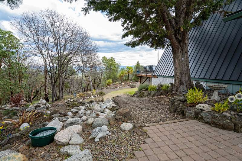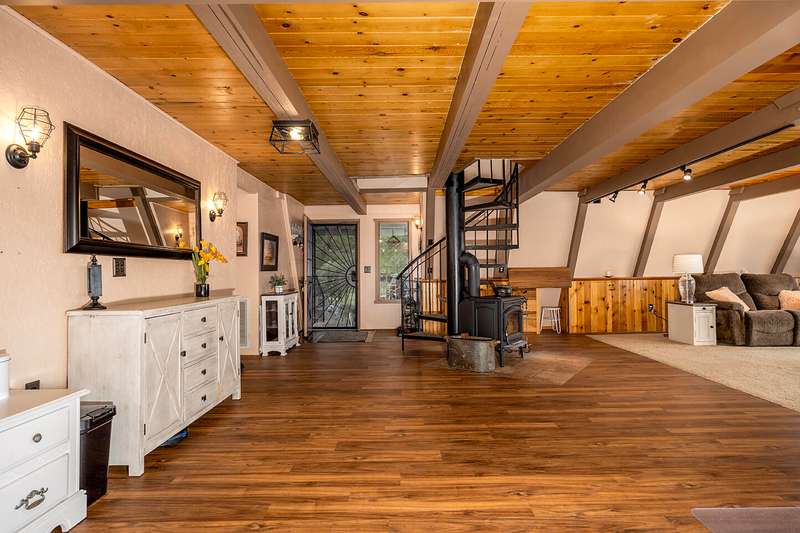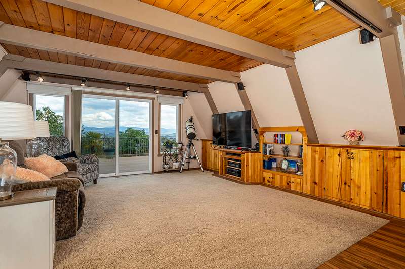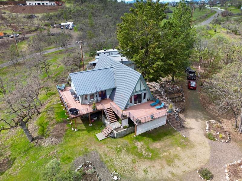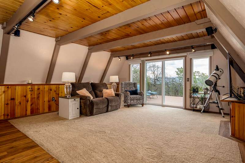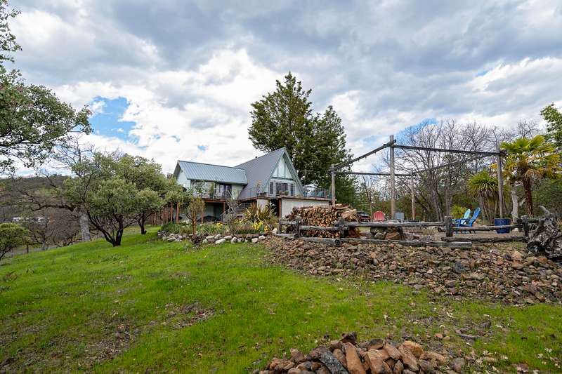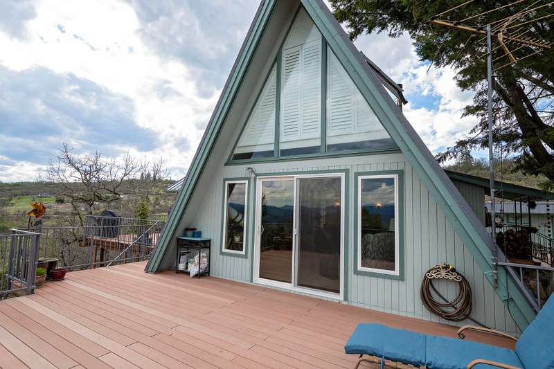 COUNTRY SETTING CITY CLOSE! This well maintained Gem is sitting on over 5 beautiful acres with stunning views from the large wrap around porch. It's a dream A-FRAME home featuring 3 bedrooms, 2 baths plus 367 sqft of additional finished basement space (above ground) with exterior access. The open concept center island kitchen offers newer cabinetry, ample storage, a pantry and plantation blinds. Main level: living room with built in cabinets to maximize space, new certified wood stove, primary bedroom, bathroom & laundry room. Two bedrooms up the spiral staircase plus walk in attic (bonus room) and second bathroom. Freshly painted exterior in 2024, new hybrid water heater installed in 2024, workshop area in garage, chicken coop, RV parking, a variety of trees & a seasonal creek + endless possibilities. You've got to tour this one of a kind, property in person.