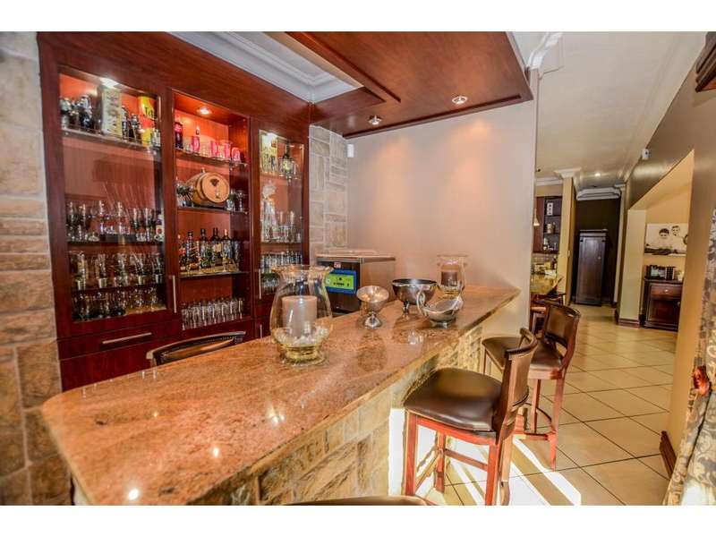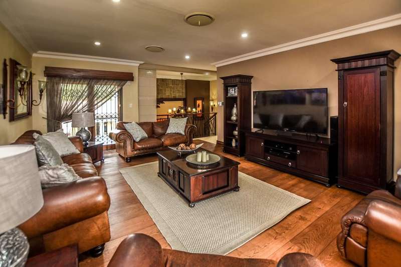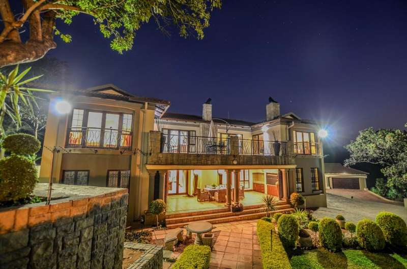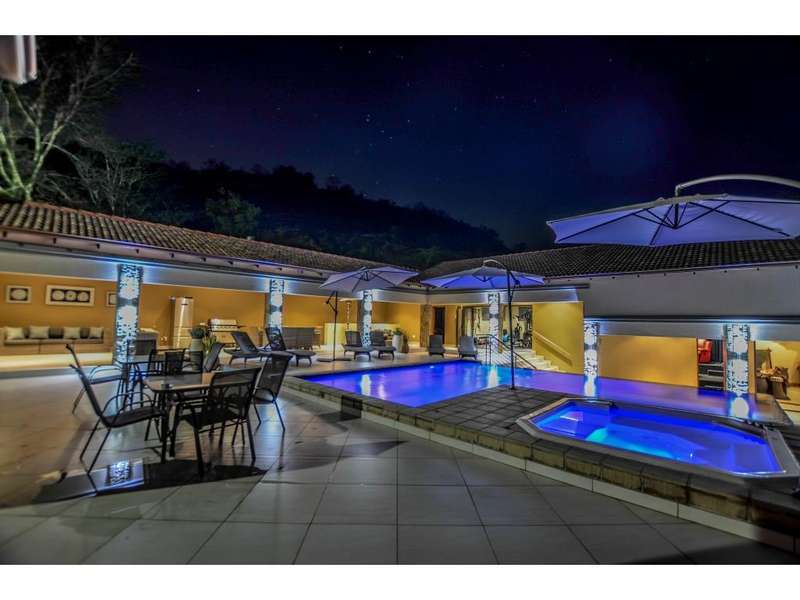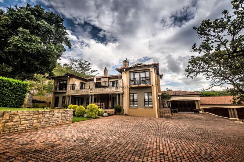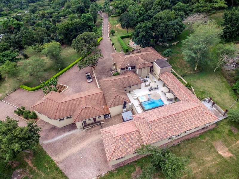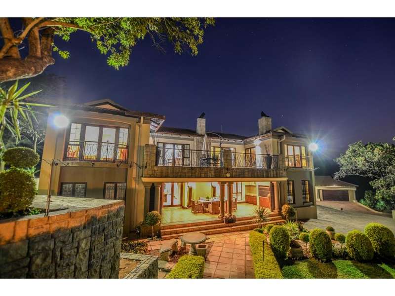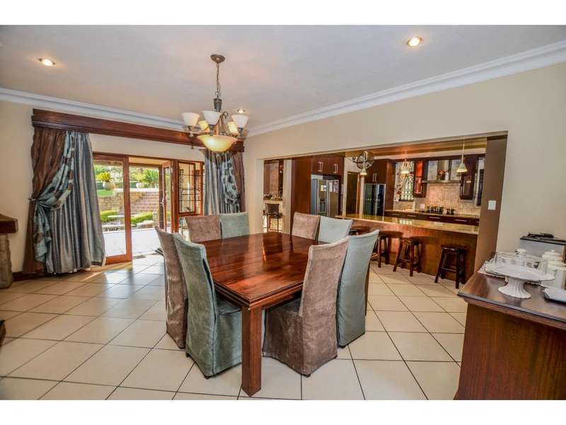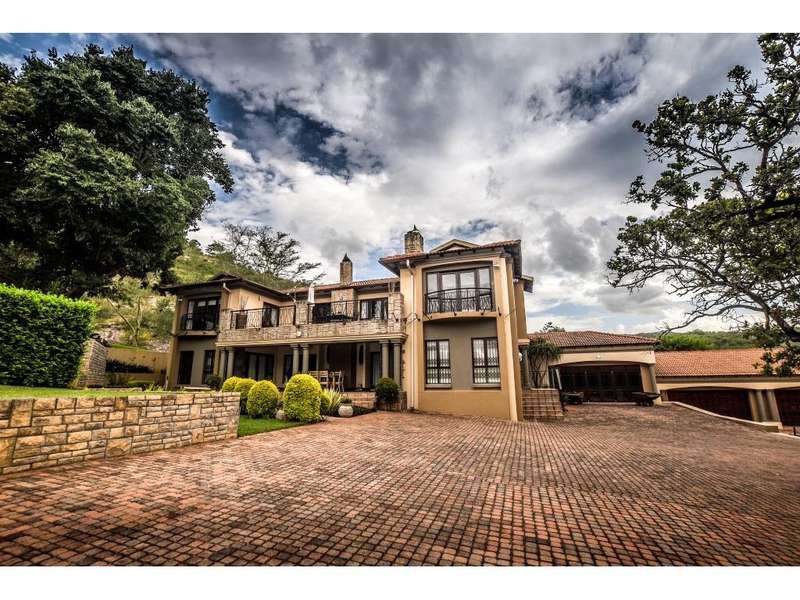 Nestled in the heart of the La Roi Estate on 4,1ha of virgin bush with panoramic views and roaming game, this stately mansion is designed with luxury, comfort and entertainment in mind. Graced with modern finishes throughout extra spacious living areas, 6 sunny bedrooms, air conditioned wine room and home gym. The gourmet kitchen boasts walk in refrigerator / freezer and custom granite tops allows for culinary pleasure. A magnificent 8 seater cinema room, feature pub, garaging for 10 cars and domestic facilities are beautifully complimented by a secure tiled inner courtyard with second swimming pool, large covered patio and built in braai/boma.