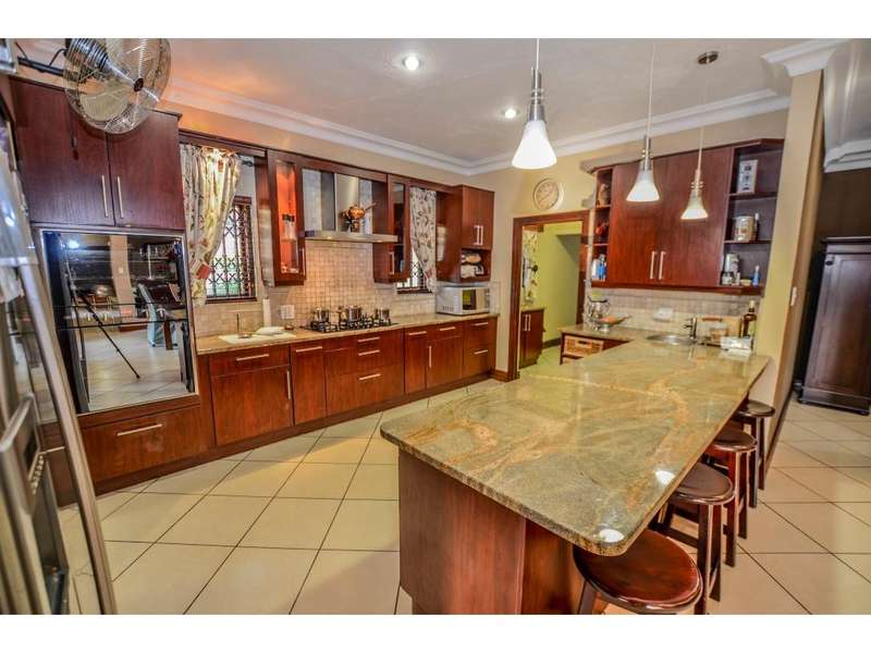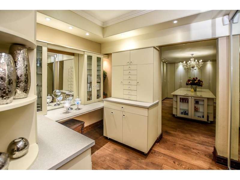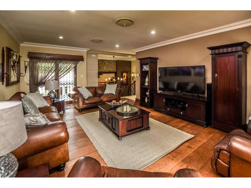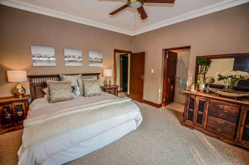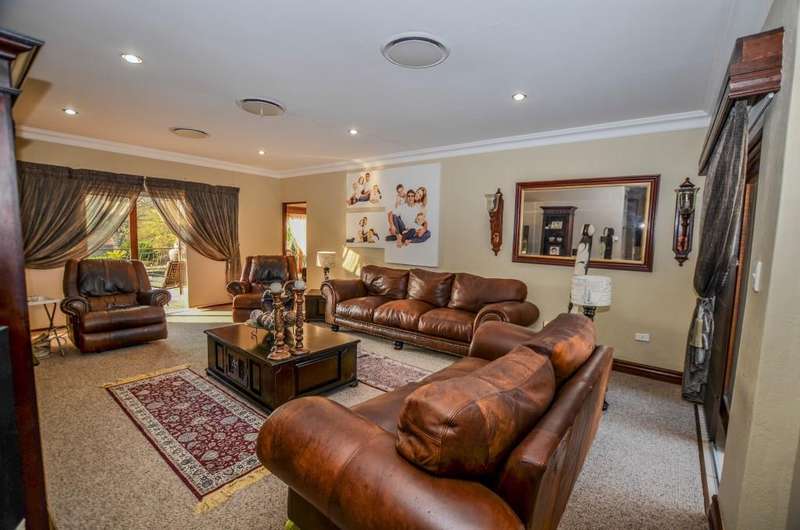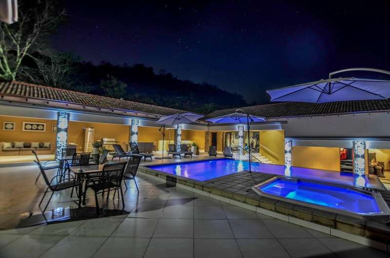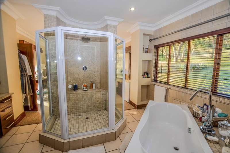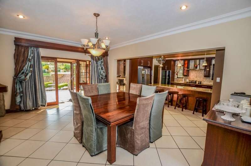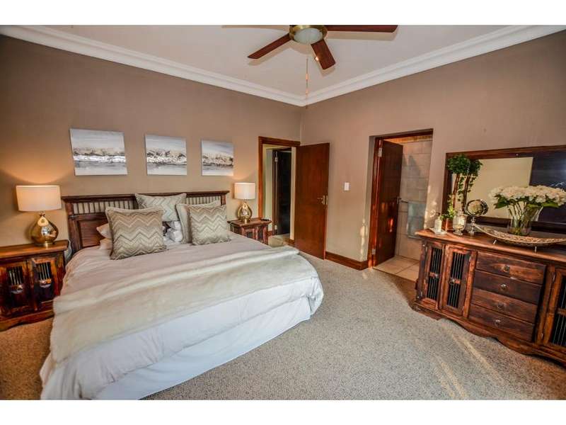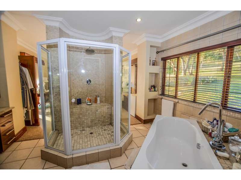 Nestled in the heart of the La Roi Estate on 4,1ha of virgin bush with panoramic views and roaming game, this stately mansion is designed with luxury, comfort and entertainment in mind. Graced with modern finishes throughout extra spacious living areas, 6 sunny bedrooms, air conditioned wine room and home gym. The gourmet kitchen boasts walk in refrigerator / freezer and custom granite tops allows for culinary pleasure. A magnificent 8 seater cinema room, feature pub, garaging for 10 cars and domestic facilities are beautifully complimented by a secure tiled inner courtyard with second swimming pool, large covered patio and built in braai/boma.