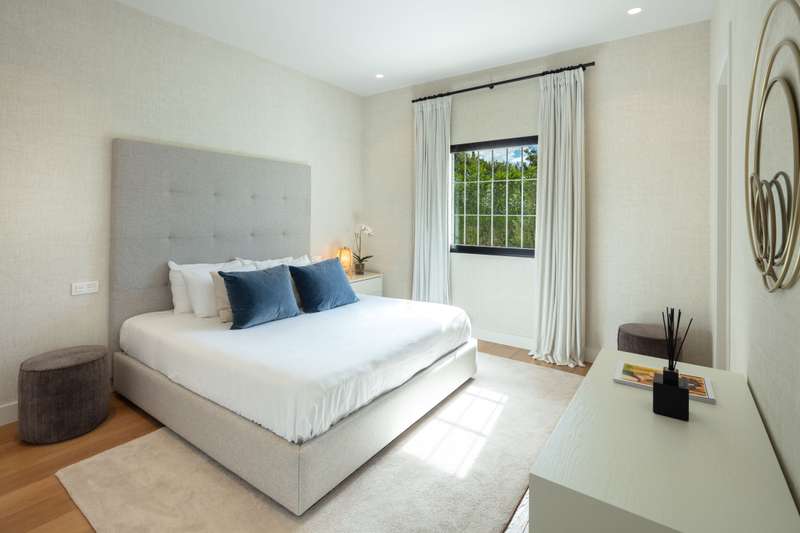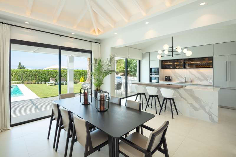 This stunning villa is waiting for you! Located in an exclusive gated community within walking distance of Los Naranjos Golf Club, this breathtaking villa seamlessly blends modern sophistication with timeless Andalusian charm. Designed for the ultimate indoor-outdoor lifestyle, the property features a traditional tiled roof while offering an exquisitely contemporary interior. Set on a southwest-facing plot, this single-level home is bathed in natural light from sunrise to sunset. A beautifully landscaped courtyard with a sculpted olive tree welcomes you, framed by floor-to-ceiling matte black colonial-style windows that invite the outdoors in. The open-plan living and dining area boasts a striking double-height pitched ceiling and a sleek fireplace, creating a warm and inviting atmosphere. A fully equipped modern kitchen with a breakfast bar flows seamlessly into the elegant dining space, while a separate utility room adds practicality. The master suite is a sanctuary of tranq