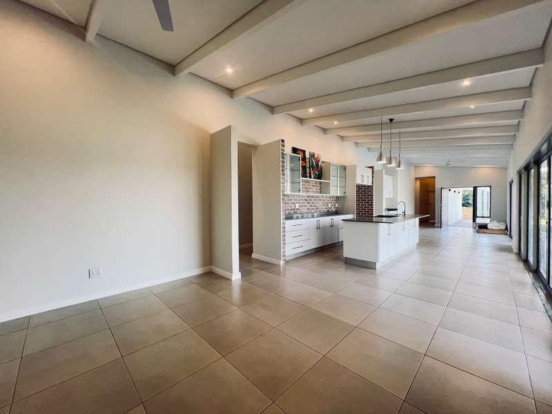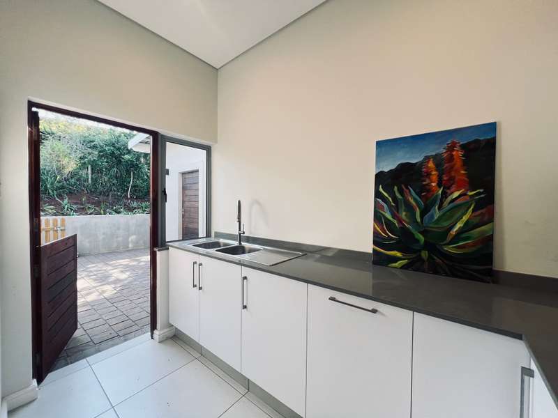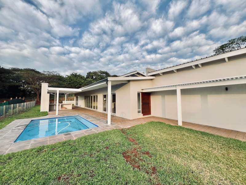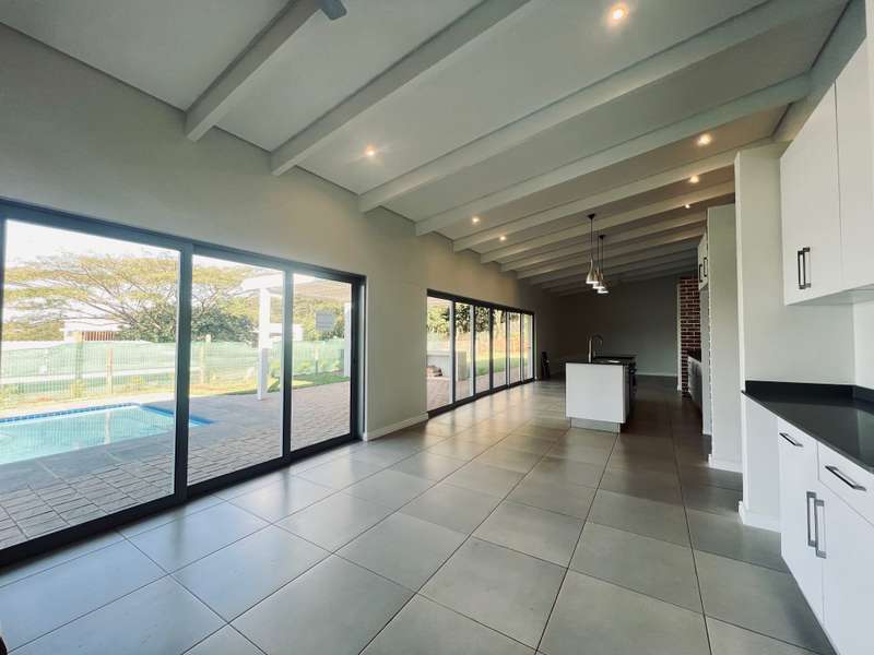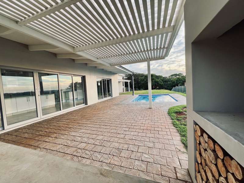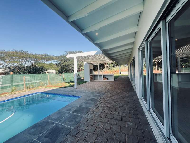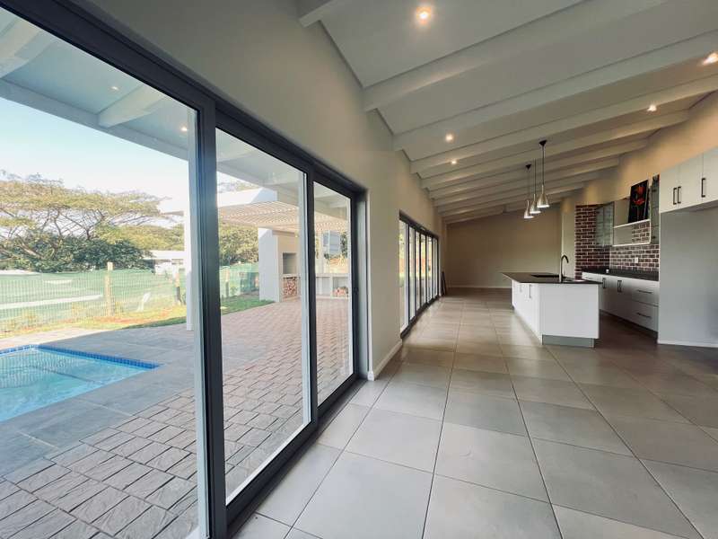 Own this modern 4-bedroom home with 4 en-suite bathrooms and a separate flat including a small kitchen and bathroom. The open-plan living areas feature the kitchen as the heart of this architecturally styled home, with continuous stacker doors offering beautiful views of the Umlalazi River and natural bush surroundings. The entertainment area includes a built-in braai and swimming pool, adding to the home's splendour. The fifth bedroom can serve as a separate guest room or staff quarters, complete with a kitchenette, bathroom, and its own carport. The Estate has restored the land to its natural beauty through the rehabilitation of local flora and fauna, with bird life particularly prolific, boasting over 300 recorded species. Enjoy safe outdoor entertainment with walking and cycling trails and picnic areas. Embrace the serene lifestyle offered by Zini River Estate, where modern living meets nature’s tranquility.