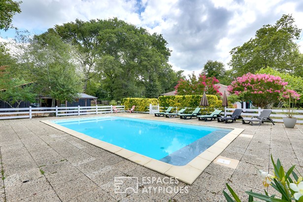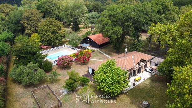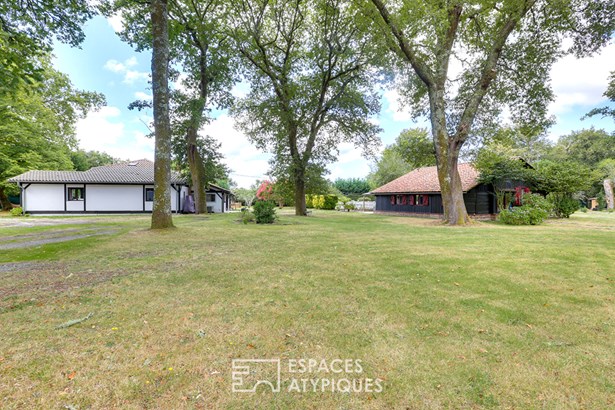 Set on a vast wooded plot of 6,778 m2, this estate consists of two independent single-story houses: a resolutely Landes-style main house with 169 m2 of living space and a renovated old barn of 91 m2, totaling eight bedrooms. A swimming pool, century-old oak trees and a petanque court complete this rare ensemble.