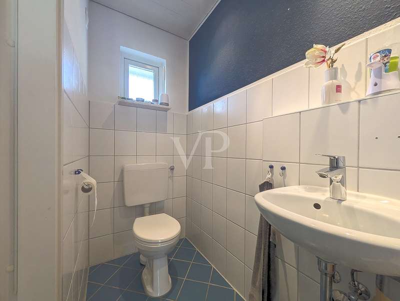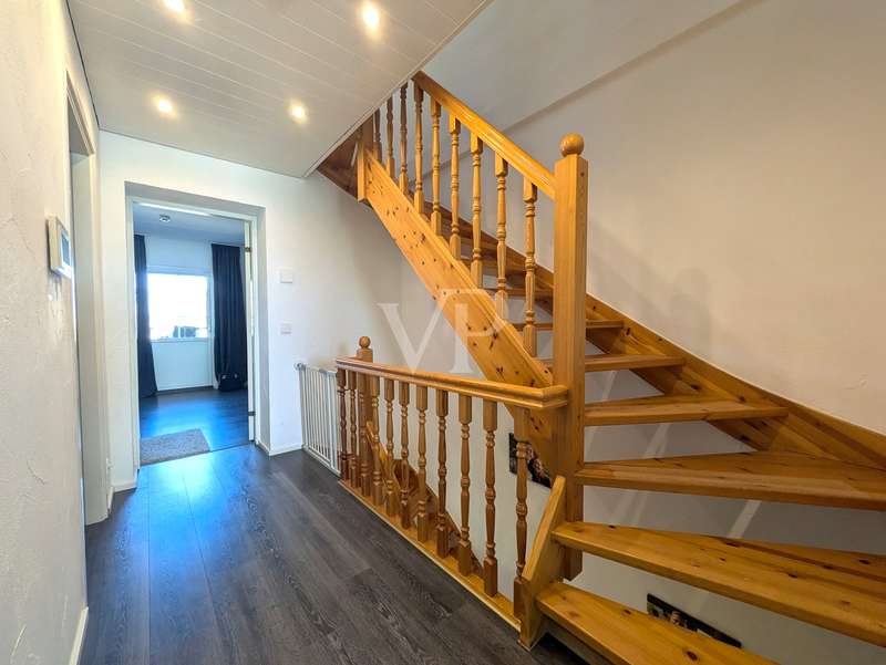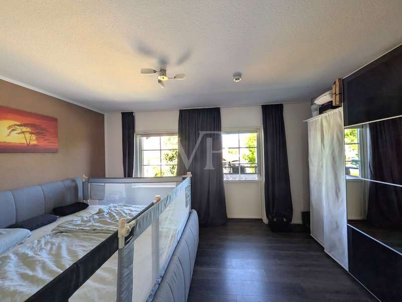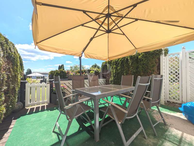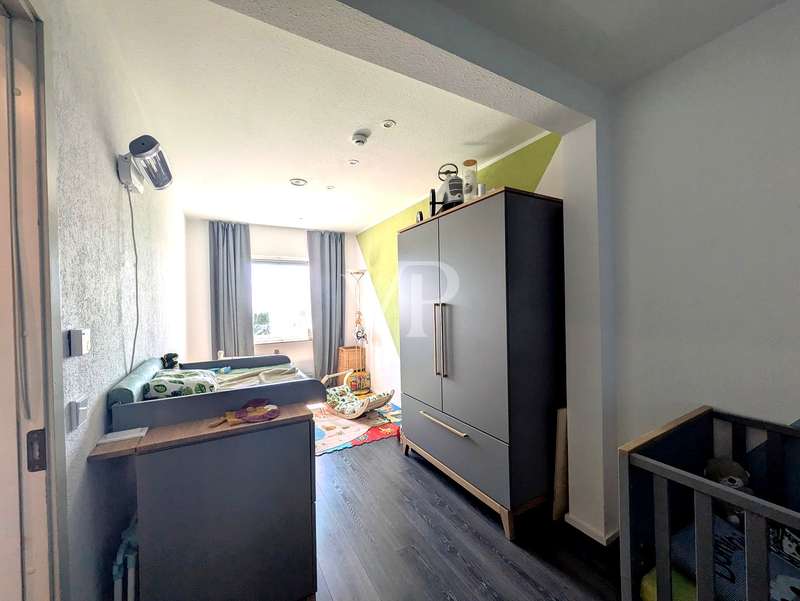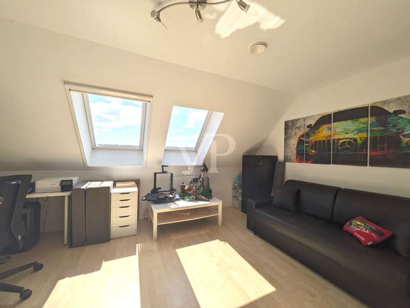 This attractive mid-terrace house offers modernized living comfort on approx. 142 m² of living space and is located on a plot of approx. 436 m². Built in 2000, the house is in a very well-kept condition and was last extensively modernized in 2023 and 2024 to meet today's standards. The house comprises a total of 6.5 rooms, including four bedrooms or studies, so there is enough space for a family with 3 children. Two well-equipped bathrooms provide additional space. The house's timber frame construction creates a pleasant indoor climate. On the first floor is the spacious living and dining area with access to the terrace and garden, which is ideal for cozy hours outdoors. A modern fitted kitchen, equipped with the latest appliances (stove from 2024, dishwasher from 2020), makes cooking a pleasure. On the 1st floor are the master bedroom and one of the children's bedrooms, as well as the main bathroom with shower cubicle and bathtub. There is also a utility room here, which offers practical storage space. On the top floor, there are two further rooms that can be used as a children's room, guest room or study, as well as another bathroom. The continuous staircase leads to the top floor of the house, where not only objects can be stored, but where the infrared cabin is also located as a retreat for moments of well-being. A particular highlight of the house is the comprehensive energy modernization. In 2023, a photovoltaic system with battery storage and emergency power function was installed, which, together with the newly installed wall box for electric vehicles, ensures sustainable energy use. The air heat pump installed in 2024 complements this concept. The new clay tile roof in 2023 rounds off the measures to improve energy efficiency. The house offers a consistently comfortable indoor climate thanks to the intelligent air circulation system and ventilation in every room. The modern smart home heating system allows the room temperature to be controlled conveniently and efficiently. Other features include the double-glazed wooden windows, which have been replaced by plastic windows on the top floor, and the insulated basement ceiling. The house also has two functional cellar rooms that offer additional storage space. The house comes with a registered outdoor parking space for your car. Two further vehicles can be parked in front of the house on the property. The well-kept garden, which adjoins the terrace area, offers plenty of space for leisure activities and relaxation. A garden shed is available for storing your garden furniture and equipment. The outdoor area is very well maintained and offers a variety of design options. Overall, this property is ideal for families who value modern and sustainable living. The combination of a well thought-out room layout and technical features makes the house an attractive home. Interested parties are cordially invited to discover this well-kept mid-terraced house and experience its benefits for themselves. Please do not hesitate to contact us for further information or to arrange a viewing appointment.