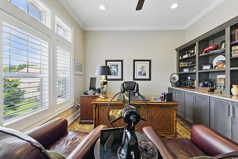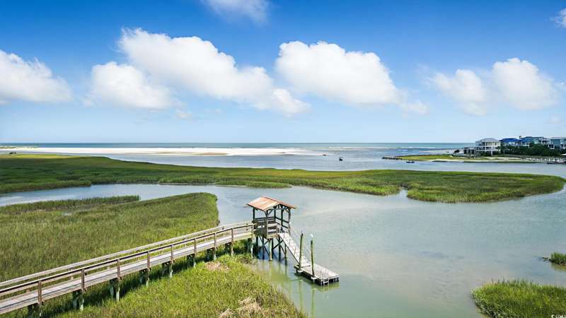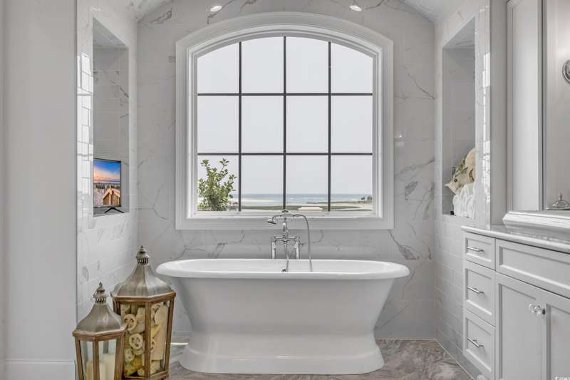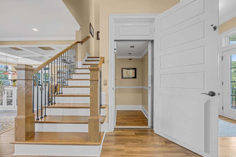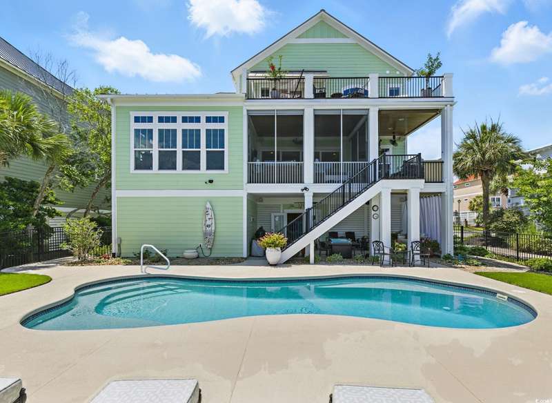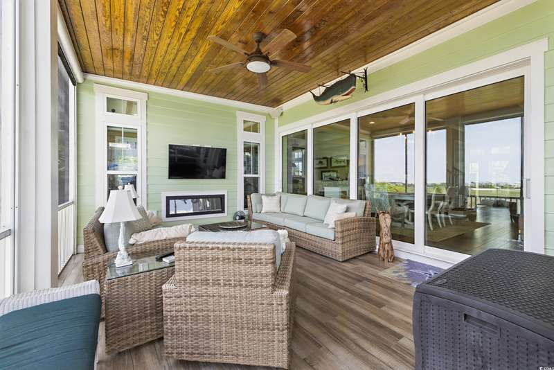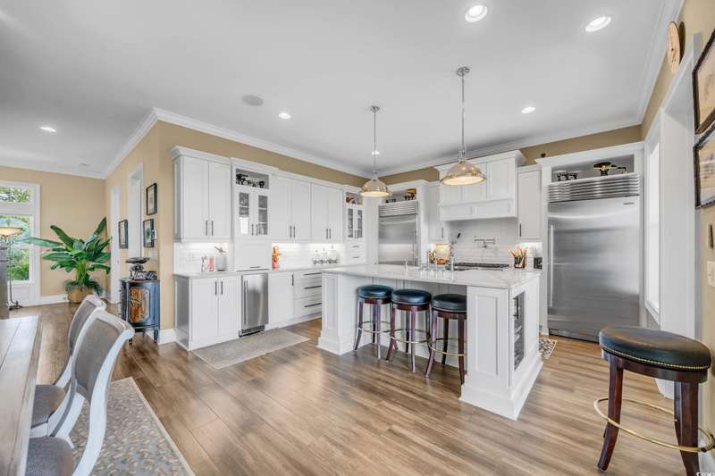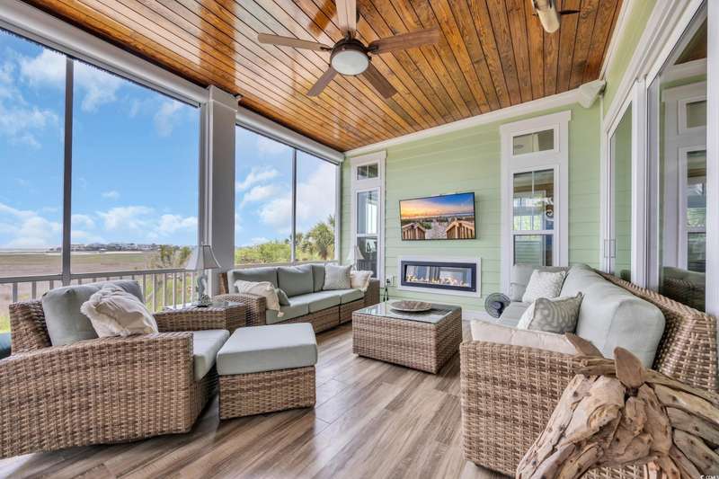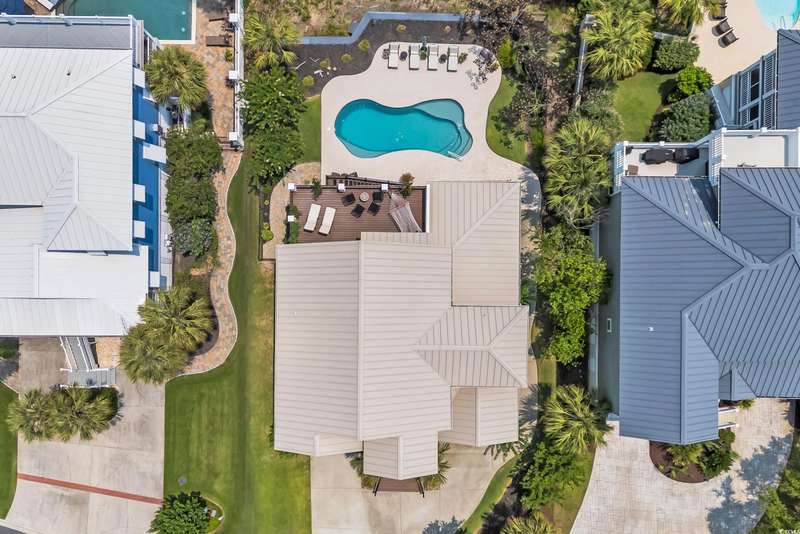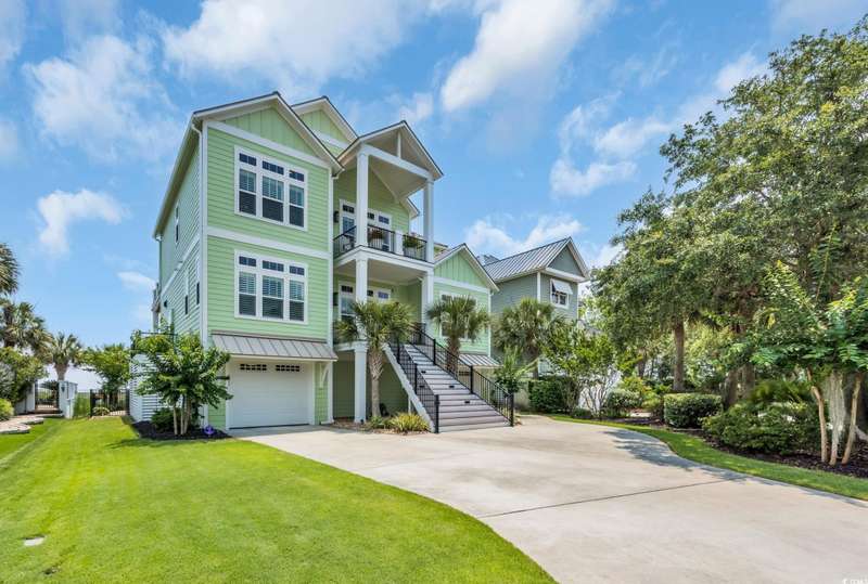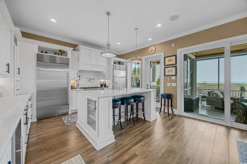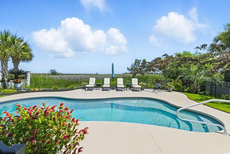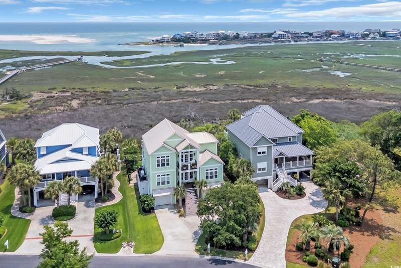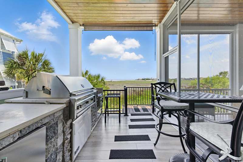 Discover breathtaking views of the creek, marshlands, and shimmering Atlantic from this custom-built luxury residence, crafted in 2019 to exacting standards, offering a harmonious blend of timeless design and cutting-edge engineering. Every element was designed with both elegance and functionality in mind, from the hurricane-rated windows and complete “spray foam insulation” to the whole-home dehumidifier integrated with the air conditioning system and whole-house Generac Guardian generator for total peace of mind. From nearly every vantage point, the scenery stretches outward in a panoramic display of coastal splendor, inviting natural beauty into the everyday experience. Arriving guests are welcomed by a dramatic sweeping staircase and a spacious foyer that sets a tone of elegance and scale. Ten-foot ceilings, eight-foot solid doors, and richly hued wood-look ceramic tile flooring define the home’s craftsmanship, while plantation shutters and fine architectural details enhance the aesthetic throughout. A beautifully appointed elevator servicing all three floors, Sonos surround sound to most rooms and outdoors, and a top-tier alarm system provide comfort and connectivity. At the heart of the home, the chef’s kitchen is a masterpiece—Anchored by a 36" Wolf six-burner gas range, an essential pot filler and custom vent hood, the kitchen features a Sub-Zero 36" refrigerator, a matching 36" Sub-Zero freezer with an ice maker, dual KitchenAid dishwashers, a Scotsman nugget ice maker with filter, and InSinkErator hot water dispenser. The stunning quartz countertops covering all surfaces, custom cabinetry with built-in drawer organizers and pull-out shelves, and a separate bar sink add to the kitchen’s luxury and utility. A generous dining area and quartz topped built-in buffet smoothly transition into the indoor and outdoor living areas, perfect for seamless entertaining. Telescopic sliding glass doors open to the spacious screened porch offering an all-season retreat with electric fireplace, retractable shade, and TV connection—positioned to take full advantage of the unforgettable views. Beautiful tile flooring and wood paneled ceiling extend onto the adjacent outdoor kitchen and dining deck. World class cooking on the Stainless Steel Lynx 48” built-in gas grill with Lynx side burners brings many relaxing, and delicious, evenings on the porch, enjoying the views and ocean breezes. The living room, adorned with a large stone fireplace, custom built-ins and elegant coffered ceiling, flows naturally into the game room, complete with a tray ceiling, floor to ceiling windows, featuring designer Meyda Tiffany lighting and a Brunswick Montebello pool table. The first floor also offers two guest suites, both with wonderfully finished full baths, one ensuite and one semi-private. All bathrooms in the main house are finished with frameless glass showers and vessel sinks, maintaining the refined design throughout. Upstairs, the primary suite is a sanctuary unto itself, with sliding glass doors opening to a private deck where the spectacular coastal vista becomes your morning backdrop. The spacious custom closet accommodates both owner’s belongings, with even more hidden storage attached. The en-suite bath features a freestanding cast iron soaking tub, perfectly placed beneath a large scenic window, a huge walk-in shower with dual showerheads and beautiful cabinetry. An elegant office with custom cabinetry and granite countertops provides an inspiring workspace. The well-appointed laundry room and lovely front balcony complete the second floor. The home’s exterior impresses with a metal roof, Hardie Plank siding, Trex decking on all decks & stairs, and Cool Step-coated surfaces on the pool deck. Whether lounging in sun-drenched serenity or entertaining alfresco, the sweeping water views elevate every moment. A truly spectacular home with a front-row seat to the natural beauty of coastal Carolina