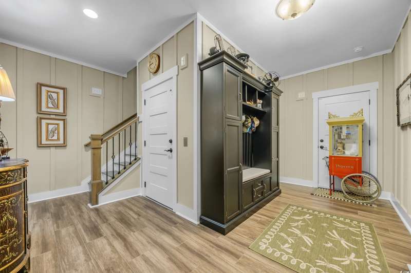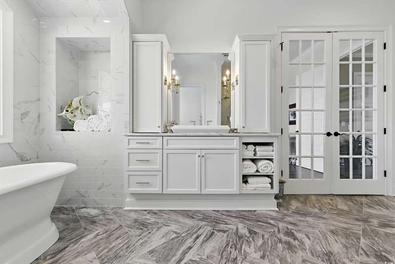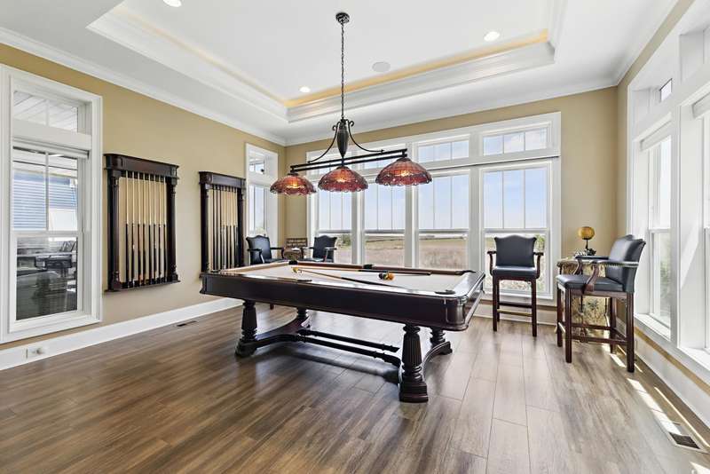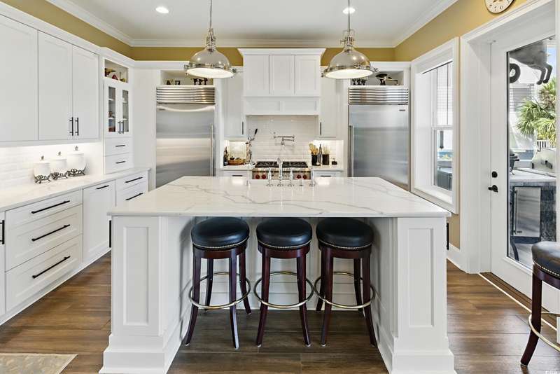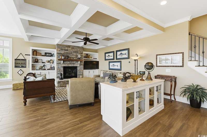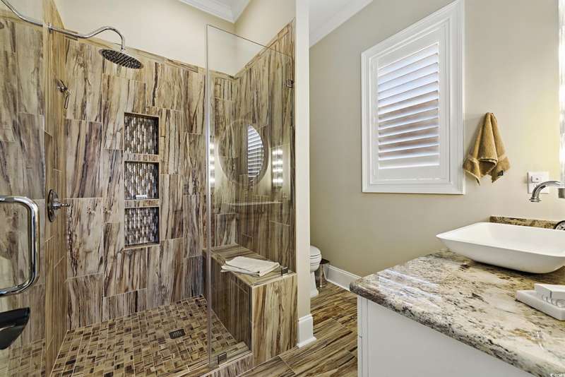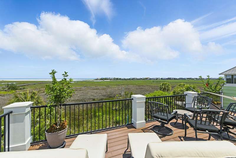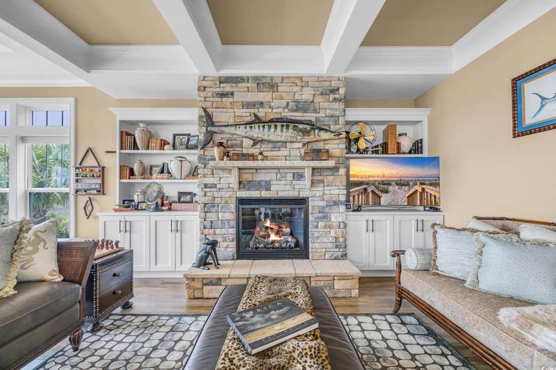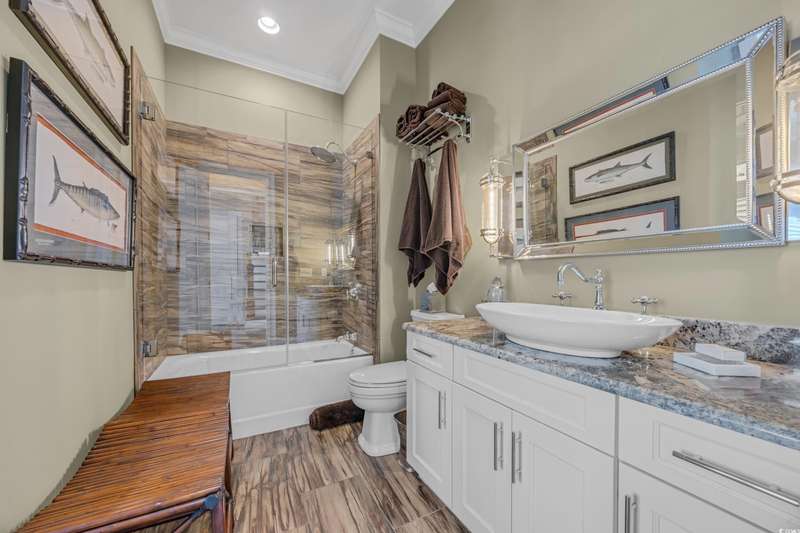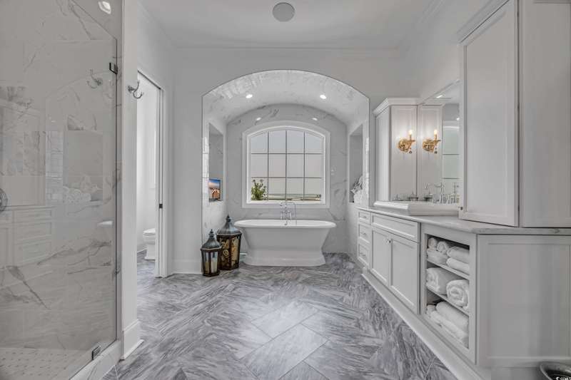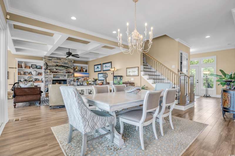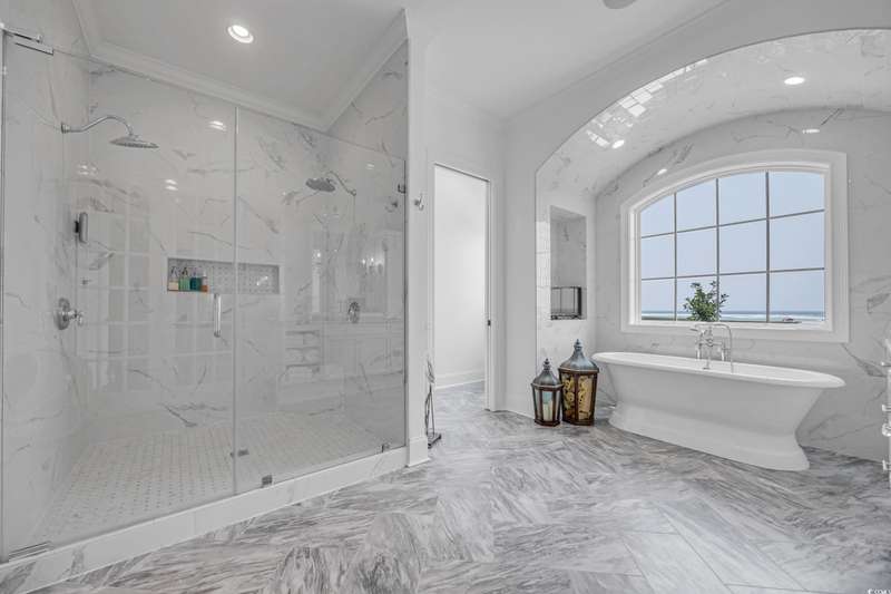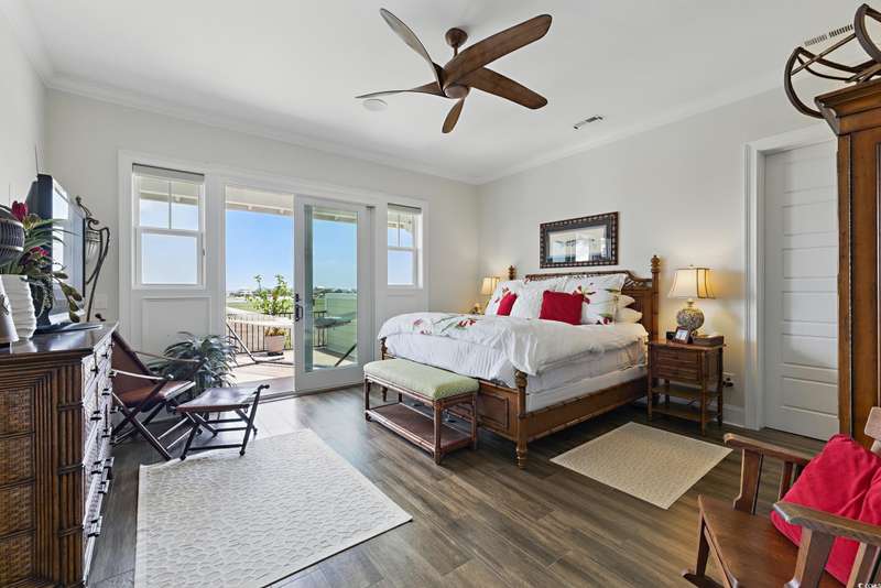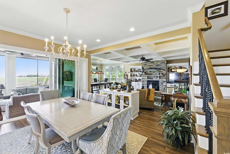 Discover breathtaking views of the creek, marshlands, and shimmering Atlantic from this custom-built luxury residence, crafted in 2019 to exacting standards, offering a harmonious blend of timeless design and cutting-edge engineering. Every element was designed with both elegance and functionality in mind, from the hurricane-rated windows and complete “spray foam insulation” to the whole-home dehumidifier integrated with the air conditioning system and whole-house Generac Guardian generator for total peace of mind. From nearly every vantage point, the scenery stretches outward in a panoramic display of coastal splendor, inviting natural beauty into the everyday experience. Arriving guests are welcomed by a dramatic sweeping staircase and a spacious foyer that sets a tone of elegance and scale. Ten-foot ceilings, eight-foot solid doors, and richly hued wood-look ceramic tile flooring define the home’s craftsmanship, while plantation shutters and fine architectural details enhance the aesthetic throughout. A beautifully appointed elevator servicing all three floors, Sonos surround sound to most rooms and outdoors, and a top-tier alarm system provide comfort and connectivity. At the heart of the home, the chef’s kitchen is a masterpiece—Anchored by a 36" Wolf six-burner gas range, an essential pot filler and custom vent hood, the kitchen features a Sub-Zero 36" refrigerator, a matching 36" Sub-Zero freezer with an ice maker, dual KitchenAid dishwashers, a Scotsman nugget ice maker with filter, and InSinkErator hot water dispenser. The stunning quartz countertops covering all surfaces, custom cabinetry with built-in drawer organizers and pull-out shelves, and a separate bar sink add to the kitchen’s luxury and utility. A generous dining area and quartz topped built-in buffet smoothly transition into the indoor and outdoor living areas, perfect for seamless entertaining. Telescopic sliding glass doors open to the spacious screened porch offering an all-season retreat with electric fireplace, retractable shade, and TV connection—positioned to take full advantage of the unforgettable views. Beautiful tile flooring and wood paneled ceiling extend onto the adjacent outdoor kitchen and dining deck. World class cooking on the Stainless Steel Lynx 48” built-in gas grill with Lynx side burners brings many relaxing, and delicious, evenings on the porch, enjoying the views and ocean breezes. The living room, adorned with a large stone fireplace, custom built-ins and elegant coffered ceiling, flows naturally into the game room, complete with a tray ceiling, floor to ceiling windows, featuring designer Meyda Tiffany lighting and a Brunswick Montebello pool table. The first floor also offers two guest suites, both with wonderfully finished full baths, one ensuite and one semi-private. All bathrooms in the main house are finished with frameless glass showers and vessel sinks, maintaining the refined design throughout. Upstairs, the primary suite is a sanctuary unto itself, with sliding glass doors opening to a private deck where the spectacular coastal vista becomes your morning backdrop. The spacious custom closet accommodates both owner’s belongings, with even more hidden storage attached. The en-suite bath features a freestanding cast iron soaking tub, perfectly placed beneath a large scenic window, a huge walk-in shower with dual showerheads and beautiful cabinetry. An elegant office with custom cabinetry and granite countertops provides an inspiring workspace. The well-appointed laundry room and lovely front balcony complete the second floor. The home’s exterior impresses with a metal roof, Hardie Plank siding, Trex decking on all decks & stairs, and Cool Step-coated surfaces on the pool deck. Whether lounging in sun-drenched serenity or entertaining alfresco, the sweeping water views elevate every moment. A truly spectacular home with a front-row seat to the natural beauty of coastal Carolina