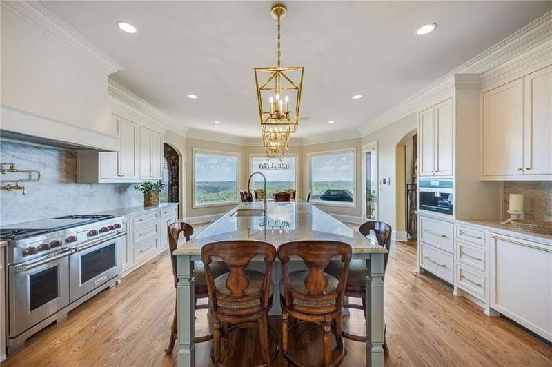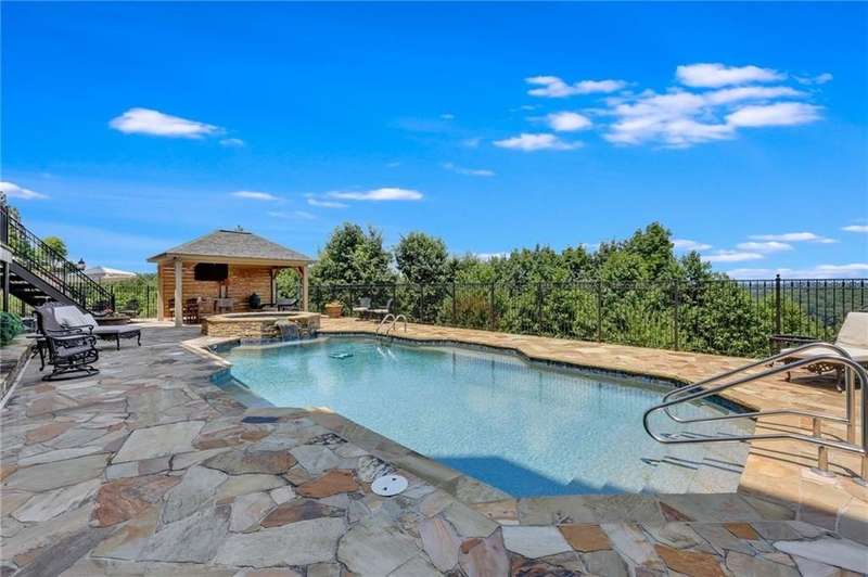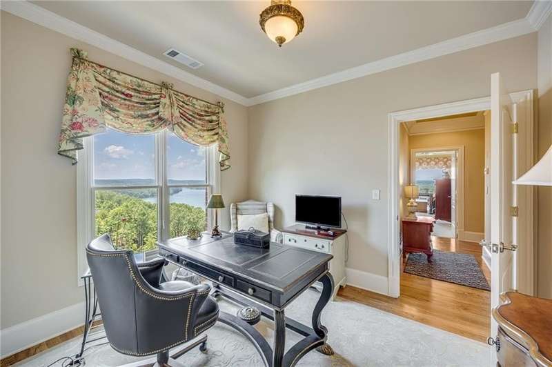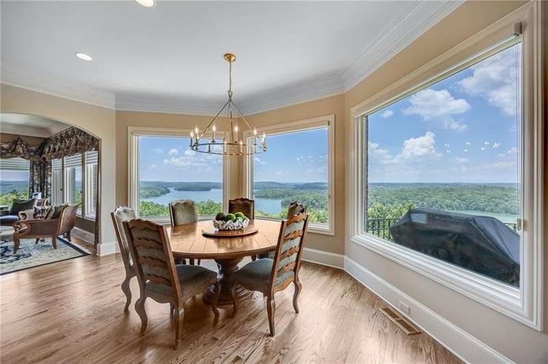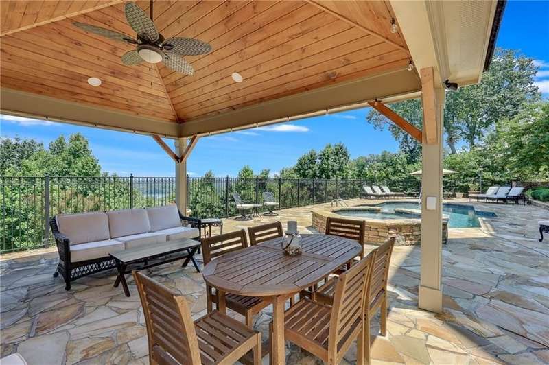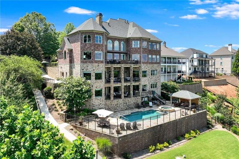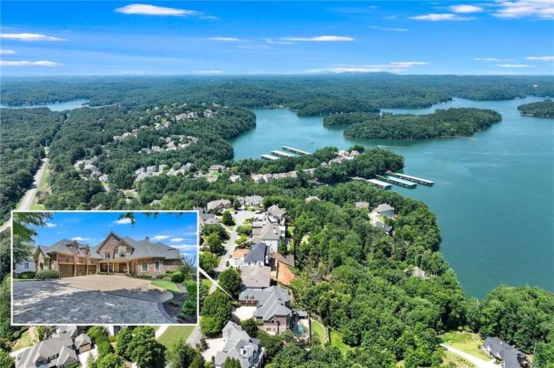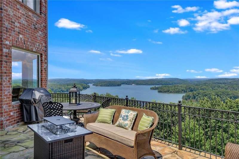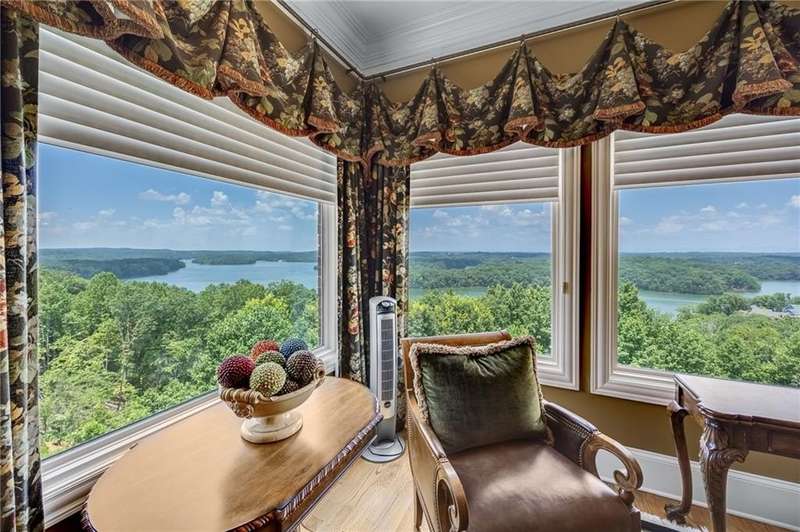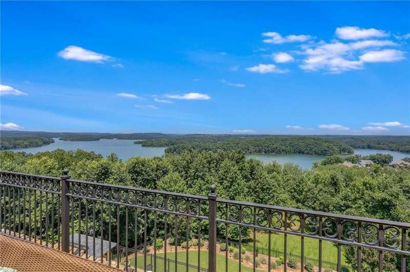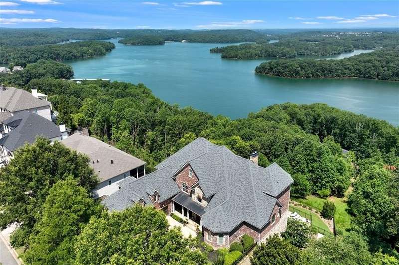 Harbour Point Yacht Club and Marina! A rare opportunity to own a truly exceptional Lake Lanier estate, offered fully furnished with elegant, high-end pieces and ideally positioned on one of the most desirable lots on the lake. Located within the prestigious, gated Harbour Point Yacht Club and Marina community, this custom-built home showcases sweeping sunset views over Lake Lanier and the Blue Ridge Mountains from three expansive verandas. Designed with both luxury and lifestyle in mind, this four-level estate features an elevator, two home offices, and a heated pool and spa. A deeded boat slip is included, offering seamless access to lakefront living. The main level welcomes you with a grand two-story foyer and living room, formal study, and refined dining room. A brand-new custom chef's kitchen is outfitted with a 60" Wolf range with double ovens, Sub-Zero refrigerator, Miele coffee station, and an oversized walk-in pantry. The cozy keeping room features a stone fireplace, and the spacious primary suite includes a spa-like bath and newly designed California Closets. The terrace level is an entertainer's dream, complete with a wine cellar and tasting room, full kitchen and bar, gathering room with fireplace, 10-seat home theater, steam shower, sauna, and private guest suite. The lower poolside level adds even more space for entertaining with a second full kitchen, additional ensuite, gathering room, game room, and fitness room-all opening to the pool and landscaped, fenced backyard. Additional features include a three-car garage plus a dedicated Harley garage, a newly resurfaced pool with cabana, and numerous recent upgrades including a Crestron Smart Home system, updated irrigation, fire sprinkler and security systems, and tankless hot water.