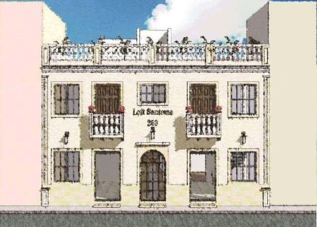 The total area of the 4-level building is 400 square meters. 3 enclosed levels plus roof terrace include two front-facing commercial units, two interior multi-use commercial spaces, and two small apartments.