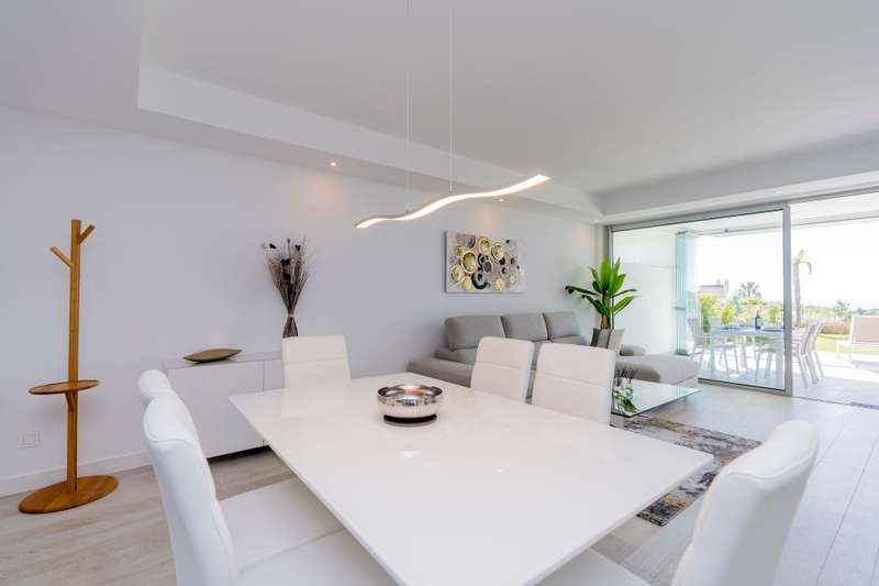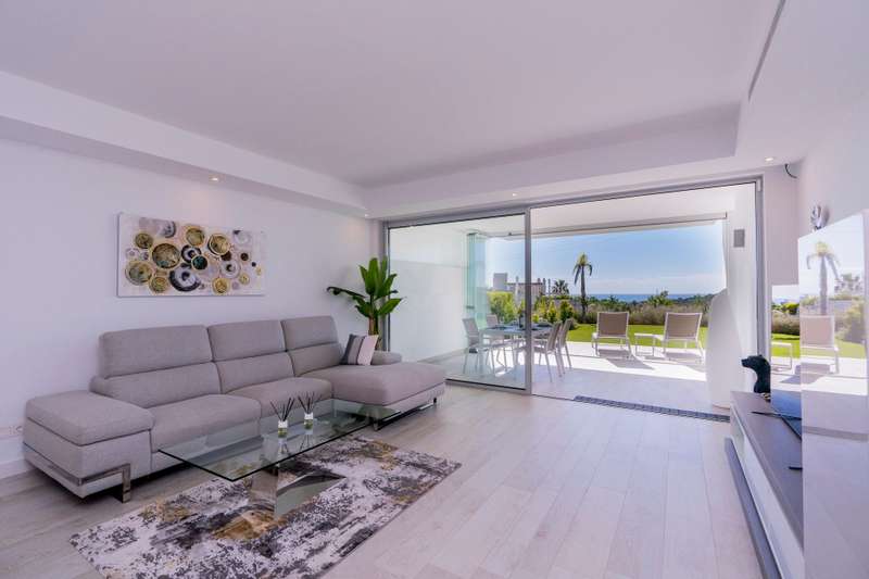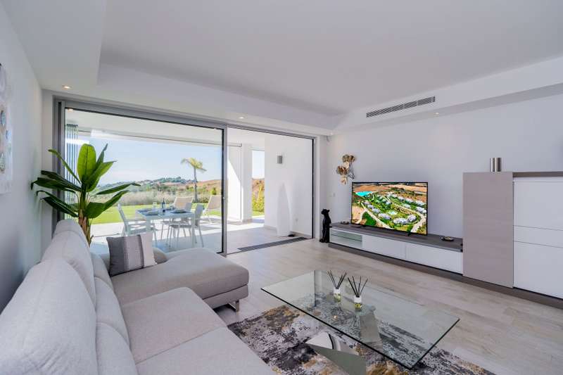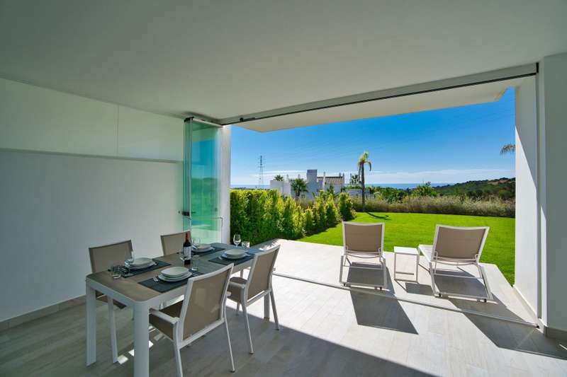 Located near Estepona Golf, in the Alcazaba Lagoon development in Casares, within easy reach of shops, restaurants, schools, and leisure facilities. On the western edge of the Costa del Sol a jewel in the heart of the Costa del Sol that combines the tranquillity and beauty of its natural surroundings with the exclusivity and convenience of living close to the vibrant cities of Marbella and Estepona. Although the development is located in the municipality of Casares, it is only 7 kilometres from the centre of Estepona and easily accessible via Malaga International Airport and Gibraltar. This stylish and modern ground floor apartment comes fully furnished and includes a contemporary kitchen equipped with high-end appliances. It is well distributed and is bright and sunny due to its south facing orientation. Marble flooring, double glazing, fitted wardrobes, and air conditioning enhance the comfort and elegance of the apartment. Glass curtains have been fitted to fully benefit from the l
