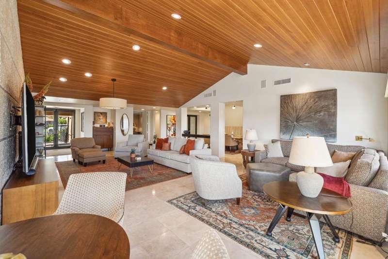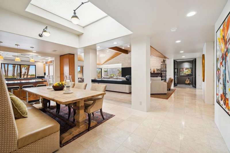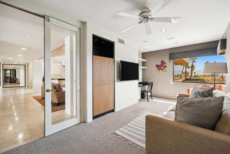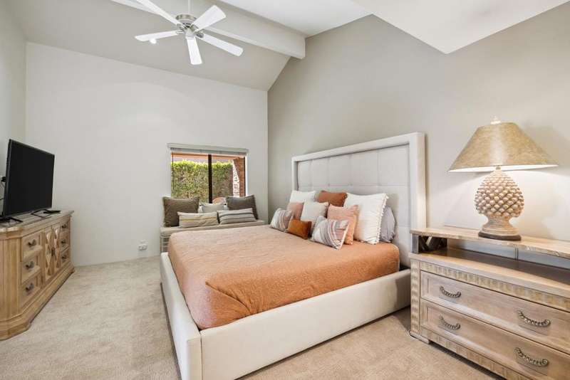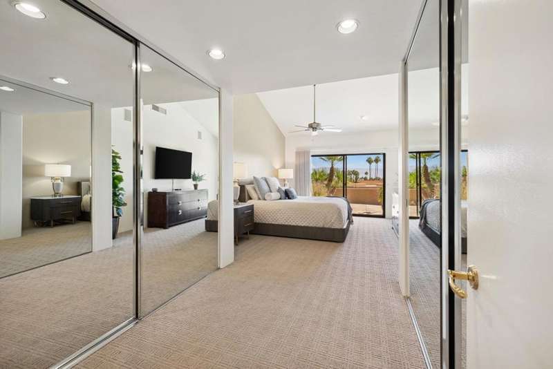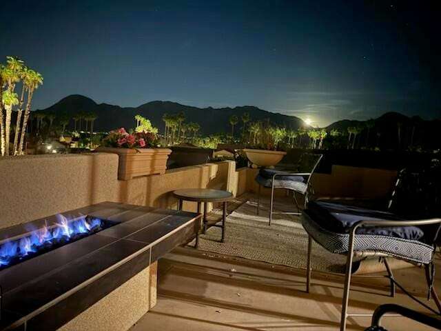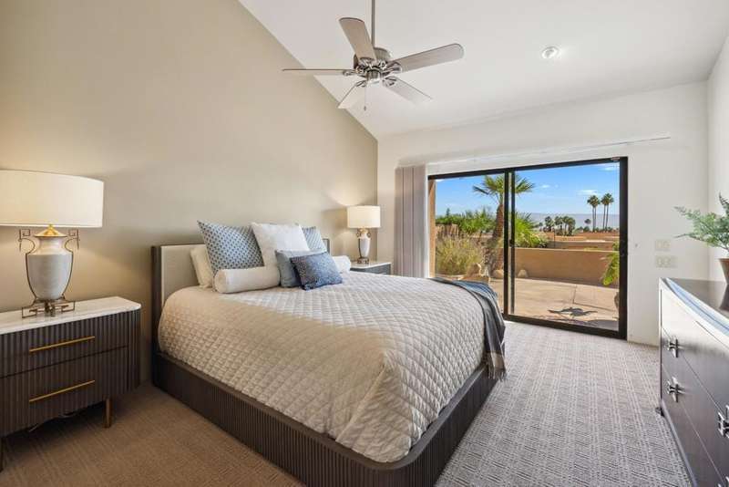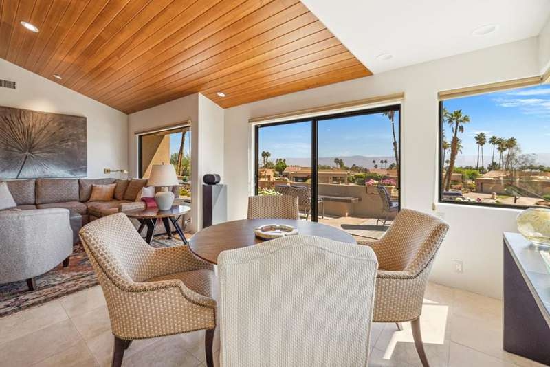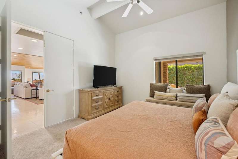 Exceptional Detached Condo, Skyview Villa Plan, 2,439 sq. ft., situated on an elevated lot stunning views, 2 primary bedrooms that have private bathrooms. Bedroom 3 is currently set up as a bonus room (pictures 31-35) with a soon to be operable size window (operable window on order) with a closet. There is ample natural light that offers the elegance and privacy ideal for a thrid bedroom/guest room, study, or serene personal escape with beautiful mountain views. Main primary suite offers direct patio access, two generous closets, and a newly remodeled en-suite bathroom.This beautifully appointed villa offers timeless design, exceptional finishes, and a highly desirable floor plan. Enjoy panoramic views of Eisenhower Mountain to the East, dramatic North-facing vistas of the mountains and sparkling city lights at night, Western skies that capture every desert sunset.Enter through elegant double glass doors into a spacious, expanded entryway. The great room features a soaring wood-paneled vaulted ceiling, a dramatic decorative stone fireplace, and custom windows that bring the desert's ever-changing light into the heart of the home. The expansive patio offers the perfect place to enjoy the serenity of sunrise and sunsets with, spectacular moonrises, and everything in between. The thoughtfully designed living room includes multiple seating areas, ideal for both intimate gatherings and large-scale entertaining. Additional highlights include a temperature-controlled wine room, two-car garage plus a dedicated golf cart garage.Furniture and Golf cart with lithium batteries are for sale outside of purchase prince. Ironwood Country Club is one of the most sought-after private clubs in the Coachella Valley, offering two 18-hole golf courses, a state-of-the-art Fitness Center, tennis and pickleball courts, a full-service spa, and a welcoming social atmosphere. Membership is by application and sponsorship. This is a rare opportunity to own a truly special home in one of the desert's premier communities.