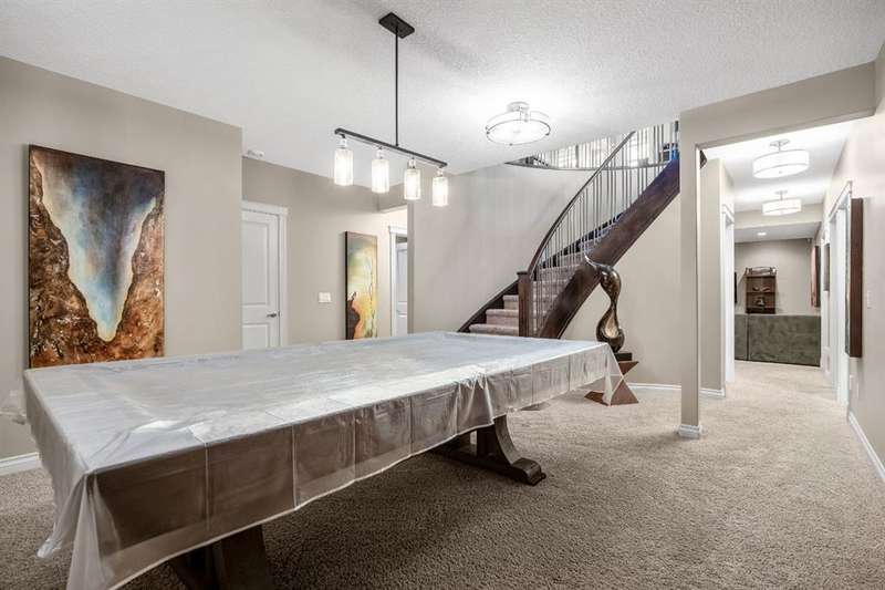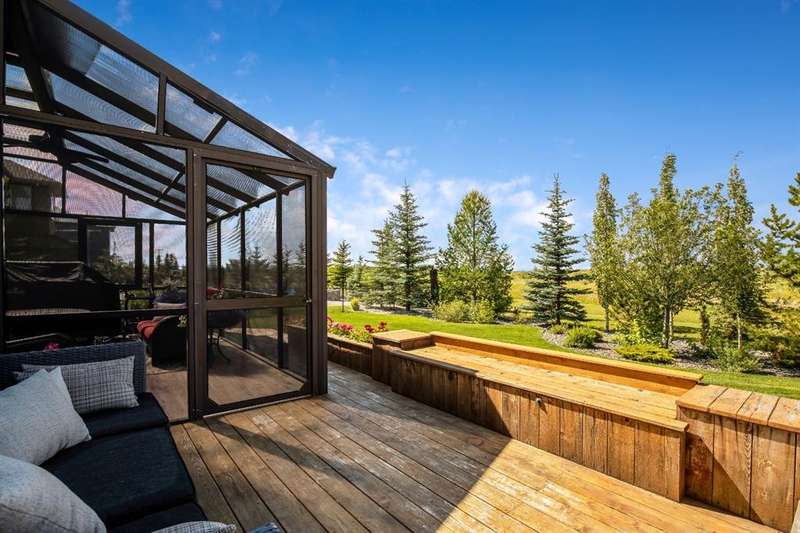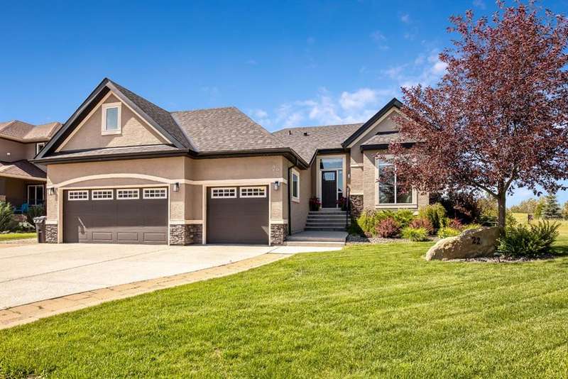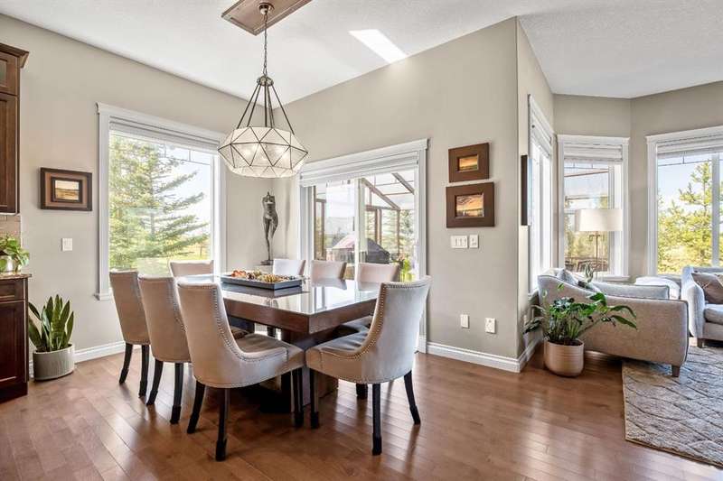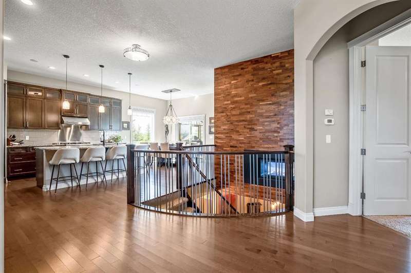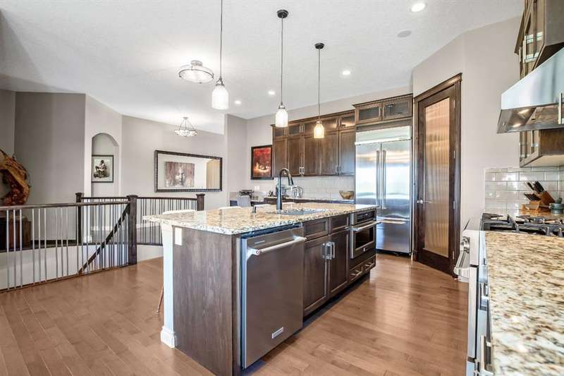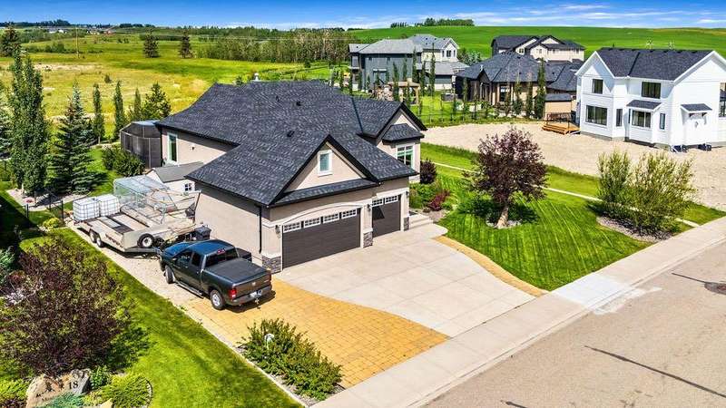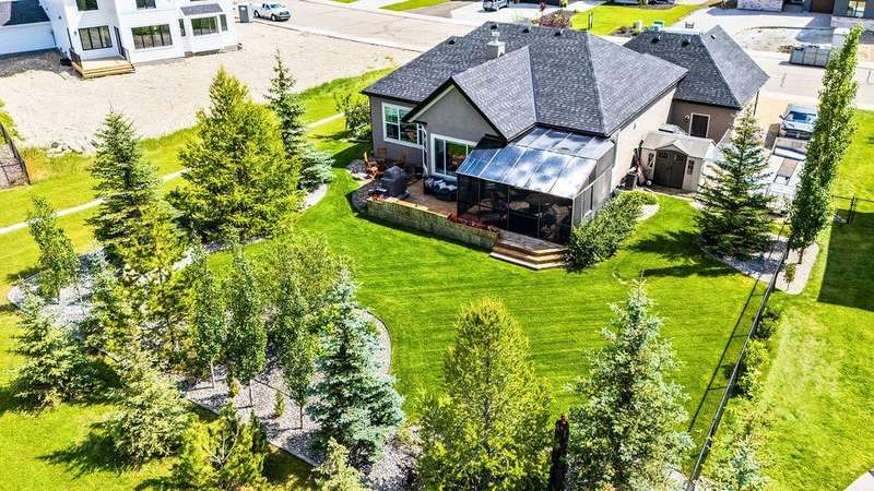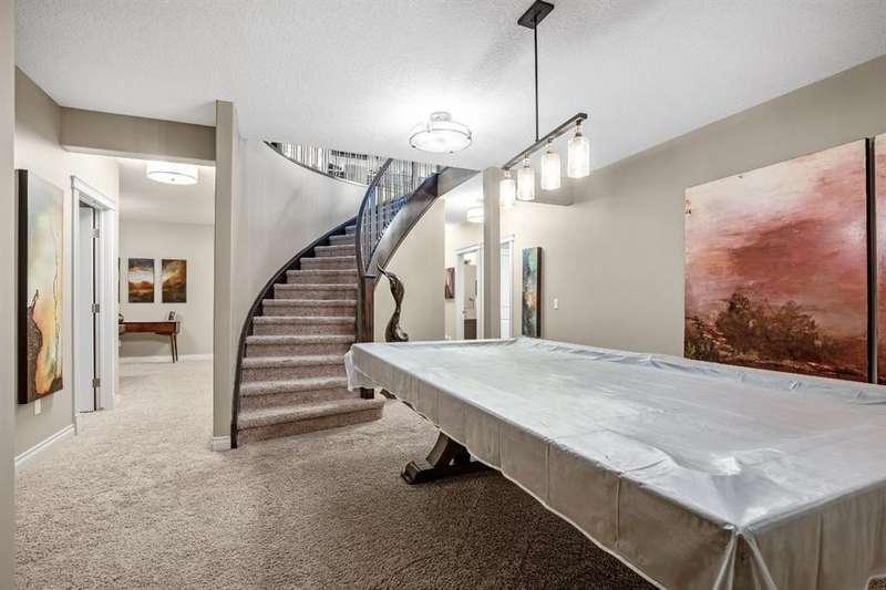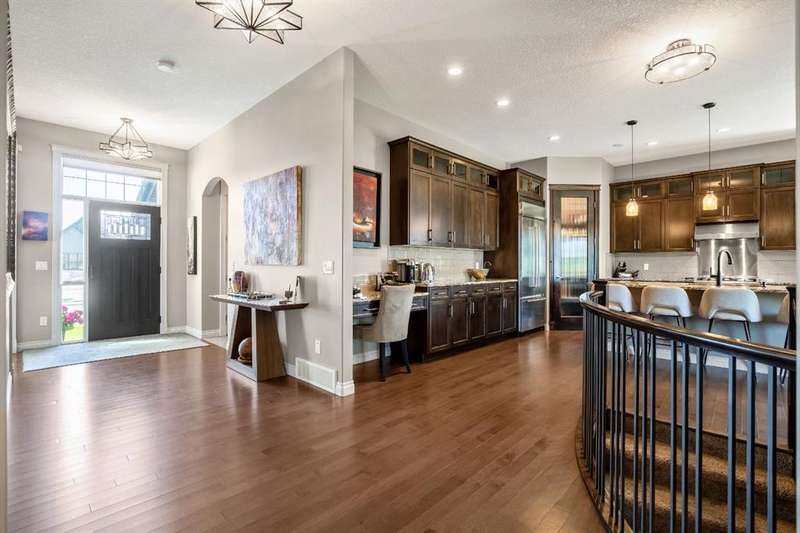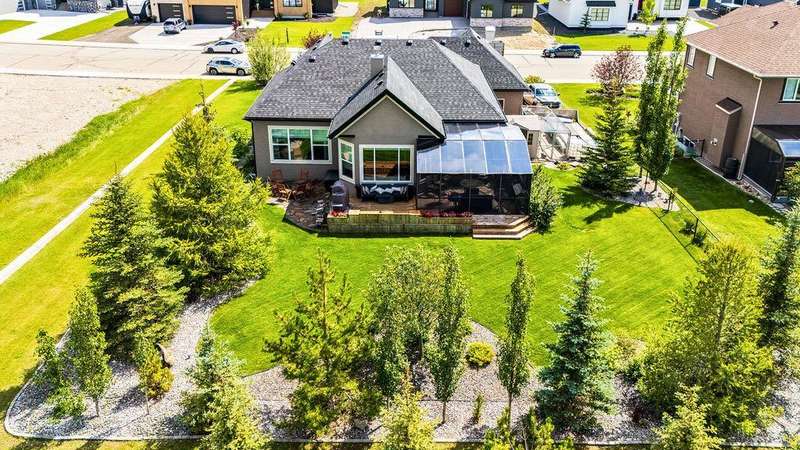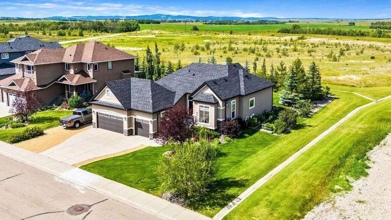 This fully finished bungalow in the prestigious community of Monterra combines elegance, comfort, and thoughtful upgrades on a beautifully landscaped quarter-acre lot with breathtaking north and west views. The oversized, heated triple garage offers a large commercial sink, 220 V power, and additional parking, while the outdoors offers an expansive sunroom, tiered deck with gas line and hot tub power, surrounded by your own forest of trees, creating the perfect private retreat. Inside, soaring 10’ ceilings, a grand spiral staircase, and a stunning two-way gas fireplace with custom walnut wall set the tone for the open, light-filled main floor, where a gourmet kitchen with granite countertops, walk-through pantry, premium Thor gas range, commercial KitchenAid refrigerator, built-in microwave/second oven, and reverse osmosis water filtration flows seamlessly into the dining and living areas with custom built-ins. The primary suite features double door entry, a walk-in closet, and a spa-inspired 5-piece ensuite with soaker tub, tiled shower, and dual sinks, while a front office or additional bedroom, full bath, and laundry/mudroom complete the level. The fully finished lower level offers a large recreation space with a virtually new pool table, wet bar, and games area, a cozy media room, three generous bedrooms, and a 5-piece bathroom. Recent upgrades include central air conditioning, a main floor home speaker system, a new roof with fascia and eavestroughs (2025), new front and garage doors, Hunter Douglas Silhouette blinds, and a dog run. Located on a quiet street just minutes from Cochrane and a short drive to Canmore and Banff, this exceptional home offers luxury, functionality, and the best of city and country living in one stunning package.