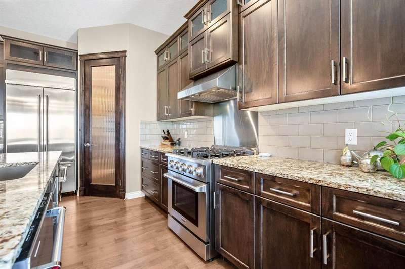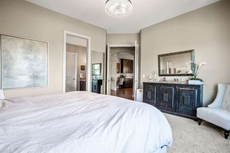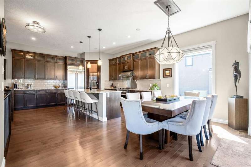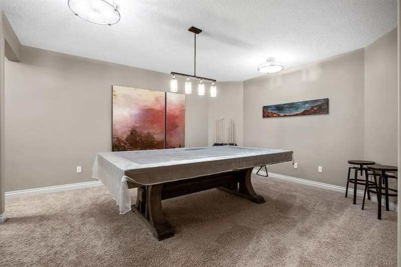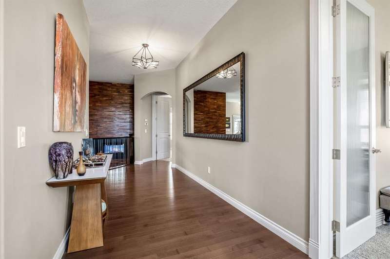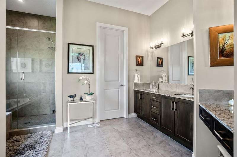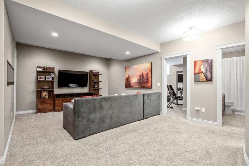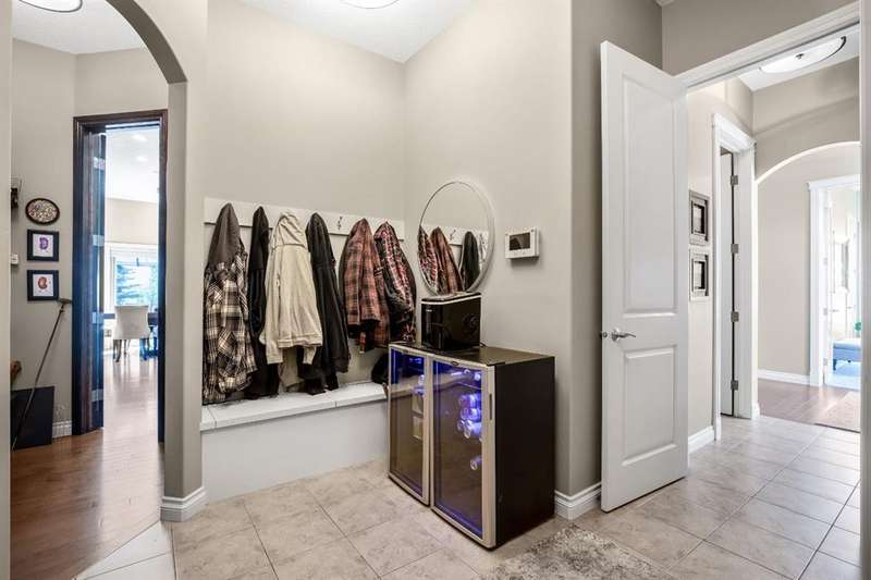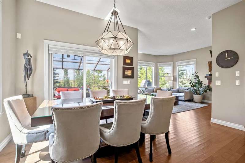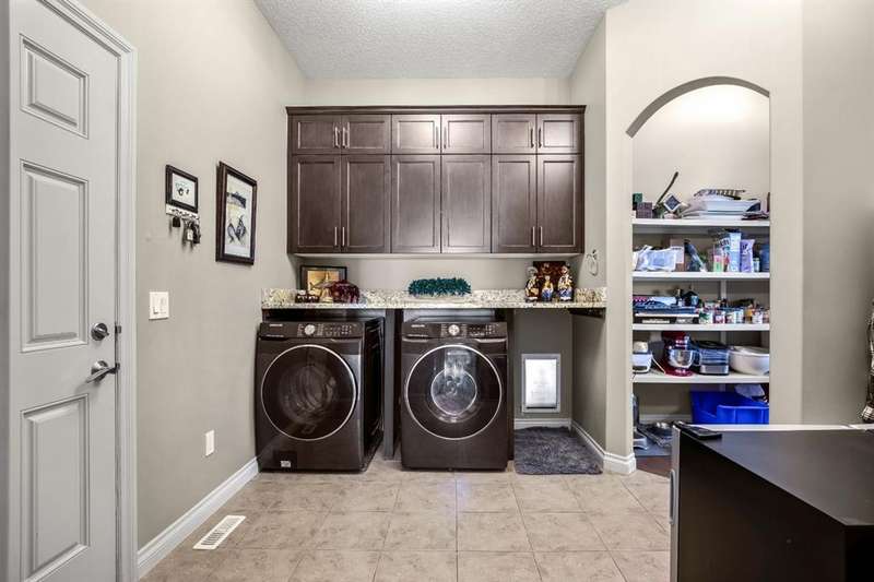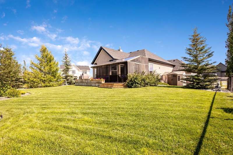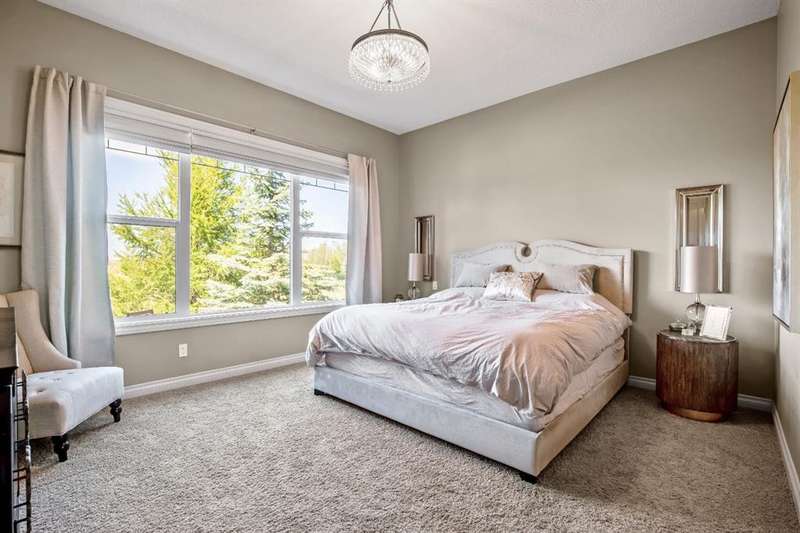 This fully finished bungalow in the prestigious community of Monterra combines elegance, comfort, and thoughtful upgrades on a beautifully landscaped quarter-acre lot with breathtaking north and west views. The oversized, heated triple garage offers a large commercial sink, 220 V power, and additional parking, while the outdoors offers an expansive sunroom, tiered deck with gas line and hot tub power, surrounded by your own forest of trees, creating the perfect private retreat. Inside, soaring 10’ ceilings, a grand spiral staircase, and a stunning two-way gas fireplace with custom walnut wall set the tone for the open, light-filled main floor, where a gourmet kitchen with granite countertops, walk-through pantry, premium Thor gas range, commercial KitchenAid refrigerator, built-in microwave/second oven, and reverse osmosis water filtration flows seamlessly into the dining and living areas with custom built-ins. The primary suite features double door entry, a walk-in closet, and a spa-inspired 5-piece ensuite with soaker tub, tiled shower, and dual sinks, while a front office or additional bedroom, full bath, and laundry/mudroom complete the level. The fully finished lower level offers a large recreation space with a virtually new pool table, wet bar, and games area, a cozy media room, three generous bedrooms, and a 5-piece bathroom. Recent upgrades include central air conditioning, a main floor home speaker system, a new roof with fascia and eavestroughs (2025), new front and garage doors, Hunter Douglas Silhouette blinds, and a dog run. Located on a quiet street just minutes from Cochrane and a short drive to Canmore and Banff, this exceptional home offers luxury, functionality, and the best of city and country living in one stunning package.