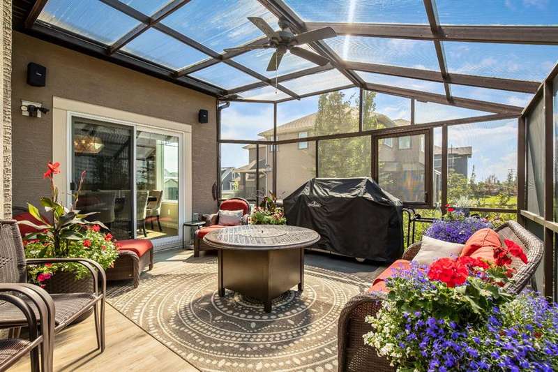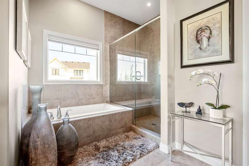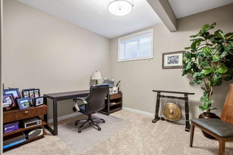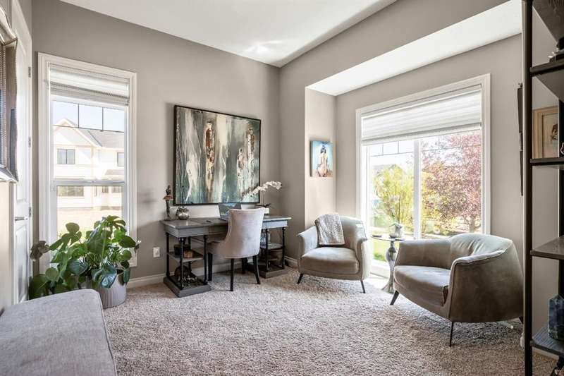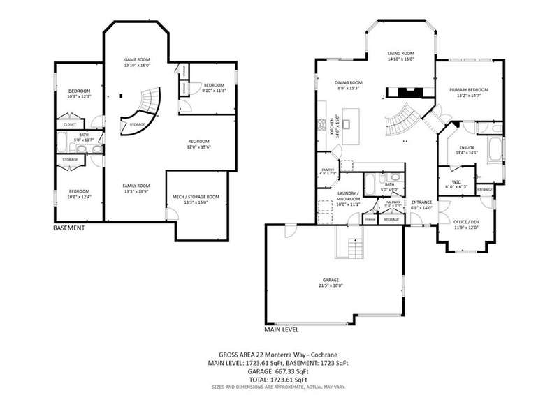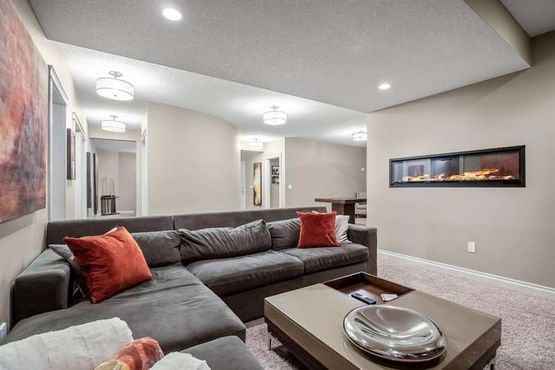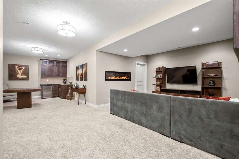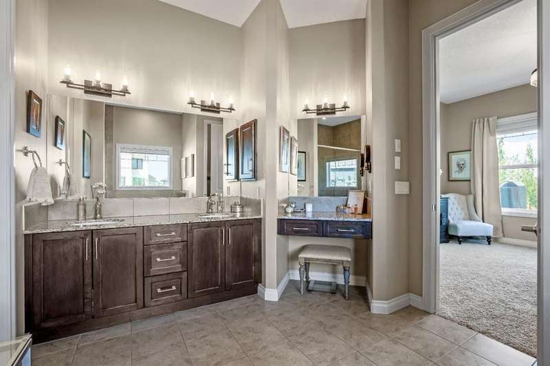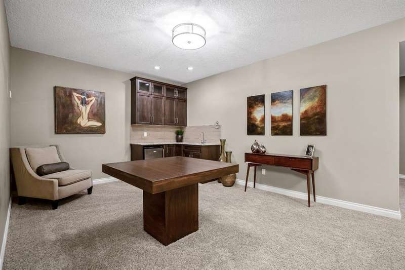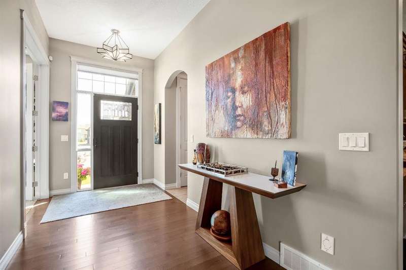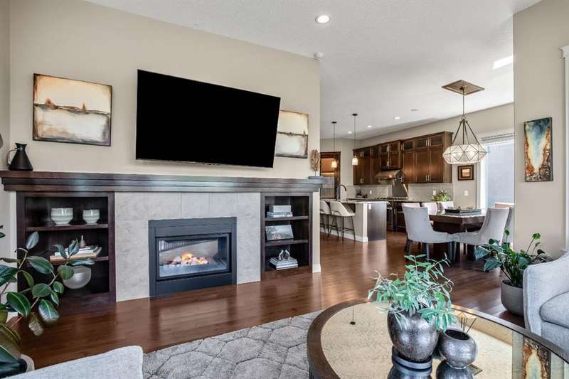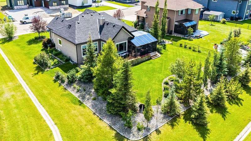 This fully finished bungalow in the prestigious community of Monterra combines elegance, comfort, and thoughtful upgrades on a beautifully landscaped quarter-acre lot with breathtaking north and west views. The oversized, heated triple garage offers a large commercial sink, 220 V power, and additional parking, while the outdoors offers an expansive sunroom, tiered deck with gas line and hot tub power, surrounded by your own forest of trees, creating the perfect private retreat. Inside, soaring 10’ ceilings, a grand spiral staircase, and a stunning two-way gas fireplace with custom walnut wall set the tone for the open, light-filled main floor, where a gourmet kitchen with granite countertops, walk-through pantry, premium Thor gas range, commercial KitchenAid refrigerator, built-in microwave/second oven, and reverse osmosis water filtration flows seamlessly into the dining and living areas with custom built-ins. The primary suite features double door entry, a walk-in closet, and a spa-inspired 5-piece ensuite with soaker tub, tiled shower, and dual sinks, while a front office or additional bedroom, full bath, and laundry/mudroom complete the level. The fully finished lower level offers a large recreation space with a virtually new pool table, wet bar, and games area, a cozy media room, three generous bedrooms, and a 5-piece bathroom. Recent upgrades include central air conditioning, a main floor home speaker system, a new roof with fascia and eavestroughs (2025), new front and garage doors, Hunter Douglas Silhouette blinds, and a dog run. Located on a quiet street just minutes from Cochrane and a short drive to Canmore and Banff, this exceptional home offers luxury, functionality, and the best of city and country living in one stunning package.