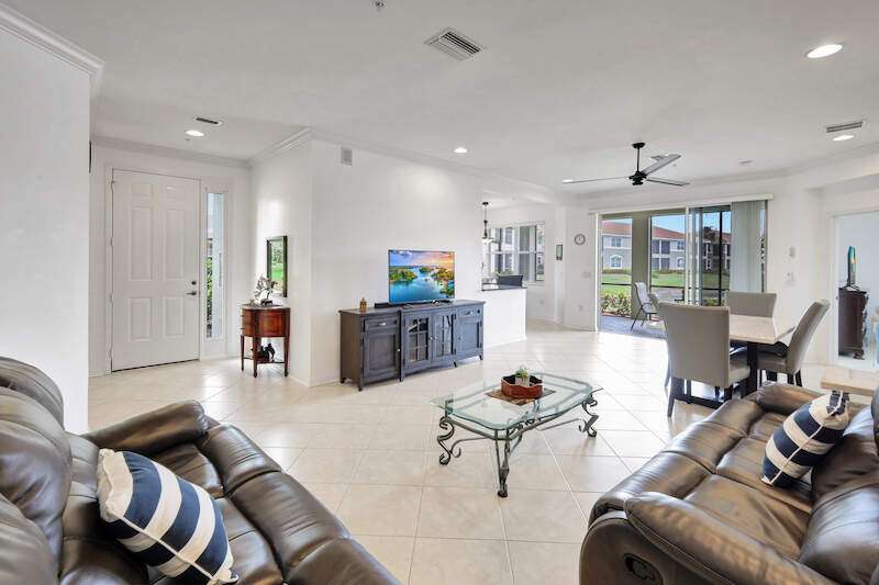 Exquisite Lakeside Luxury in Shadow Wood Preserve at a NEW IMPROVED PRICE! Step into refined elegance with this stunningly renovated residence in Bay Woods at Shadow Wood Preserve. This turnkey 2-bedroom + den, 2-bath luxury retreat offers a seamless blend of sophisticated design and breathtaking Western lake views, creating the perfect setting for captivating sunsets each evening. As you enter this first-floor end unit, natural light pours in, enhancing the expansive, open layout. Every detail has been meticulously curated, the crown molding and recessed lighting, elevating the ambiance with a timeless elegance. The chef's kitchen is a masterpiece of both form and function, featuring soft-close cabinetry and premium stainless steel appliances. The primary suite is a sanctuary of comfort, boasting two custom walk-in closets and contemporary furnishings and a luxuriously en-suite bath. The guest bath mirrors the same level of sophistication, ensuring an elevated experience for visitors. A versatile den with double doors provides the flexibility of a private home office or additional guest space. Step outside to a tranquil screened lanai with a wonderful outdoor living experience. The attached one-car garage and newer roof ensure both convenience and peace of mind. Nestled on a serene corner lot just steps from the community pool and spa, this residence offers an exceptional lifestyle. Shadow Wood Preserve's world-class amenities include a canoe/kayak launch, scenic nature trails, a fishing pier, tennis, pickleball, bocce, and more. HOA fees cover fiber-optic television, high-speed Wi-Fi, water, and insurance, while optional memberships to Shadow Wood Country Club provide access to 54 holes of championship golf, and The Commons Club offers private beach access, a state-of-the-art lifestyle center, and exquisite dining experiences. Ideally situated in the heart of Southwest Florida, just minutes from Coconut Point, pristine beaches, and RSW International Airport, this exceptional home presents an unparalleled opportunity to embrace the ultimate luxury lifestyle in SWFL.