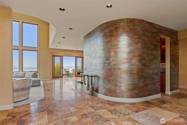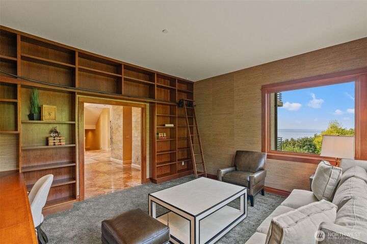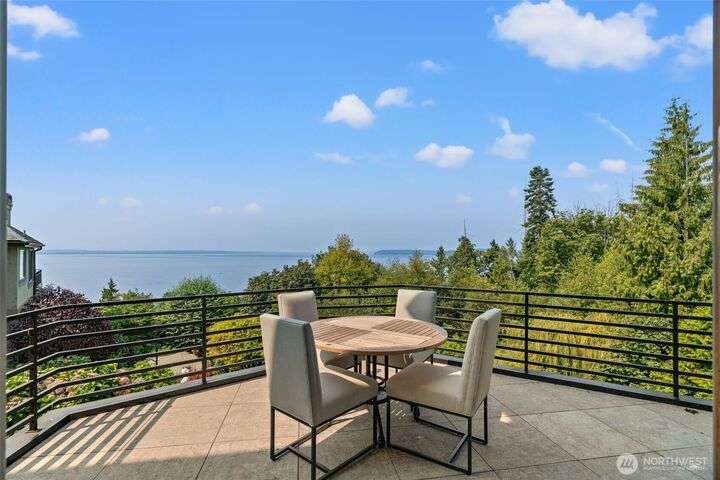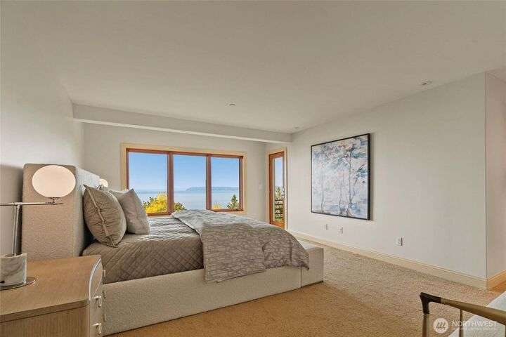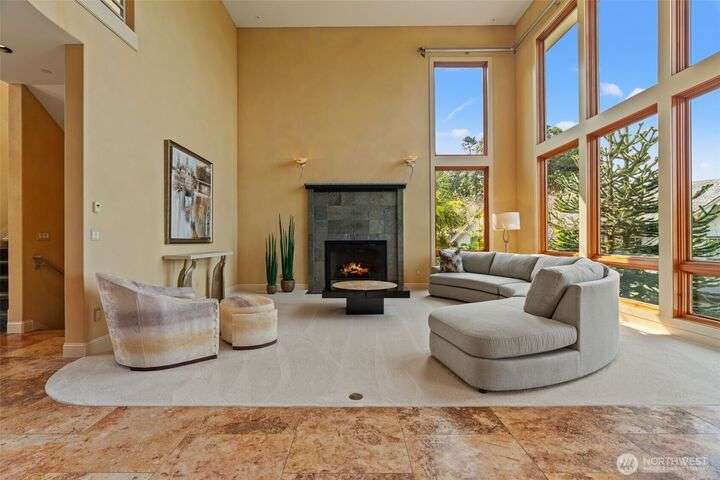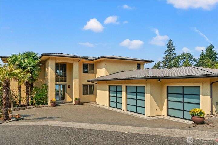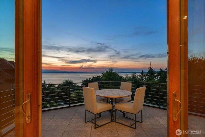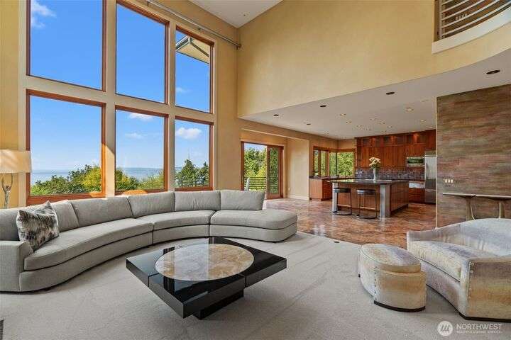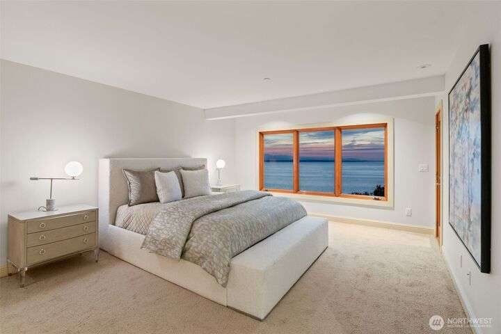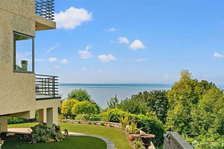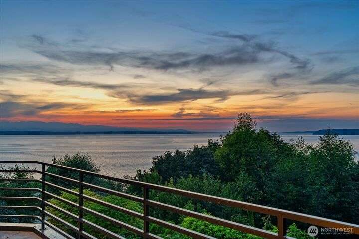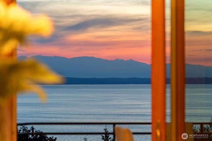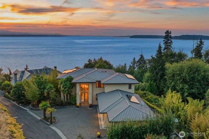 As the sun sets over Puget Sound and the Olympic Mountains, the sky transforms into a canvas of color—yours to enjoy from the comfort of home. Walls of two-story windows showcase breathtaking views from this exceptional retreat. Set on 2.24 private acres, the home is designed for both entertaining and quiet moments - gather around the center island in the chef’s kitchen with butler’s pantry, host in the formal dining room, or unwind in the library, wine cellar, or soundproof music/theater room. The serene primary suite offers two walk-in closets and a private deck for sunset views. A rare blend of privacy, comfort, and timeless design with solar power, radiant heat, 3-car garage and generator, A/C.