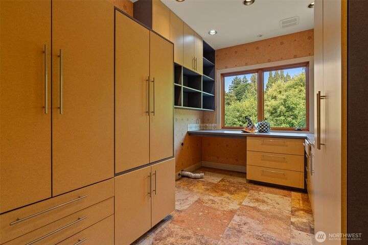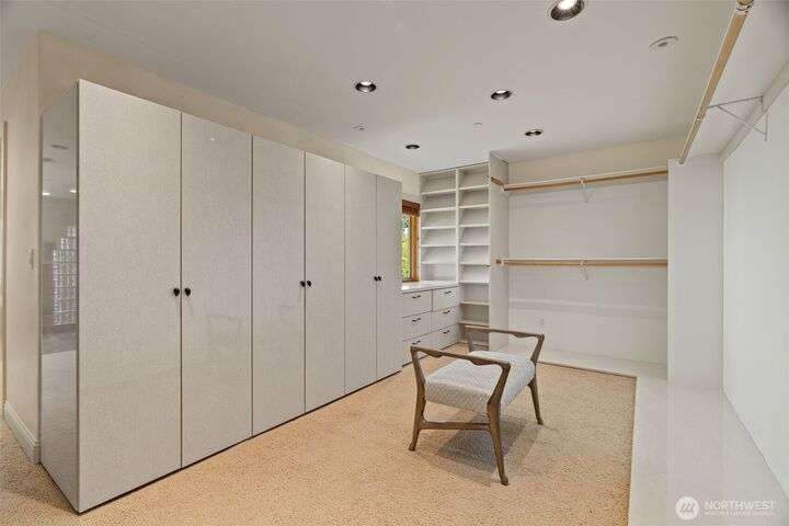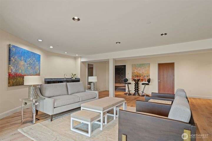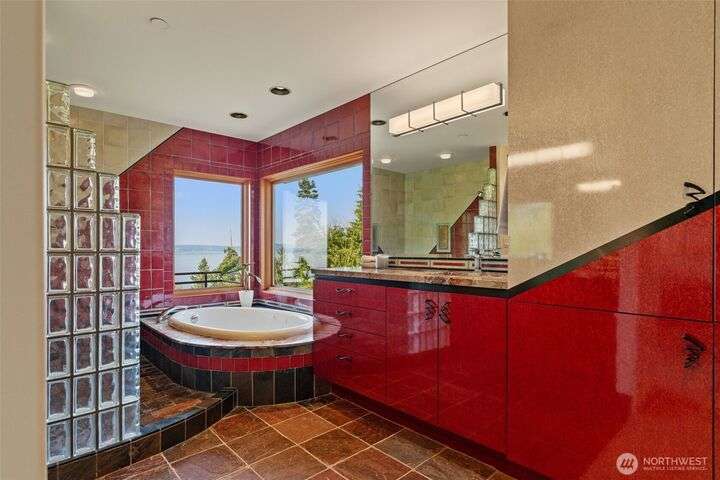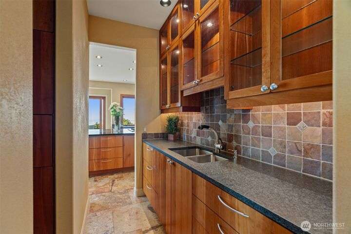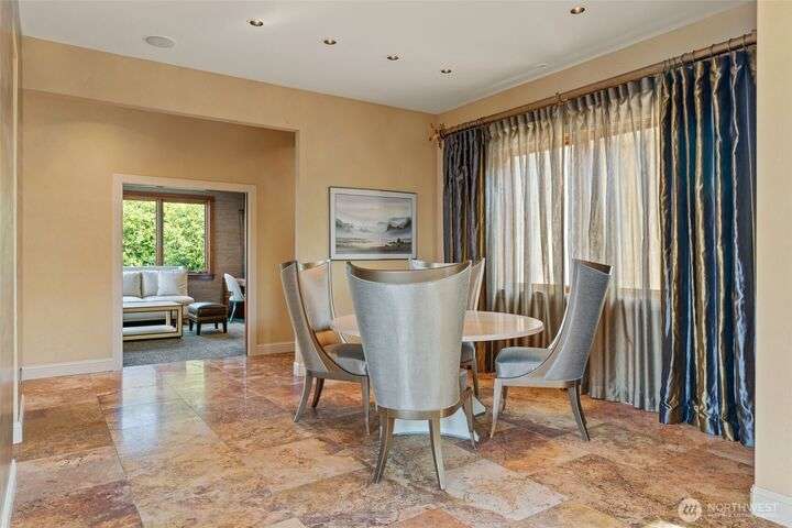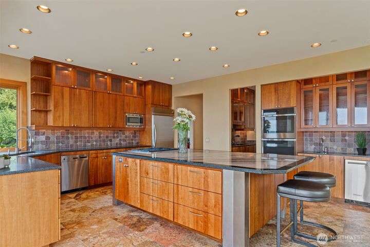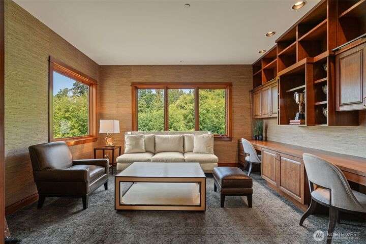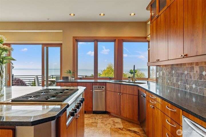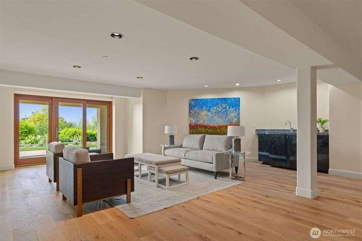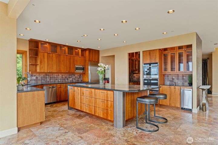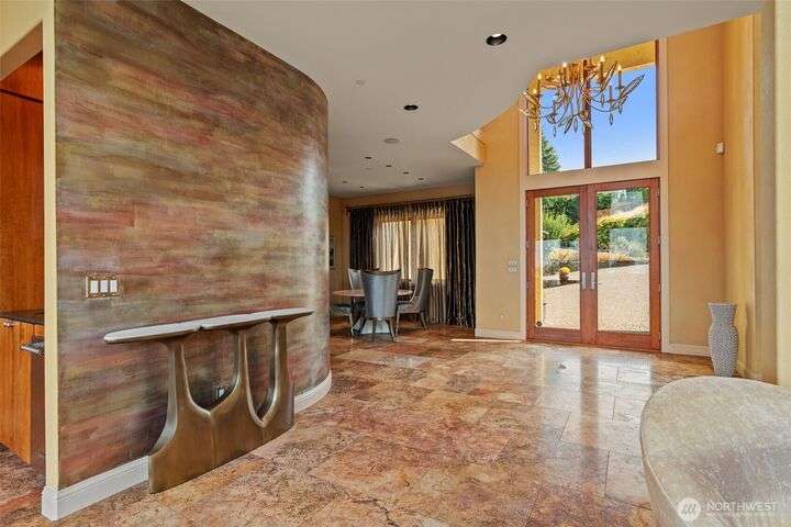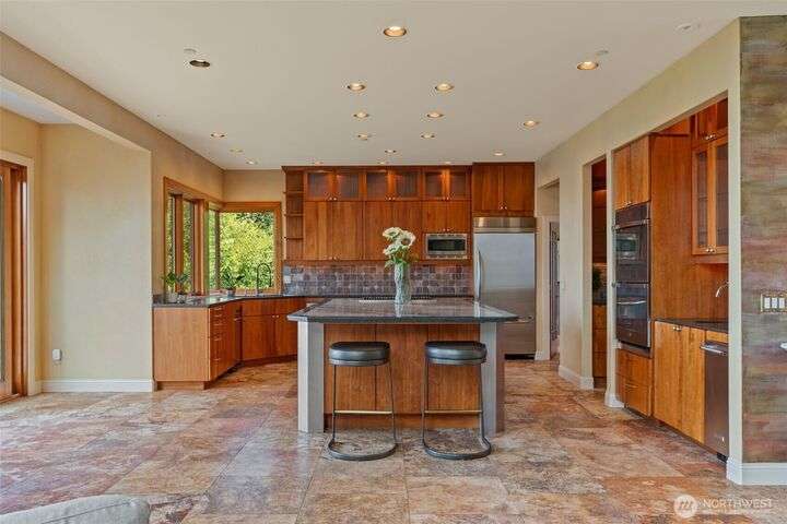 As the sun sets over Puget Sound and the Olympic Mountains, the sky transforms into a canvas of color—yours to enjoy from the comfort of home. Walls of two-story windows showcase breathtaking views from this exceptional retreat. Set on 2.24 private acres, the home is designed for both entertaining and quiet moments - gather around the center island in the chef’s kitchen with butler’s pantry, host in the formal dining room, or unwind in the library, wine cellar, or soundproof music/theater room. The serene primary suite offers two walk-in closets and a private deck for sunset views. A rare blend of privacy, comfort, and timeless design with solar power, radiant heat, 3-car garage and generator, A/C.