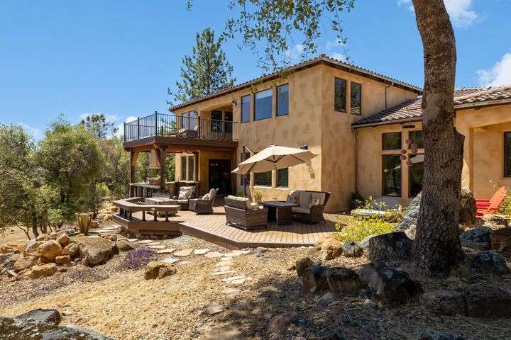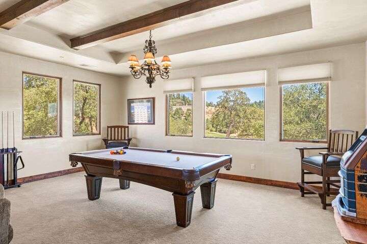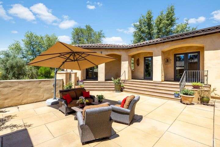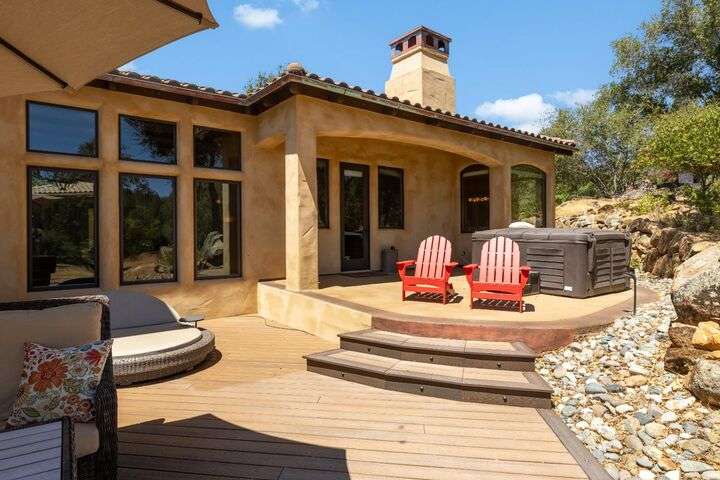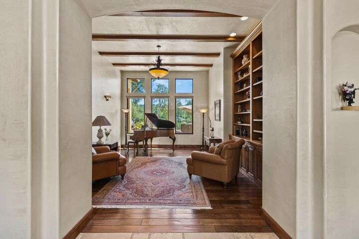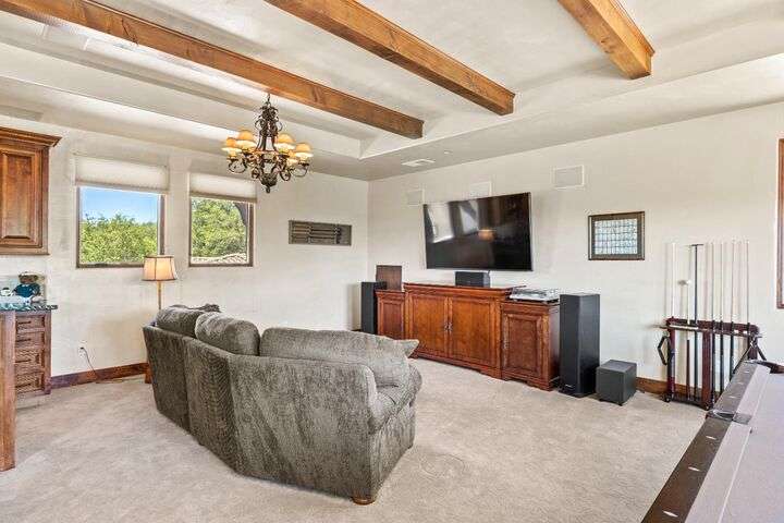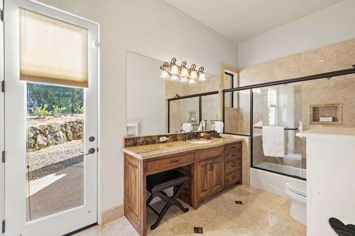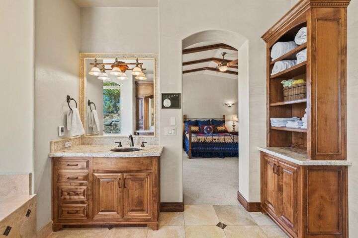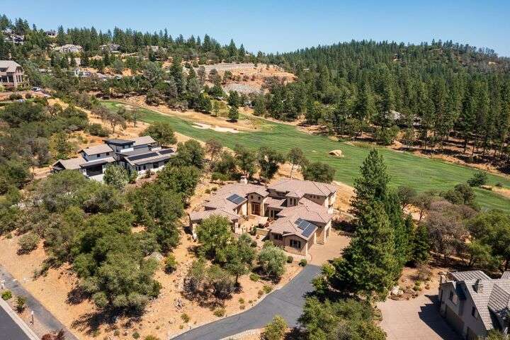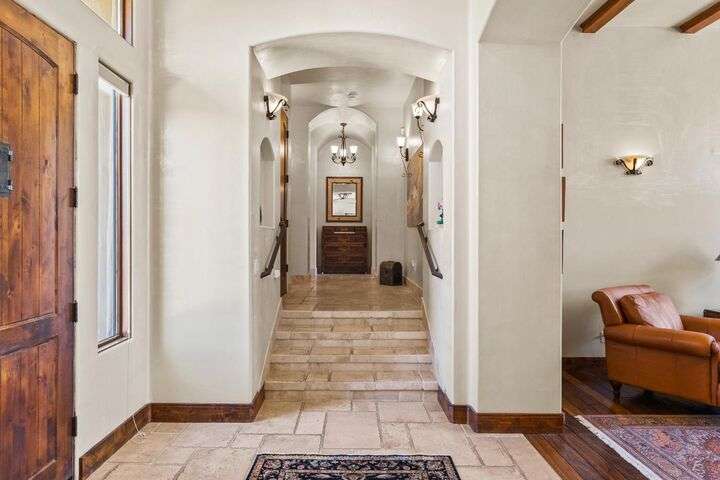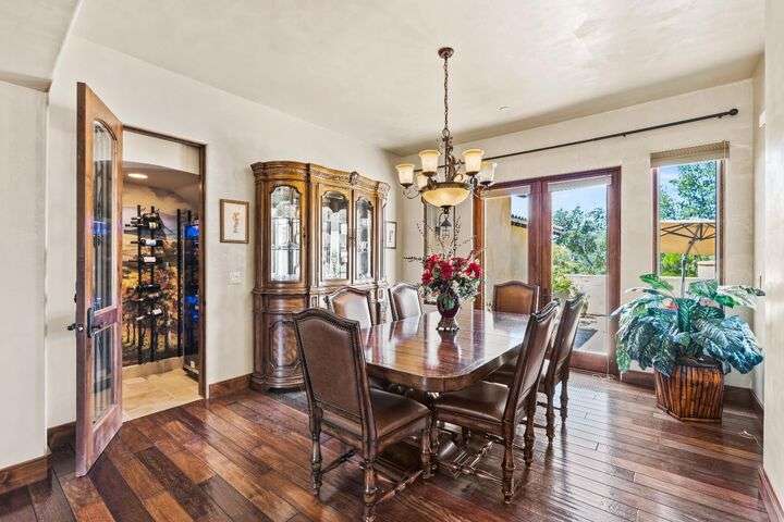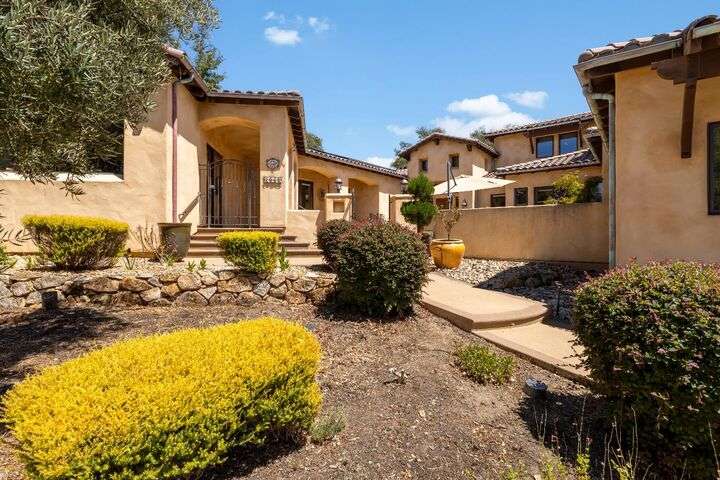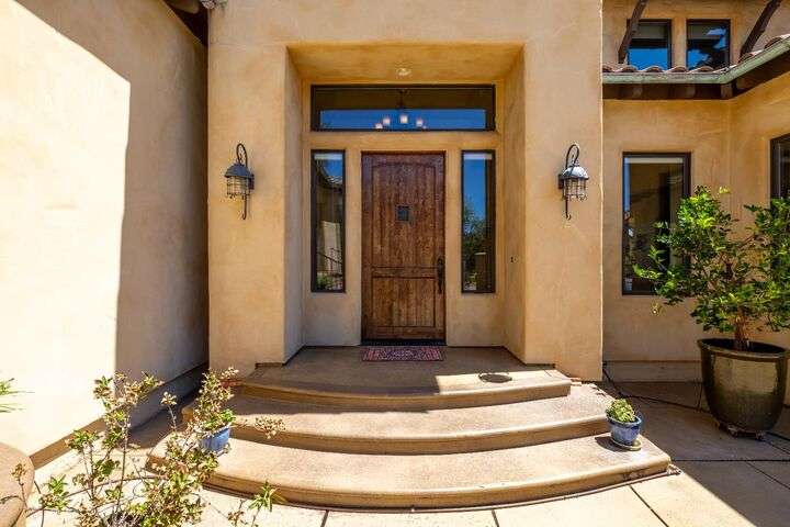 A Tuscan Masterpiece on the 18th Fairway at Winchester Country Club - Experience the elegance of 17th-century Italy blended with modern luxury in this stunning Tuscan-style estate high above the 18th fairway of Winchester Country Club. Spanning 5,236 sqft, this 4-bedroom, 6-bath home offers breathtaking views of the golf course and foothills. Enter into Old World charm with arched doorways, hand-molded plaster walls, and open-beam ceilings. Hardwood and tile floors flow throughout, accented by stonework and premium finishes. The gourmet kitchen boasts Viking and Bosch appliances, antique-glazed cabinetry, and chiseled granite countertops. The primary suite features a vaulted ceiling, stone fireplace, spa-like bath with heated marble floors, jetted tub, and dual copper sinks. Upstairs, enjoy a large Game/Home Theater room, wet bar, and expansive balcony with panoramic views. A charming casita offers versatility as a guesthouse or office. The outdoor space includes a front courtyard, covered patio, outdoor kitchen, spa, and fountain, all overlooking the golf course views from this 1.10 acre lot. Additional features include owned solar, a Generac Standby Generator, a wine cellar, and a 4-car garage. This estate offers unparalleled luxury in a premier golf course setting.