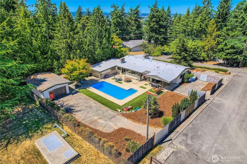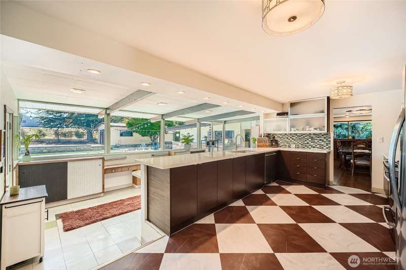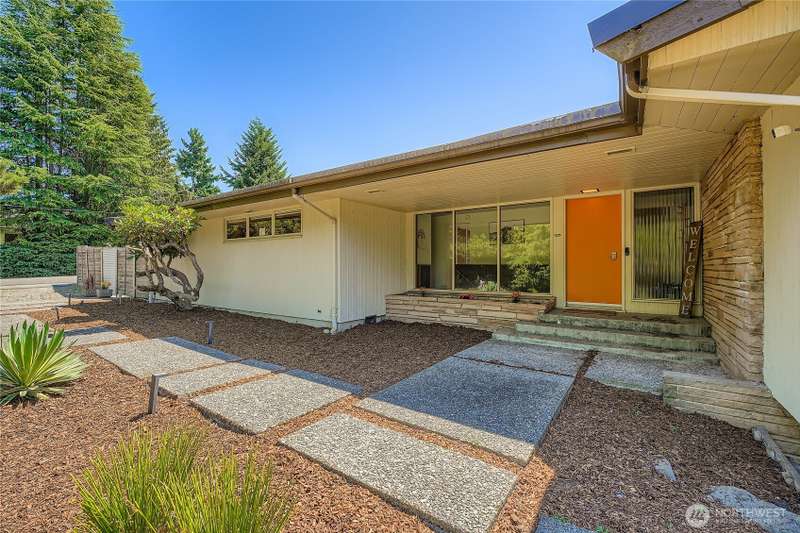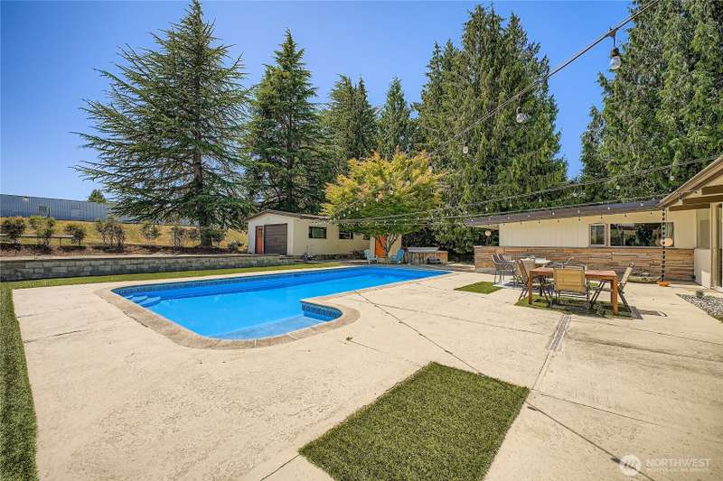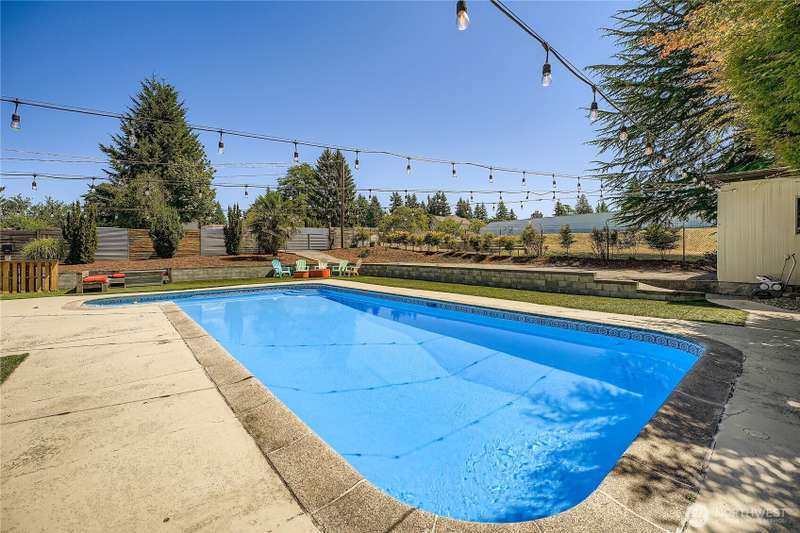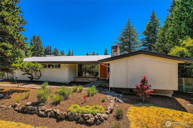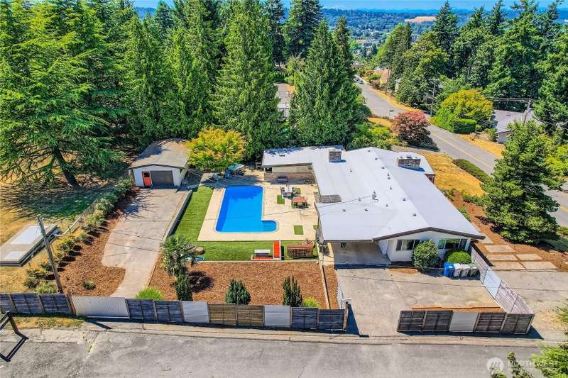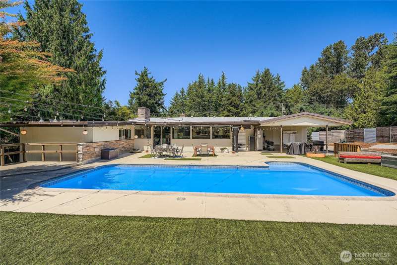 Stunning modern mid-century home with timeless style & a backyard oasis! This light-filled residence features clean lines, large windows, & warm wood tones throughout. Spacious main-level living areas flow effortlessly—perfect for entertaining or everyday life. The kitchen opens directly to the patio & pool area, creating seamless indoor-outdoor living. The daylight basement offers incredible flexibility with a bedroom, workout room, entertainment room, & ¾ bath ideal for guests, hobbies, or multi-generational living w/separate entry. Enjoy your private retreat with an in-ground pool, expansive patio, & fully fenced yard. New furnace 2024. Located in a quiet, established Kent neighborhood near parks, shopping, schools, & 167. A rare find!