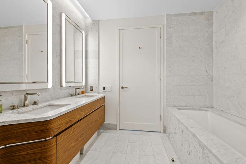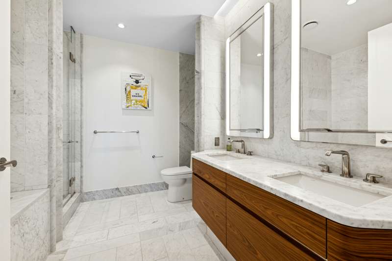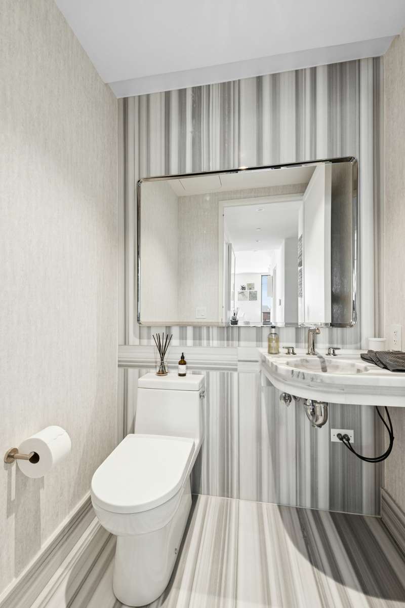 The dining area is conveniently located just off of the designer kitchen and can easily accommodate a dining table for 8-10 people. The chef's kitchen is as aesthetically striking as it is functional and includes some of the finest appliances and materials including: a full suite of Miele appliances, Carrara marble countertops and backsplash, custom Molteni walnut cabinetry for lower cabinets, and custom fluted mirrored cabinetry for upper cabinets.There is a separate powder room for guests in addition to the two en-suite bathrooms for each bedroom.