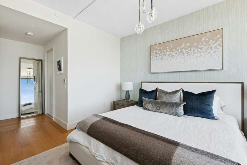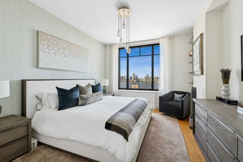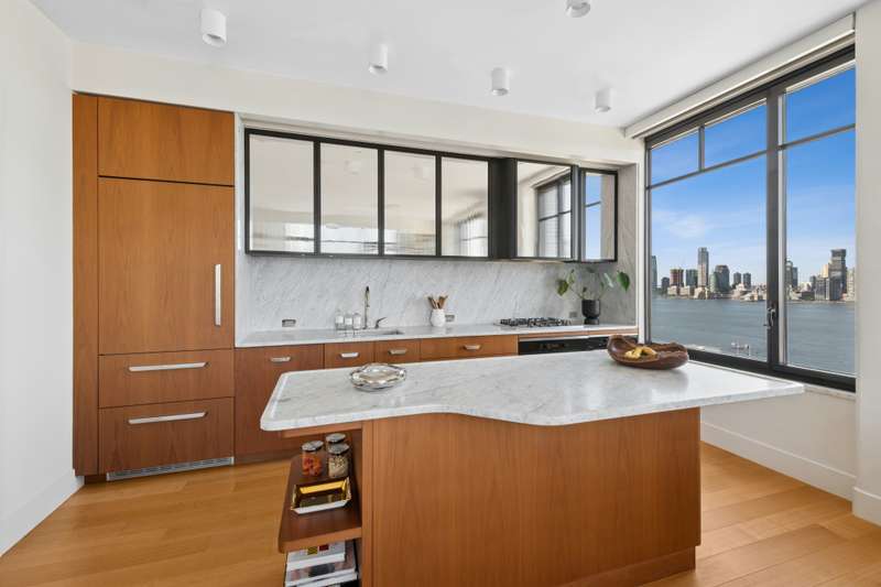 The king-size, primary suite has open views of the Hudson River enjoyed through a large picture window. It includes three custom built-out closets and a spa-like five-fixture bath adorned in marble. The primary bath includes a large deep soaking tub, separate stall shower, double-vanity with abundant storage, custom lighting and cabinetry, and radiant heated floors.