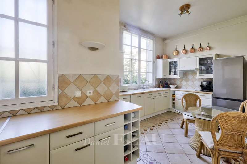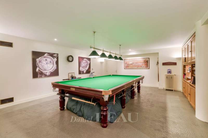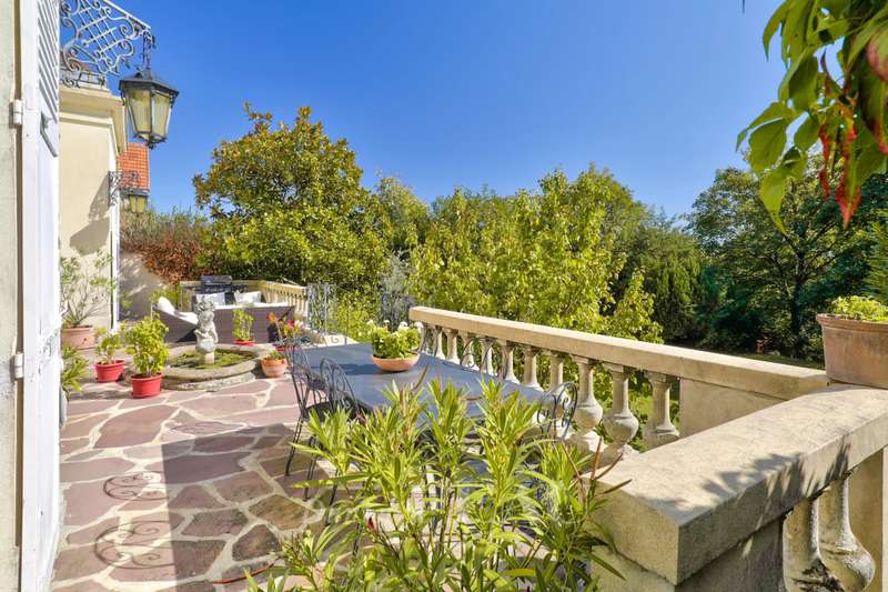 This elegant near 350 sqm property dating from the mid 20th century is set in a leafy 833 sqm plot in the sought-after Montretout neighbourhood. It includes an entrance hall featuring old panelling, a near 60 sqm living/reception room bathed in sunshine and featuring high ceilings, Versailles-style parquet flooring, a fireplace, Louis XV-style panelling and bookcases, a kitchen with dining facilities, a master suite with a study, a bath/shower room and wc, and a guest wc. The living rooms open onto a terrace and the fully south-facing garden, and enjoys an open view of Saint Cloud Forest. Upstairs a wide landing/recreation area leads to four bedrooms including a suite with a shower room and adjacent study/dressing room, a bath/shower room and wc, and a dressing room. On a fitted basement with a utility room, a boiler room, a wine cellar, a home cinema, a billiard room and a large garage for several vehicles. An ideal family home near the shops, the International Schools (American School, Deutsche Schule), and the transport networks.