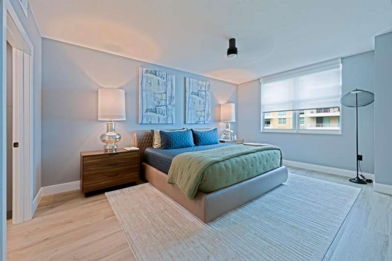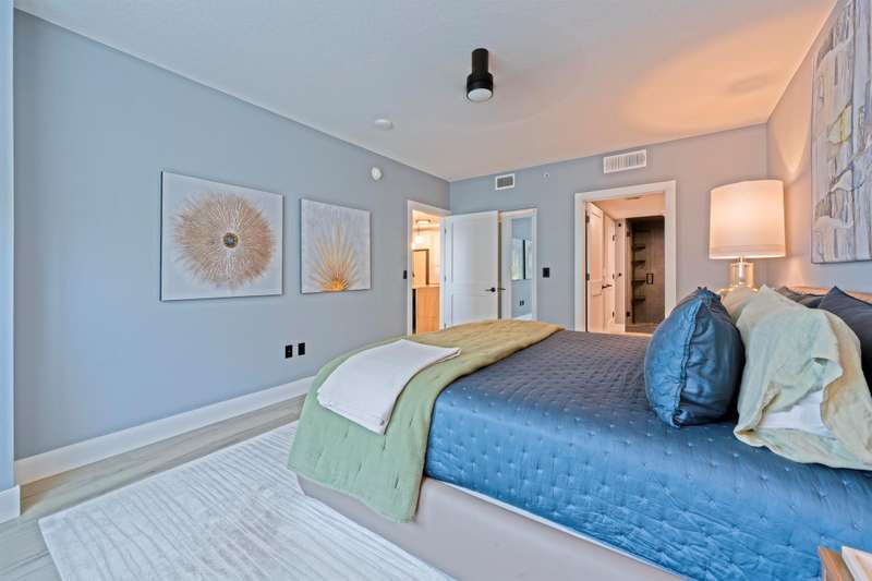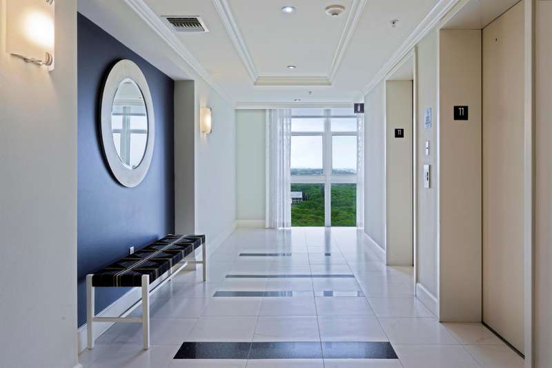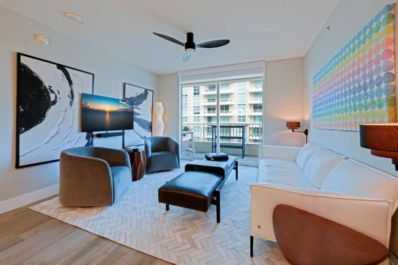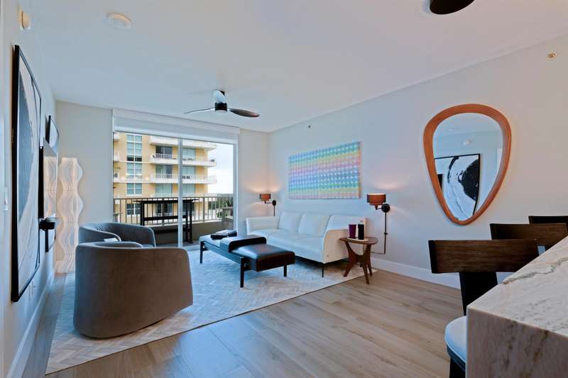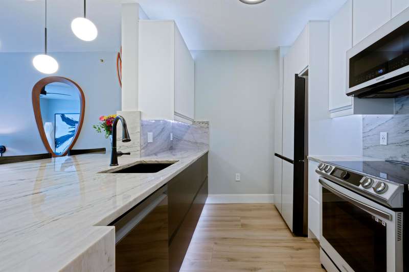 Beautiful, completely renovated condo with ocean and intracoastal views. Top to bottom renovation in late 2023. As soon as you enter this condo you will notice the large 60 inch porcelain wood plank tile floors. You will be welcomed by a modern sleek kitchen with gorgeous Quartzite counters and large waterfall edge that sets the tone for the rest of the home. The kitchen has modern white cabinets, smart home integrated Samsung appliances, plus cabinet and floorboard lighting. The high end renovation continues into the Primary bathroom with quartzite counters and custom vanity with additional cabinetry. The spa-like shower has floor to ceiling custom tile work, frameless glass doors, and a choice of shower heads. No detail was left untouched,
