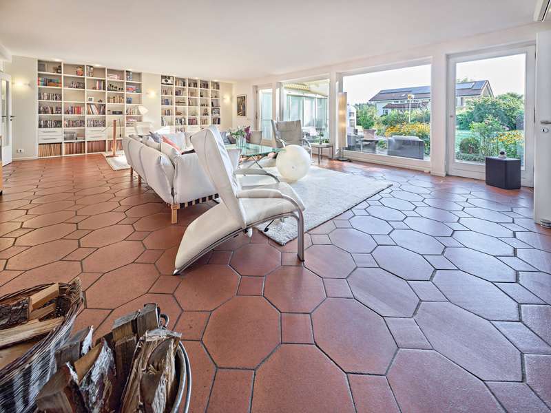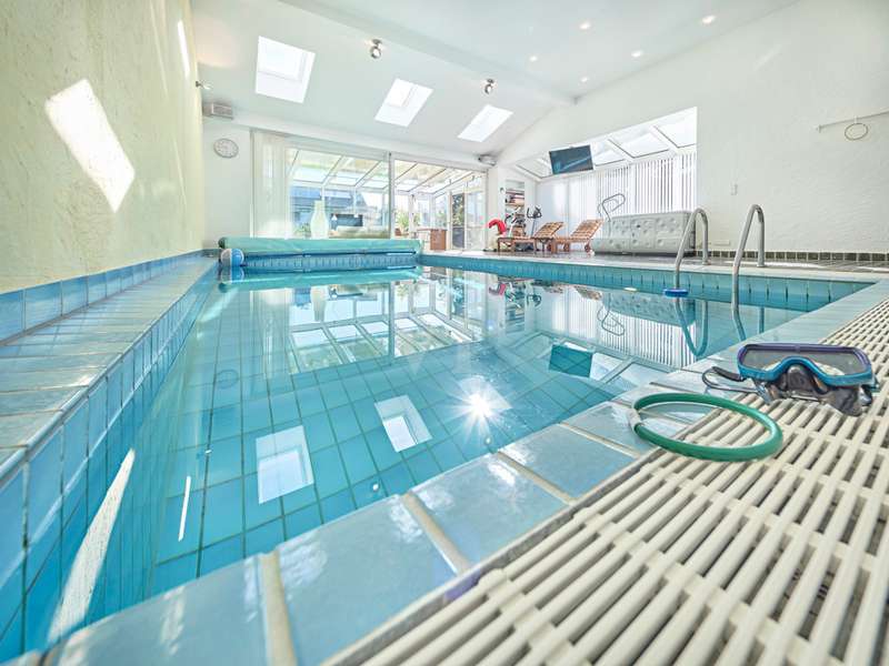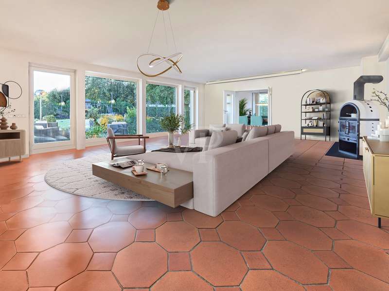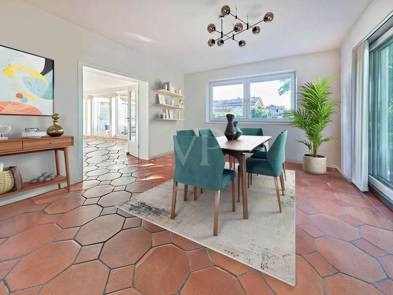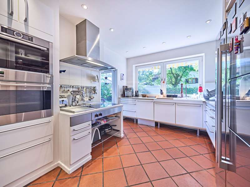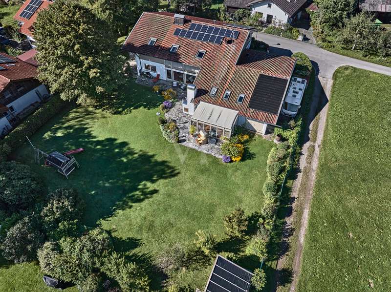 This modernized country villa from 1977 is flooded with light, typical of the country and of high quality. The property extends over a living space of around 418 m² and stands on a generous plot of approx. 1,748 m². Thanks to extensive renovation work, particularly in 1999 and 2006, this property is in a very well-kept condition. The property has a total of eleven rooms, including seven bedrooms and five bathrooms. The distribution of the rooms is optimal and offers enough space for a large family or for use as a vacation home. The property also has three balconies and terraces, which offer wonderful views of the surrounding countryside. The stylish and well thought-out spatial concept, which is also reflected in the open staircase and the elegant entrance, underlines the special architecture. The centerpiece of this property is undoubtedly the sun-drenched living and dining area with adjoining terrace on the first floor. Architecturally spacious, the living area with fireplace extends into the garden area and leaves plenty of room for special occasions to celebrate and enjoy. Poggenpohl kitchen equipment underlines the high-quality living feeling on this level. A separate wing on the first floor, with a bathroom and separate WC, allows guests to live in a self-sufficient and relaxed atmosphere. The spacious spa area with indoor pool (with counter-current system), whirlpool, sauna and light-flooded conservatory, also on the first floor, makes this place of longing a favorite spot in your own retreat. The upper floor impresses in the spacious rooms with its open roof truss and additional bathrooms, creating a wonderfully generous feeling of space. The property impresses with its modern yet traditional, high-quality furnishings, which are perfectly tailored to the needs of modern residents while retaining the charm and generosity of times gone by. It offers enough space and comfort to develop individually and receive guests in a unique ambience. Central heating and underfloor heating ensure pleasant warmth in all rooms. Visually, the country house impresses with its spacious design and very well-kept gardens. The plot offers plenty of space for outdoor activities and is ideal for garden parties or creating your own vegetable garden. The property has a spacious country house garage and outdoor parking spaces. In addition to the garage, there is also an outdoor parking space for a mobile home or a sailing boat. This beautiful property in Breitbrunn is surrounded by nature, in a quiet residential area and not far from Lake Chiemsee. This location nevertheless offers good connections to the surrounding towns and countryside. Shopping facilities, schools and leisure facilities are available nearby. All in all, this property is a real gem that fulfills every space requirement and impresses with its modern furnishings and spacious living area. Come and see the benefits of this country house for yourself. We would be delighted to take the time and show you the property in person.