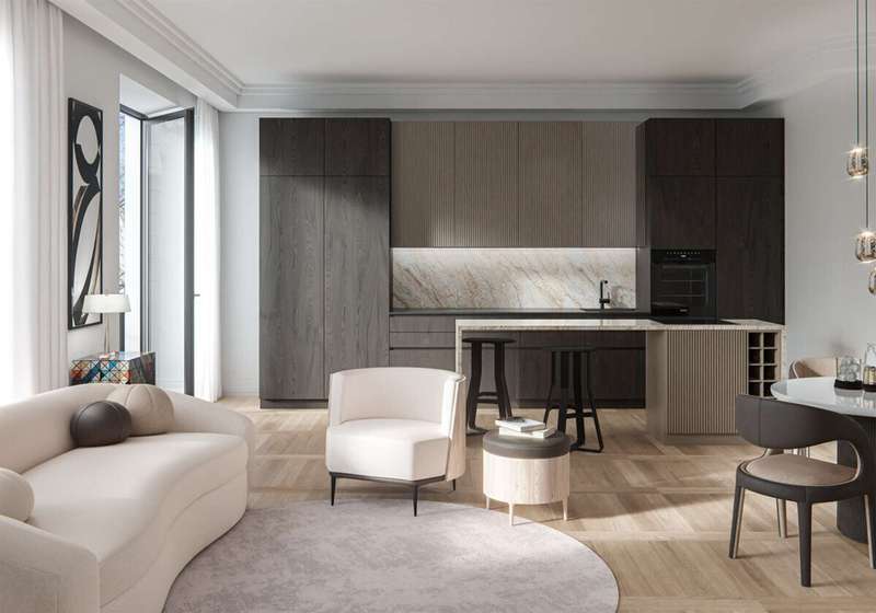 With Simplon 10-12, fashion designer Patrick Hellmann is bringing the concept of branded residences to Berlin. The striking corner building from the Wilhelminian era is being given a new look with sophisticated façades, elegant windows and fine details. Townhouses are being created on the first floor. There are apartments and studios above. Almost every apartment has an outdoor area, in some cases several. To top it all off, the top floor will be completely rebuilt for 4 penthouses including a roof terrace. There is a choice of three furnishing lines, which are presented in the three show apartments. For the first time, a two-storey townhouse with its own entrance and house number is being built in a Wilhelminian-style residential building. There is a London feeling here, as the living room on the first floor is connected via two steps to the eat-in kitchen and the courtyard garden with adjoining garden terrace. The private retreats are located on the second floor: two rooms with a shared balcony, a master bedroom with en suite bathroom and a further room overlooking the courtyard. The exclusive ambience is rounded off by the daylight bathroom with a large shower. Welcome to your jewel.