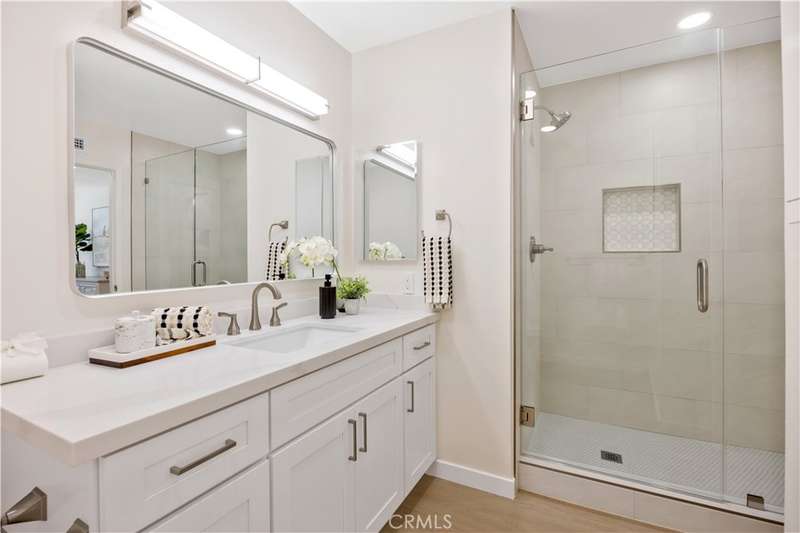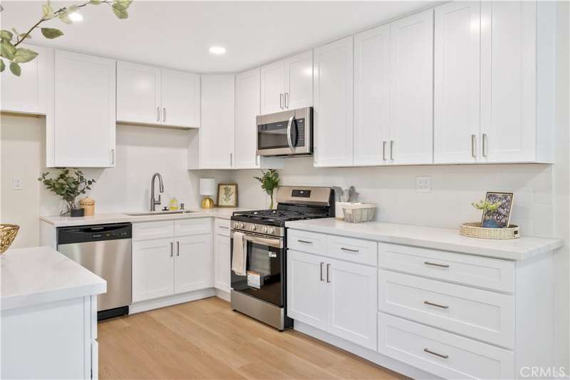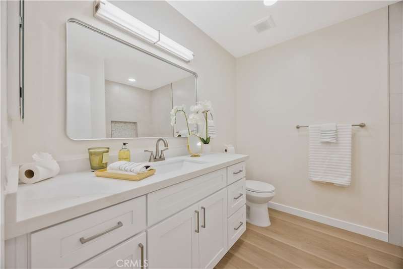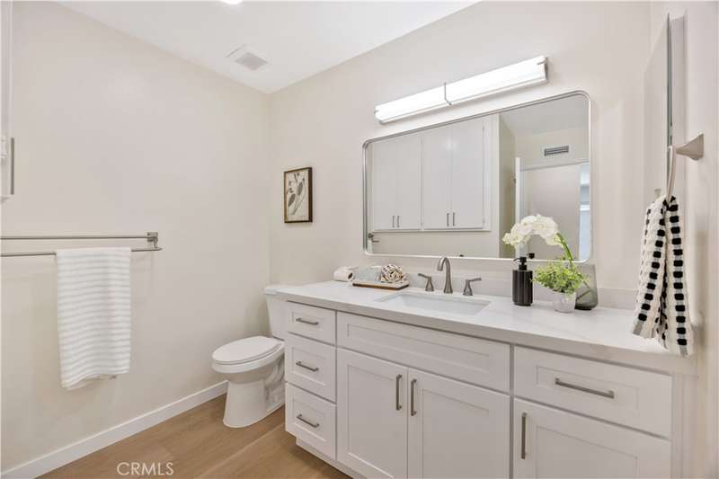 The stunning kitchen features brand-new cabinets, quartz countertops and stainless steel appliances, perfect for the home chef. Both bathrooms have been completely remodeled with porcelain tile, new vanities topped with quartz, updated fixtures and modern finishes.