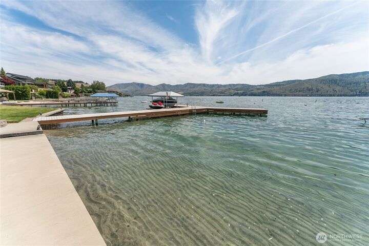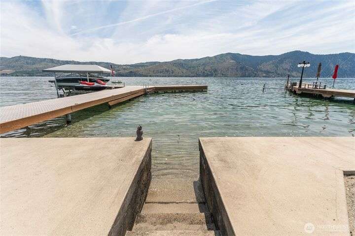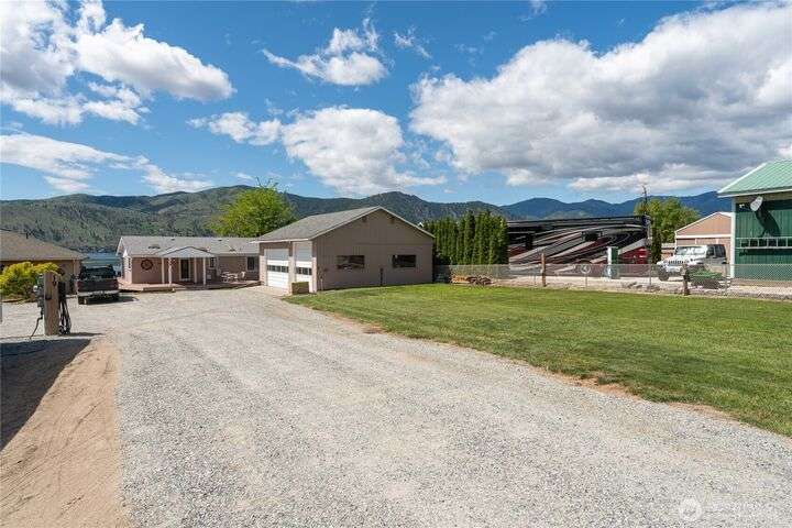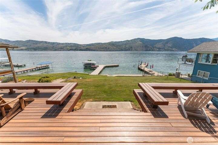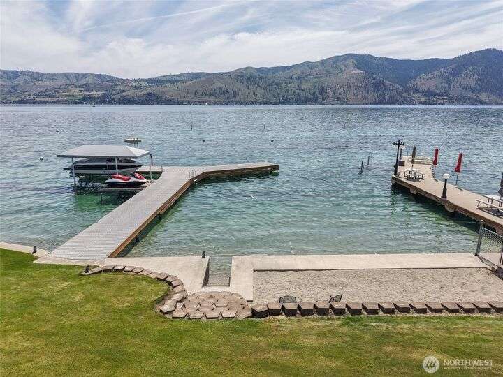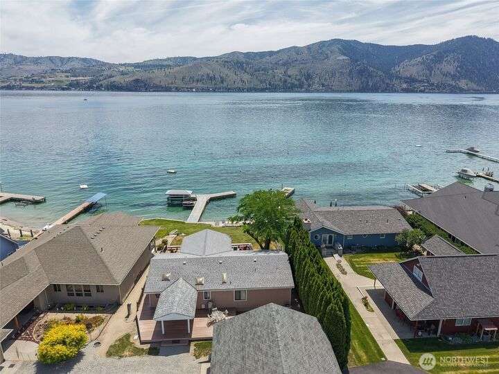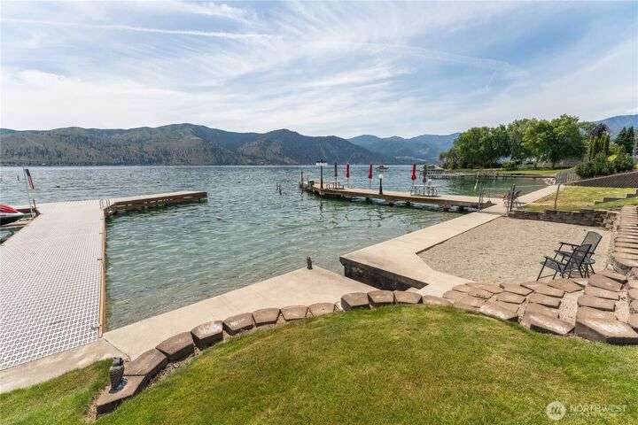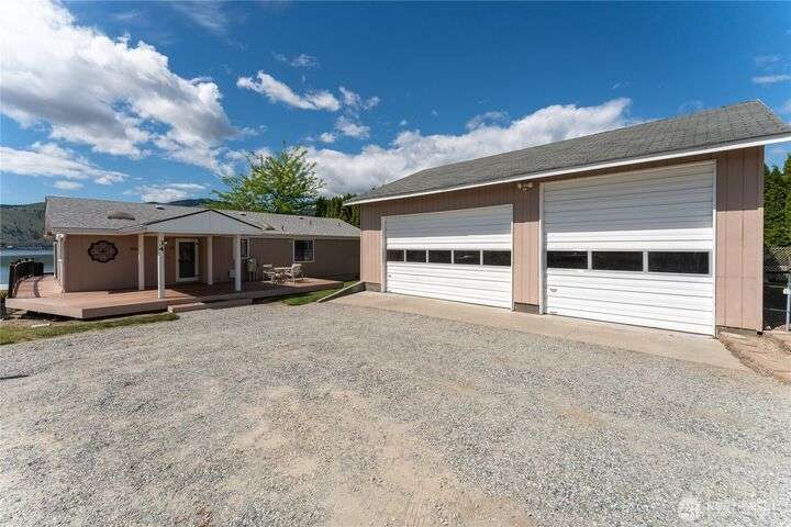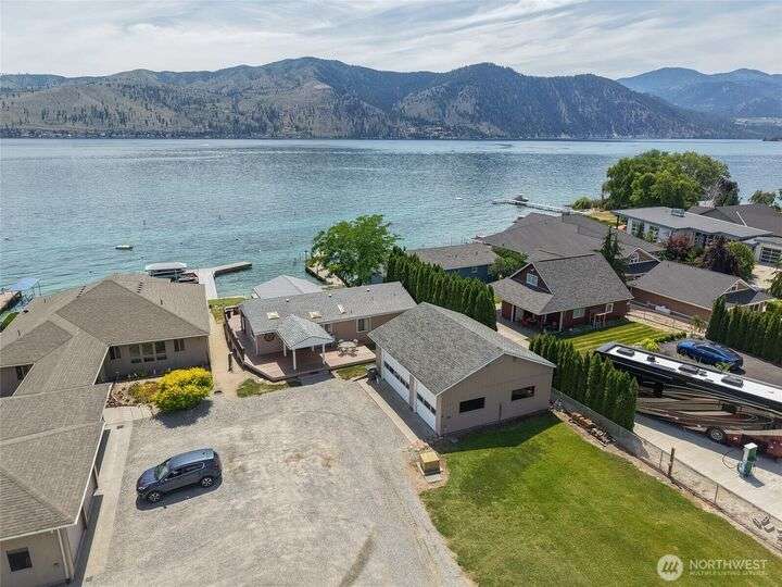 Welcome to 34 Leisure Lane! This rare .9-acre property boasts 56 ft of low bank waterfront with a concrete bulkhead and stairs to a sandy beach. Enjoy a resurfaced shared dock and a stunning, newer lake-facing deck off a charming 3 bed, 2 bath, 1,300 sq ft home. Two lots (front and back) offer exceptional flexibility and space, including a 3-bay shop, 4 RV hookups, and tons of parking. Mostly flat with a gentle slope—perfect for outdoor living and future development/building. Prime location with easy, level access off a paved road. On sewer, with LCRD domestic water and irrigation. One of the nicest stretches of real estate on Lake Chelan & amongst some incredible new homes & remodels. House plans by Complete Design can be included!