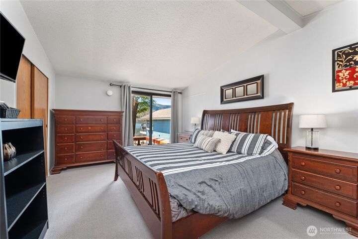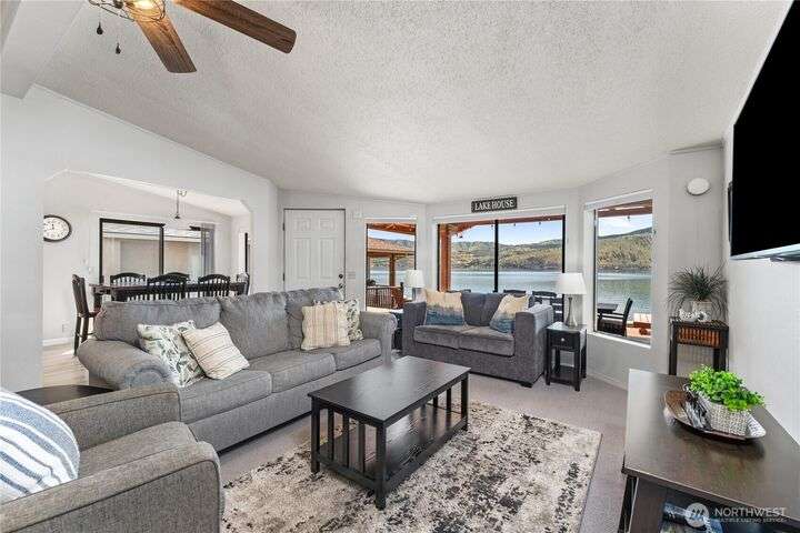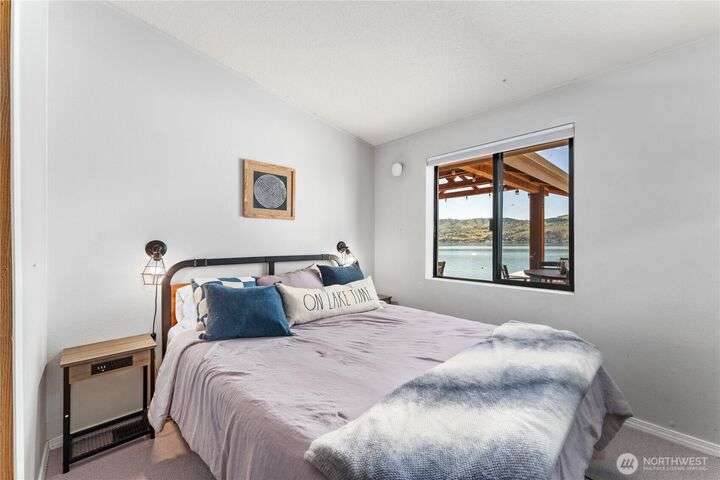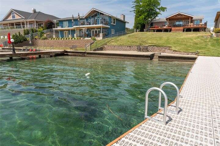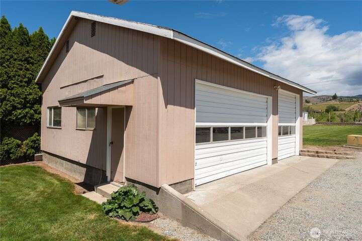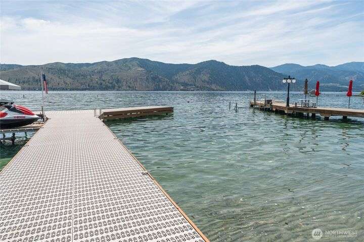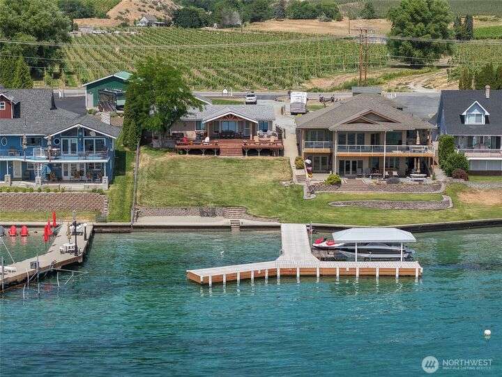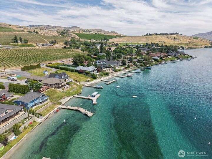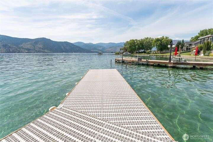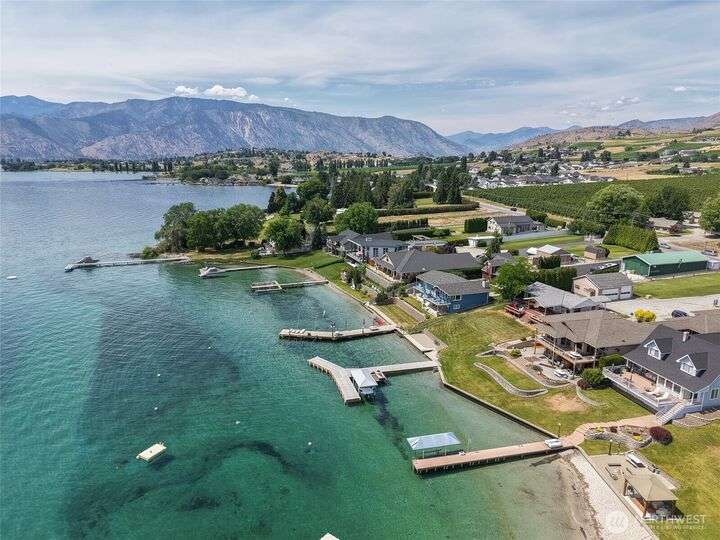 Welcome to 34 Leisure Lane! This rare .9-acre property boasts 56 ft of low bank waterfront with a concrete bulkhead and stairs to a sandy beach. Enjoy a resurfaced shared dock and a stunning, newer lake-facing deck off a charming 3 bed, 2 bath, 1,300 sq ft home. Two lots (front and back) offer exceptional flexibility and space, including a 3-bay shop, 4 RV hookups, and tons of parking. Mostly flat with a gentle slope—perfect for outdoor living and future development/building. Prime location with easy, level access off a paved road. On sewer, with LCRD domestic water and irrigation. One of the nicest stretches of real estate on Lake Chelan & amongst some incredible new homes & remodels. House plans by Complete Design can be included!
