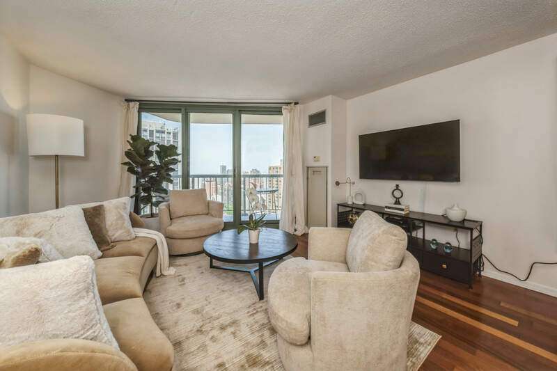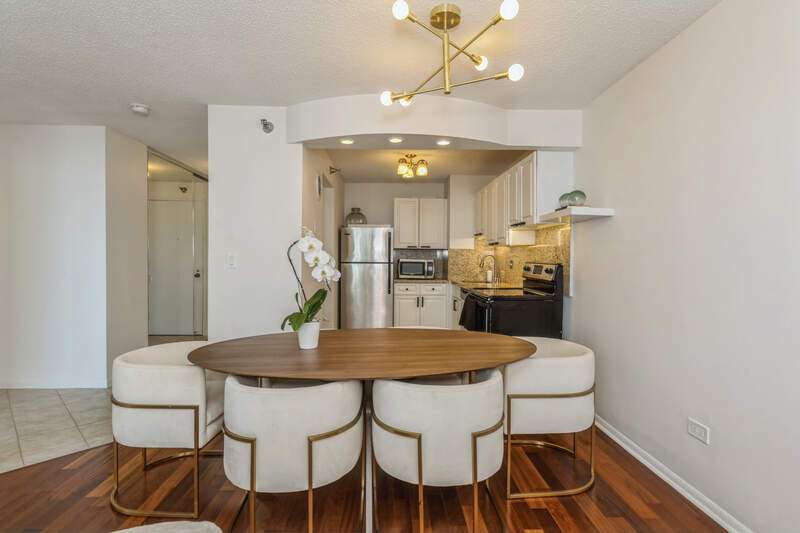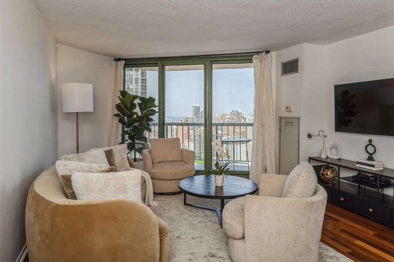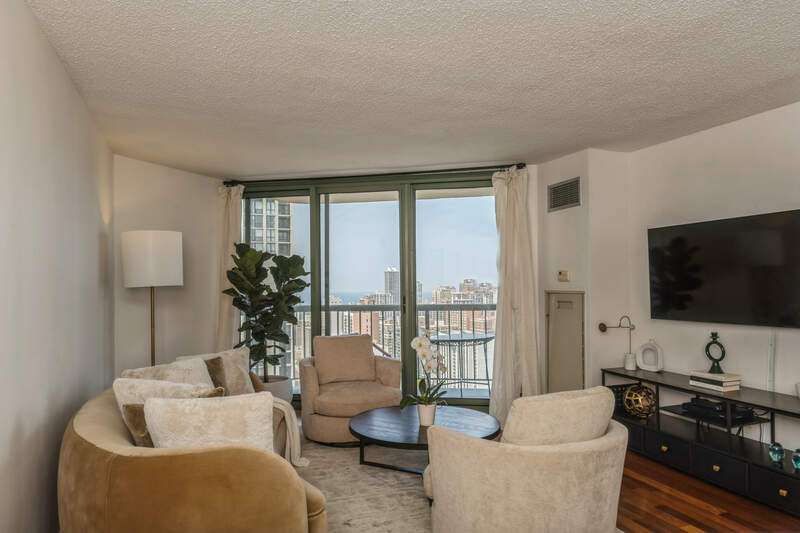 Available Now! Experience stunning panoramic views of Lake Michigan from this beautifully updated, high-floor 2 bed/2 bath residence in the sought-after Gold Coast Galleria. Bathed in natural light, this thoughtfully designed split-bedroom floor plan features floor-to-ceiling windows and hardwood flooring throughout the living area and bedrooms. The modern kitchen boasts stainless steel appliances, granite countertops, a full slab granite backsplash and ample room for a dining area. Both bathrooms have been refreshed with updated fixtures, brand new shower heads, medicine cabinets, and modernized sinks and faucets. The primary en suite offers a luxurious granite and frameless glass shower. Step onto your private balcony to take in expansive North, East, and West exposures - the perfect spot to unwind above the city. Additional highlights include a brand new living room HVAC unit (installed June 2024), generous bedroom sizes, ample pantry/closet space and the option to install in-unit laundry. Enjoy unparalleled convenience with 24-hour door staff, on-site management and maintenance, package receiving, and access to the rooftop sun deck. Residents also benefit from direct access to the premier Fitness Formula Club (FFC) offering state-of-the-art amenities including a pool, basketball court, pickleball, Pilates, group classes, personal training, sauna, spa services, and a cafe. Ideal location just steps from CTA bus routes, Red Line, grocery stores, cafes, restaurants, parks, and the lakefront. Parking included in the rental price.