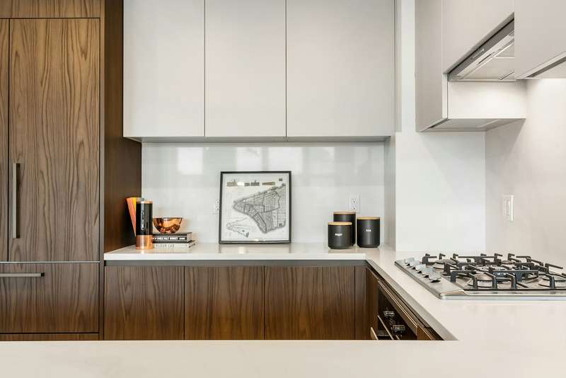 Every surface and fitting at Eleven Hancock was selected for its refined design and matchless quality. Italian crafted kitchens by Cesar were expertly designed in complimentary tones with immaculate attention to detail. A state of the art Miele appliance suite concealed behind handsome millwork while durable Calacatta quartz lines the kitchen's countertop and backsplash. Bathrooms consist of clean, sleek design in a classic white and warm gray palette with feature matte black Kohler fixtures and accessories. The master bathroom includes a glorious rain showerhead, walls lined in large format Calacatta tile and natural stone floor in a herringbone pattern.