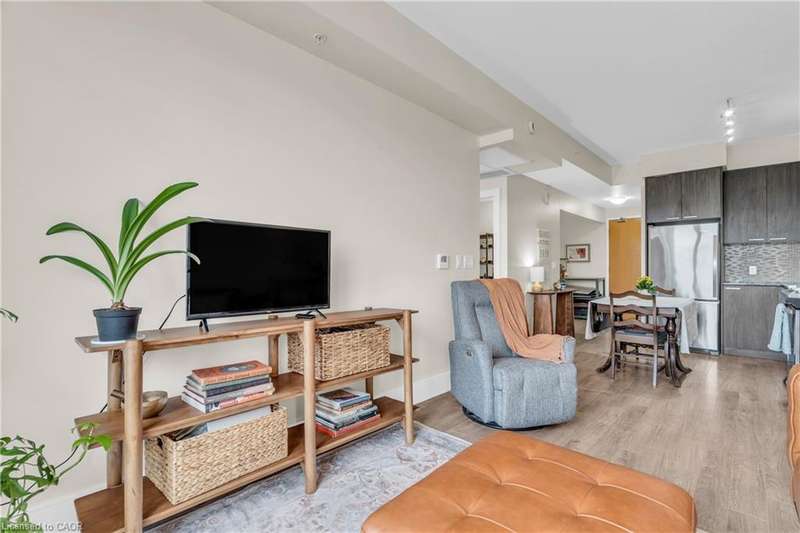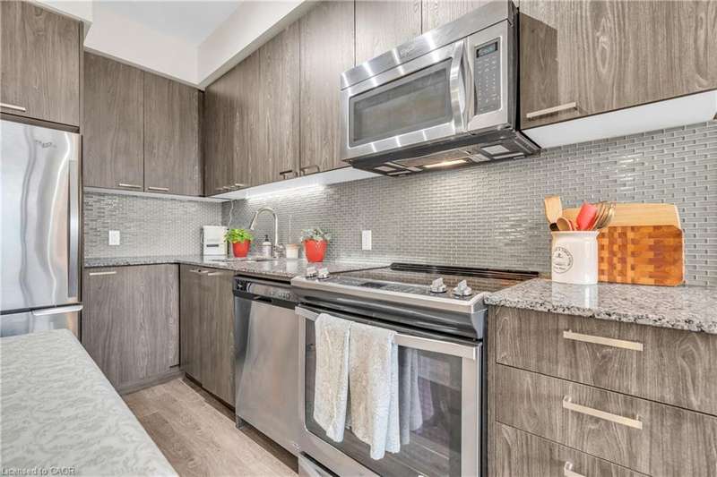 Welcome to Victoria Common, a unique and luxurious midrise development just minutes from downtown! This bright and cheerful 1 bedroom plus den condo is the perfect blend of modern style, comfort, and convenience. Embrace the the bright and inviting atmosphere of this freshly painted unit, featuring vinyl floors, granite countertops, modern wood design cabinetry, and sleek glass backsplash creating a sophisticated and contemporary feel. The expansive 4th-floor balcony offers breathtaking southwesterly views of Kitchener's downtown skyline and spectacular sunsets. Imagine sipping your morning coffee or enjoying a glass of wine in the evening, surrounded by the energy of the city. Building features include: - State-of-the-art geothermal forced air heating and cooling system - Well equipped main floor gym/exercise room with floor-to-ceiling windows. - Large and luxurious party room perfect for special occasions or community hangouts. - 1 Underground parking space and ample visitor parking for guests. -1 Storage locker included and secure bike storage in the parking garage. The best of downtown Kitchener's amenities and natural beauty, just steps away: - Short walk to parks and trails. - Just a stone's throw to downtown restaurants, shops and cafe's. - Easy access to public transportation and bike trails. And, as a pet-friendly building, you can bring your furry friends along!