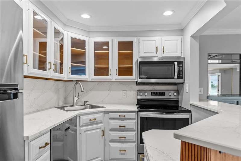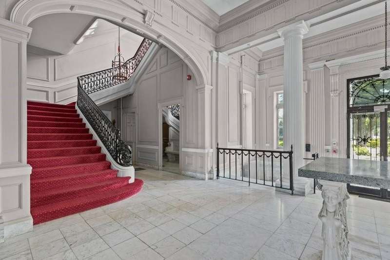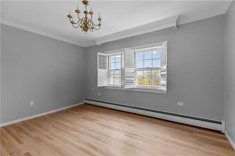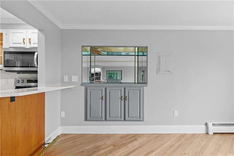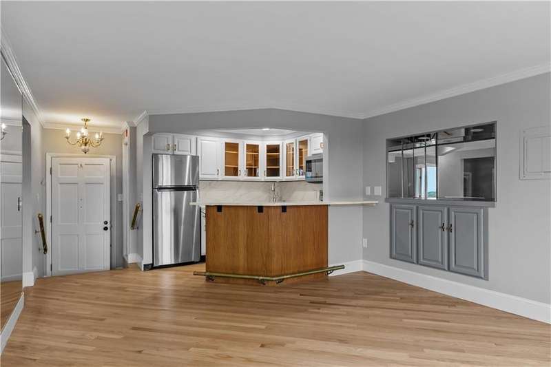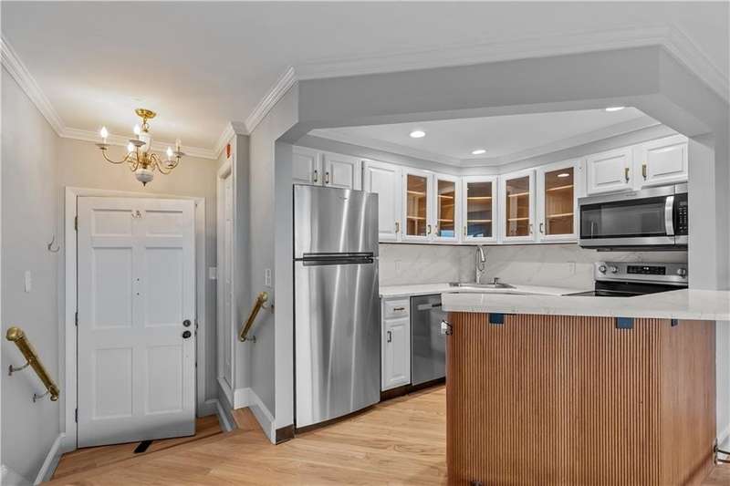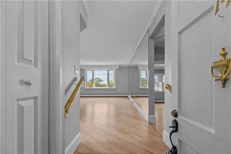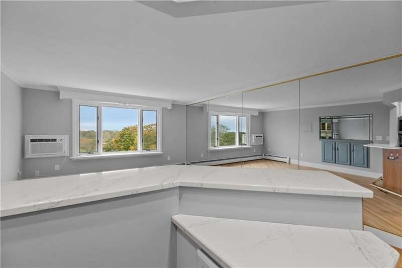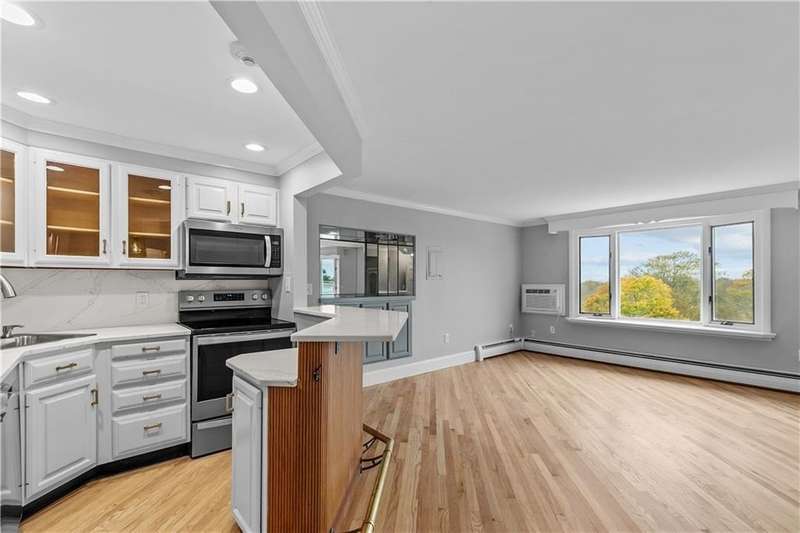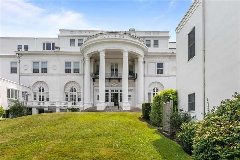 Pet friendly Bellevue Estate Condo, with distant Ocean Views and low HOA fee located across from Rosecliff. This light filled, freshly painted 3rd floor apartment in a stately building, features an open floor plan, new and newly refinished hardwood flooring throughout. The kitchen was updated with quartz countertops, new hardware, freshly painted cabinets and several new appliances. Washer and dryer are located in the spacious bathroom which has marble counters and a marble floor. Good closet space for a unit that size. There is an elevator in the building, a storage unit in the basement and assigned parking for one car. The parklike grounds add to the appeal of this Condo. Water and heat are included in the HOA fee.