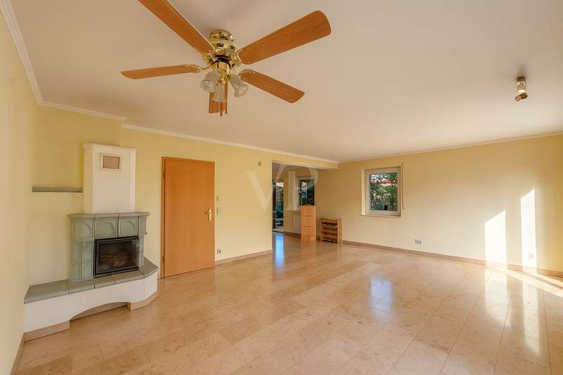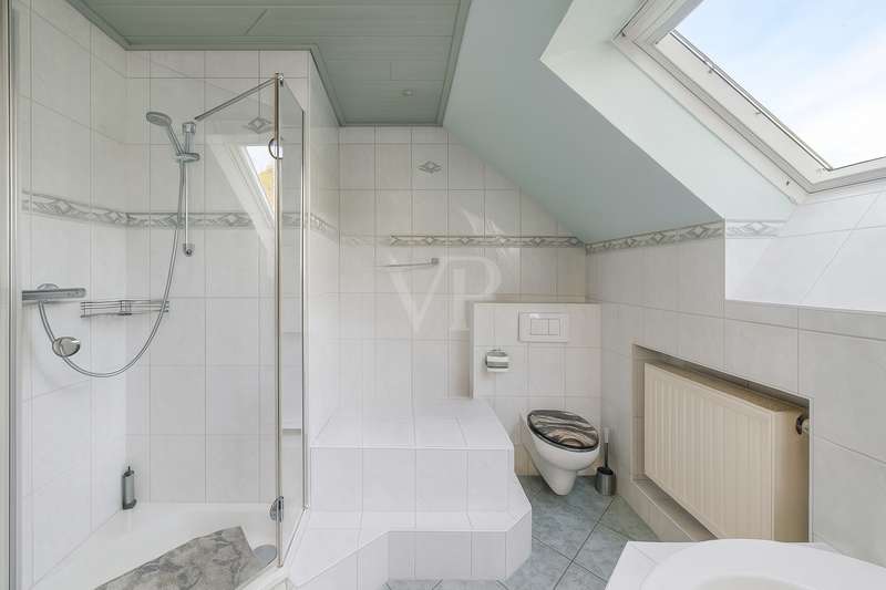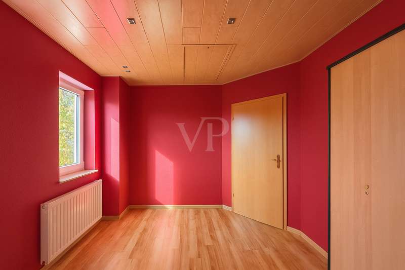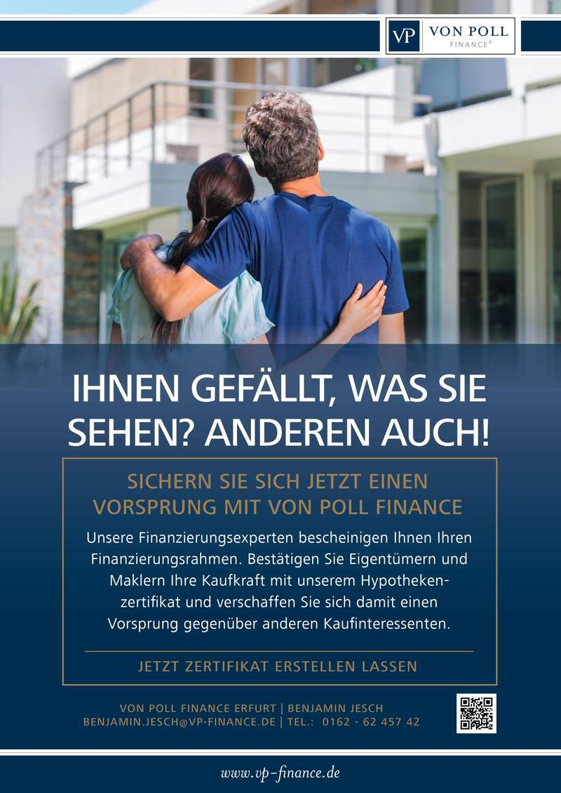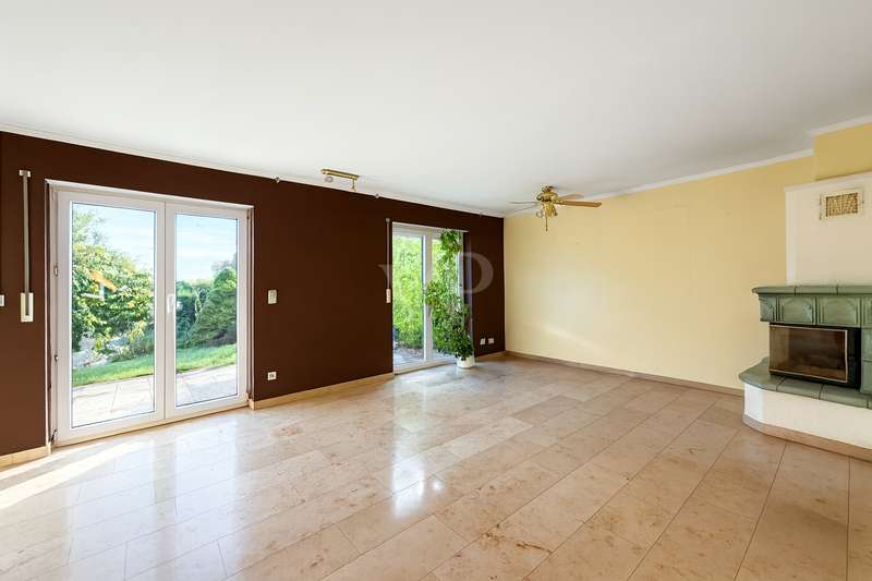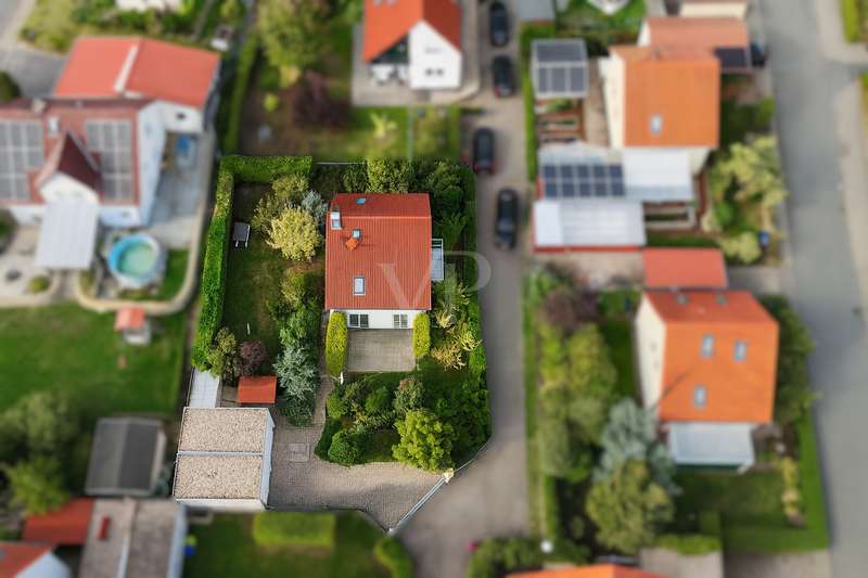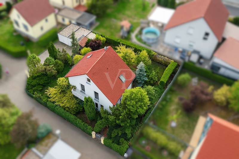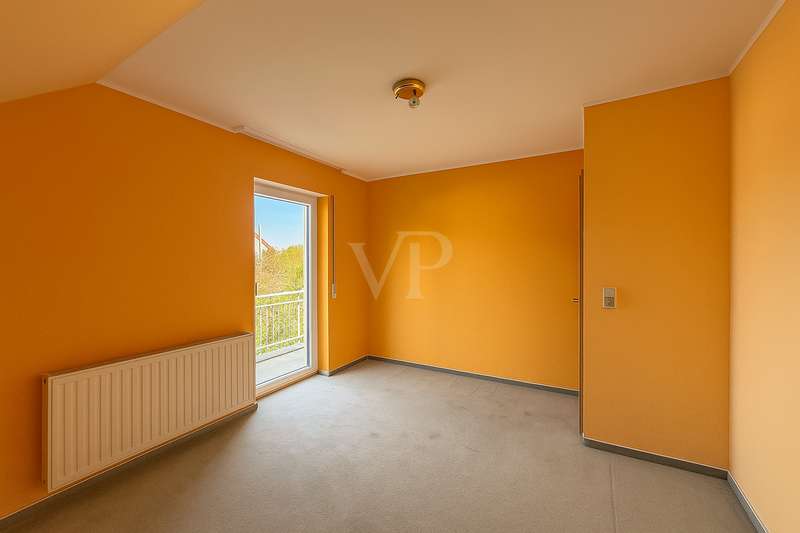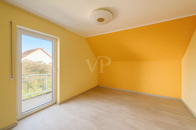 This attractive detached house in solid construction offers approx. 108 m² of living space on a plot of approx. 587 m² in the popular residential area "Am Staudamm" in Straußfurt. The quiet south-facing slope, proximity to the lake and extensive walking paths make it ideal for families, couples, home office users and nature lovers. On the first floor, the light-flooded living and dining area with an open kitchen concept, natural stone flooring made from easy-care Jura marble and pleasant underfloor heating is impressive. A fireplace makes for cozy hours. From here you have direct access to the terrace and the large garden. The terrace has electric shutters for sun protection and comfort. Also on the first floor is a guest WC with an additional washing machine connection, a practical utility room and a storage room. The upper floor comprises two bright bedrooms with access to a shared balcony and a further room that is ideal as a study or guest room. The spacious daylight bathroom is equipped with a corner bathtub, separate shower and floor-to-ceiling tiled walls. Windows in all sanitary rooms provide natural light and a pleasant indoor climate. A special highlight is the converted attic of around 47 m², which is accessible via the study. It offers a variety of uses - from a hobby room to an additional bedroom. The sealed roof provides lasting protection from the elements. There is a double garage on the property, currently divided into a garage and workshop, including cold and waste water connections. An integrated sauna with shower offers additional recreational value. Garden maintenance is made much easier by a ring irrigation system connected to a private well. The entire property is fenced in with an 80 cm high wire mesh fence and has a separate fence door. In addition to the landscaped area, the property also offers a well-tended lawn. The house is technically well equipped: The central gas boiler was renewed in 2024, and an air conditioning system in the bedroom ensures pleasant temperatures. Double-glazed windows and doors with blinds, tilt and turn fittings and electric shutters offer modern living comfort. The front door is made of plastic with safety glass, the boiler room door is fire-retardant. There is a leasehold contract for the property with the church chamber. The ground rent is currently around € 450.00 per year. The remaining term of the leasehold is 54 years. This provides an attractive alternative to the traditional purchase of land with clear financial advantages. Click here for the virtual tour: https://von-poll.com/tour/erfurt/aHOv