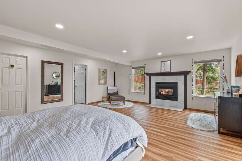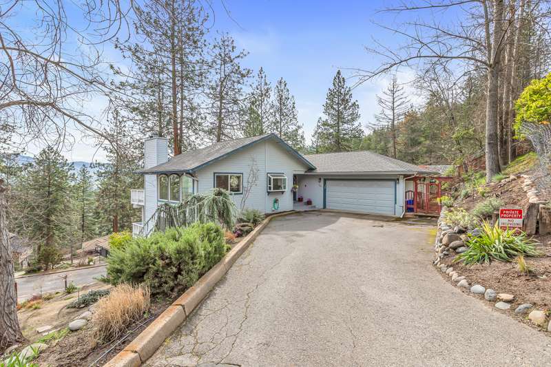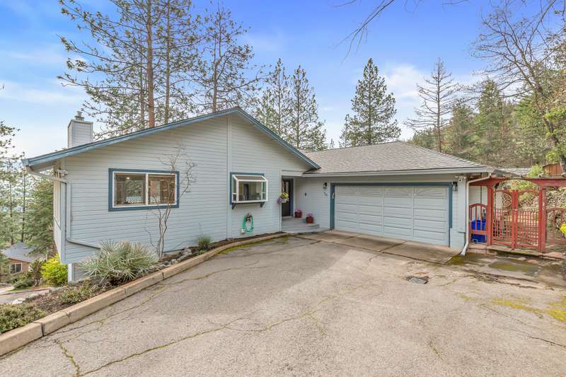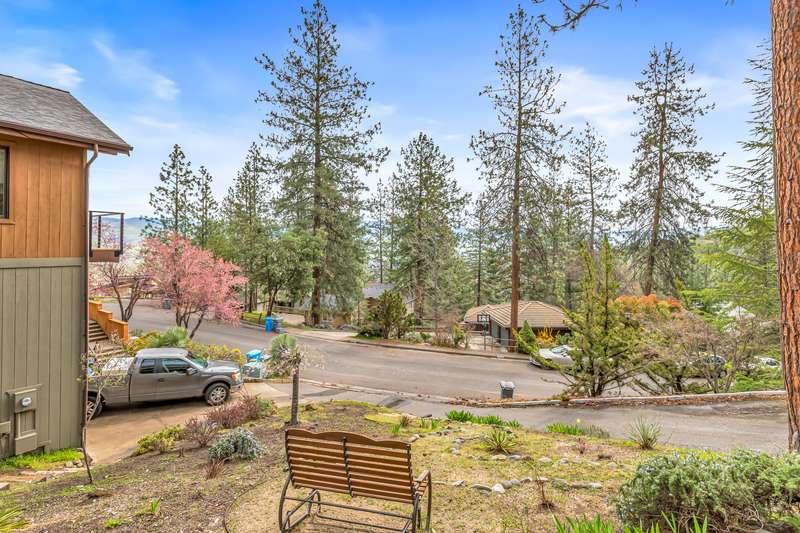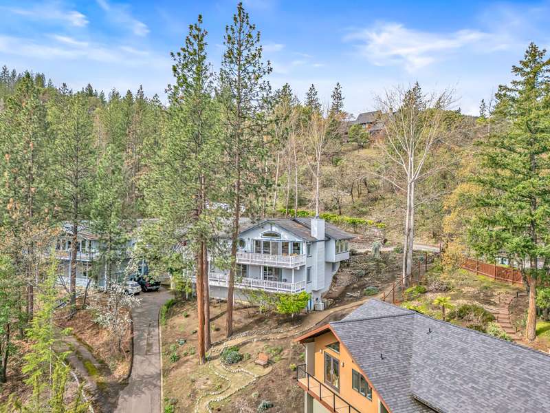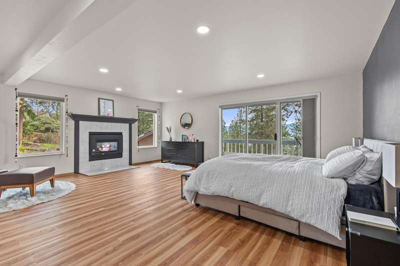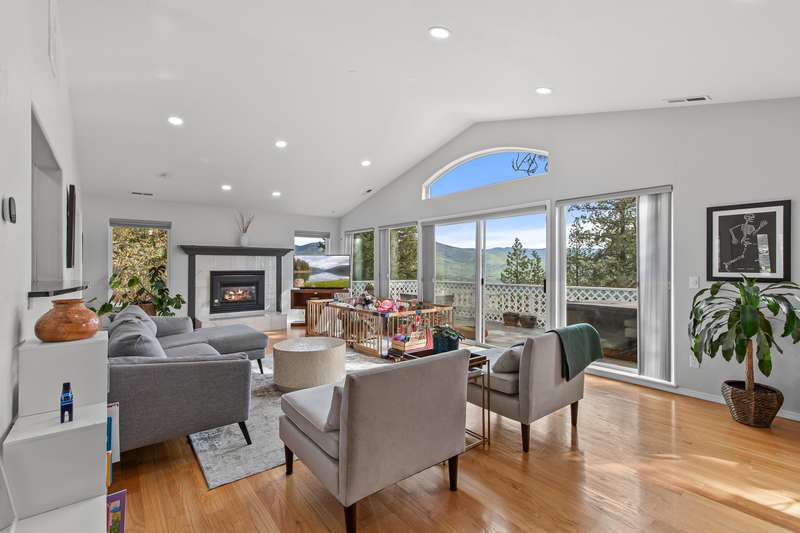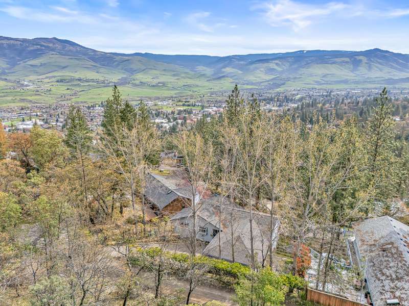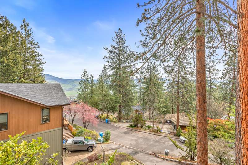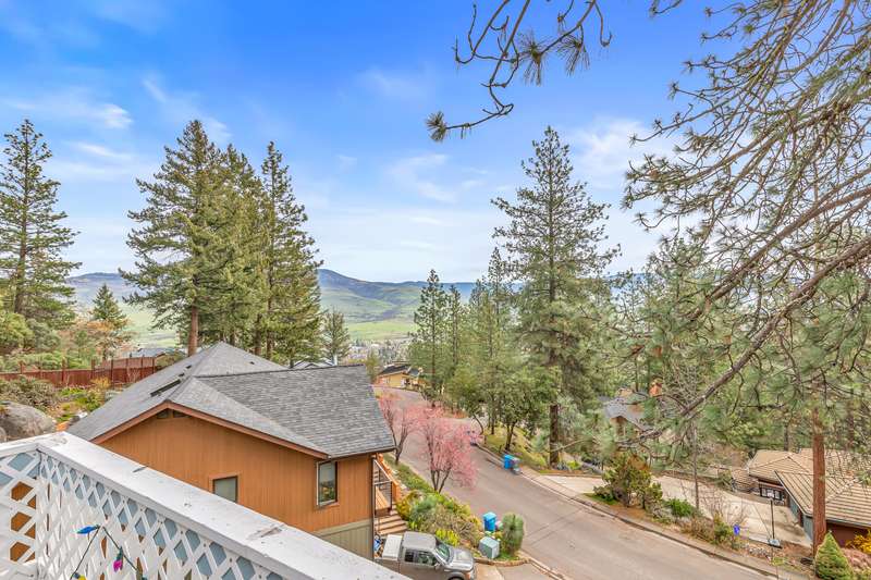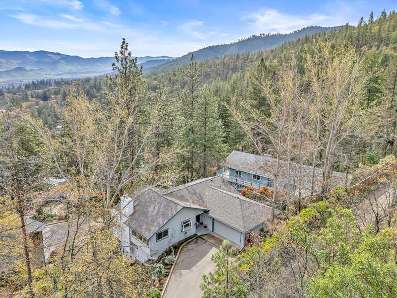Searching for the ultimate Oregon dream home and location? This is it. Nestled near the top of Ashland Loop Drive, surrounded by bike and pedestrian trails, this home offers sweeping views of the city lights and mountains. The open floor plan is filled with natural light from large windows, highlighting real oak hardwood floors and a gourmet kitchen with granite countertops, high-end appliances, and custom cabinetry. The spacious living room features a gas fireplace, wet bar with sink, and connects to a dining room, all opening to a newly painted deck spanning the length of the home. The main level includes a large bedroom and updated bath with walk-in shower. Downstairs, the primary suite is a retreat with fireplace, two walk-in closets, quartzite counters, soaking tub, tile shower, and its own full-length deck. Two additional bedrooms and a large laundry with custom cabinets complete the lower level. Oversized finished two-car garage and landscaped park-like grounds. A must-tour.