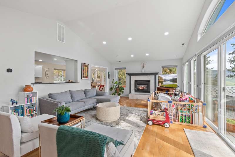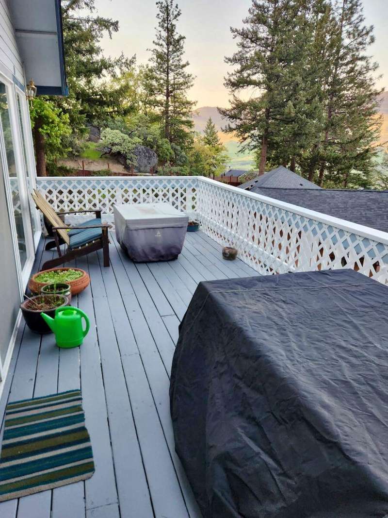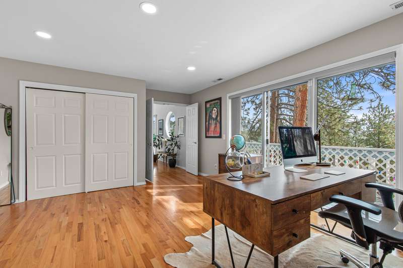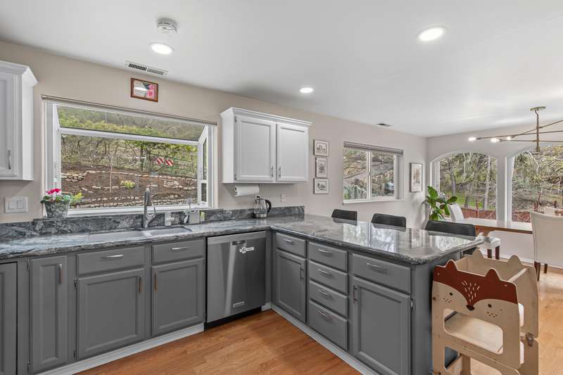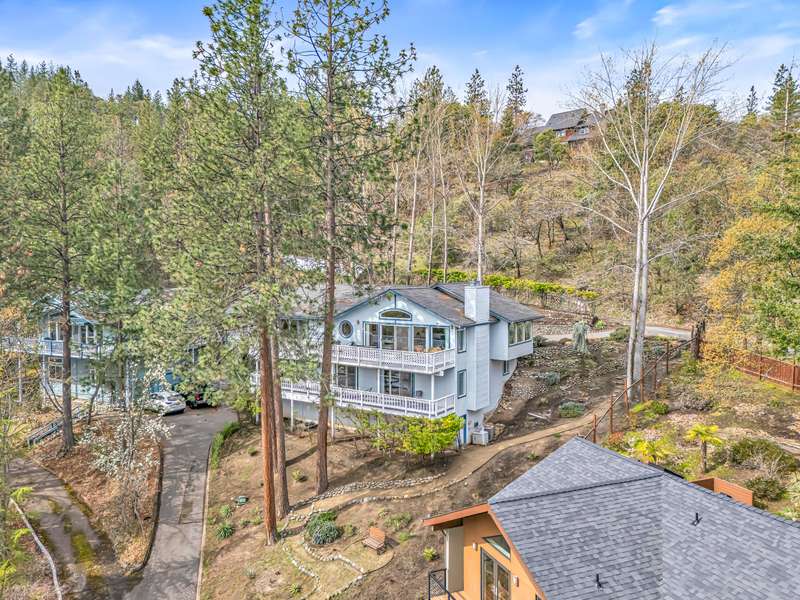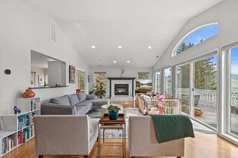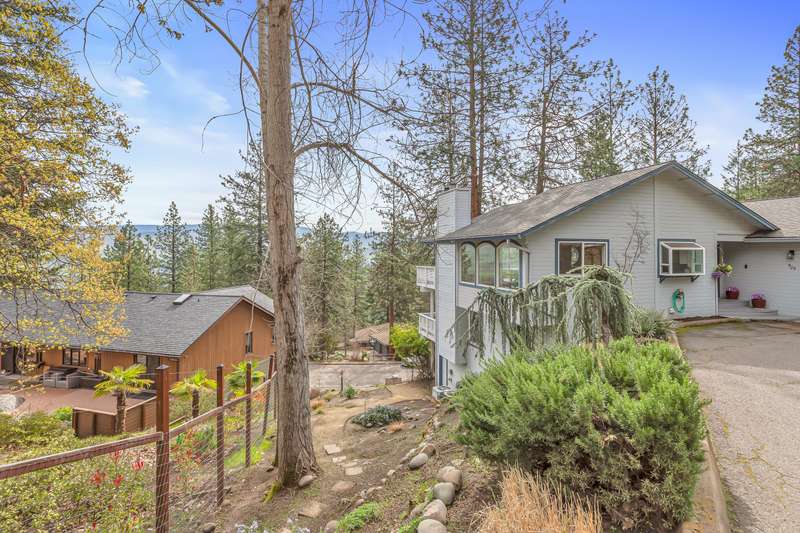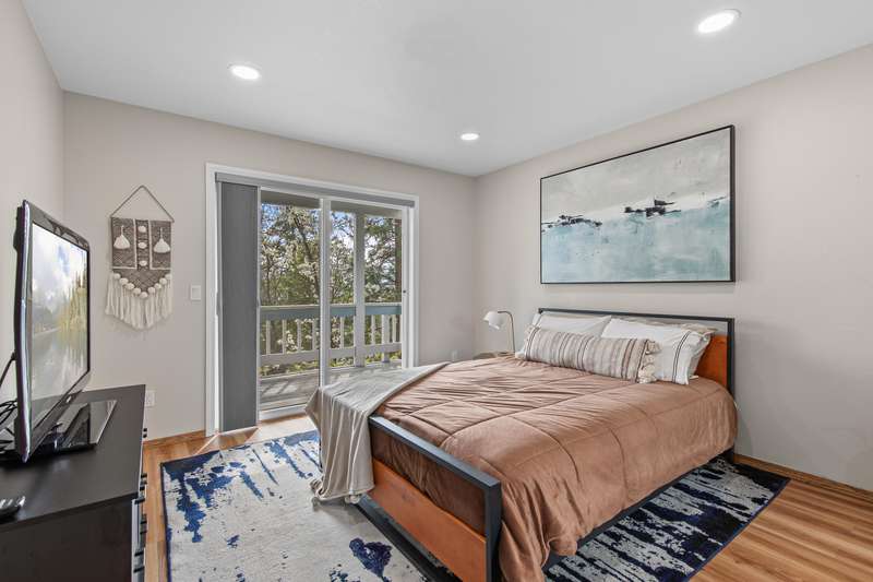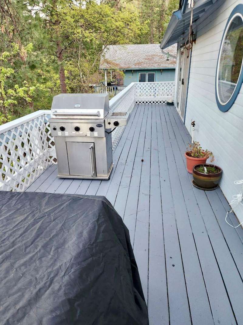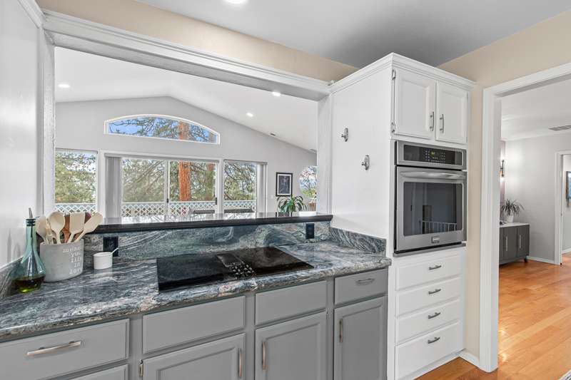 Searching for the ultimate Oregon dream home and location? This is it. Nestled near the top of Ashland Loop Drive, surrounded by bike and pedestrian trails, this home offers sweeping views of the city lights and mountains. The open floor plan is filled with natural light from large windows, highlighting real oak hardwood floors and a gourmet kitchen with granite countertops, high-end appliances, and custom cabinetry. The spacious living room features a gas fireplace, wet bar with sink, and connects to a dining room, all opening to a newly painted deck spanning the length of the home. The main level includes a large bedroom and updated bath with walk-in shower. Downstairs, the primary suite is a retreat with fireplace, two walk-in closets, quartzite counters, soaking tub, tile shower, and its own full-length deck. Two additional bedrooms and a large laundry with custom cabinets complete the lower level. Oversized finished two-car garage and landscaped park-like grounds. A must-tour.