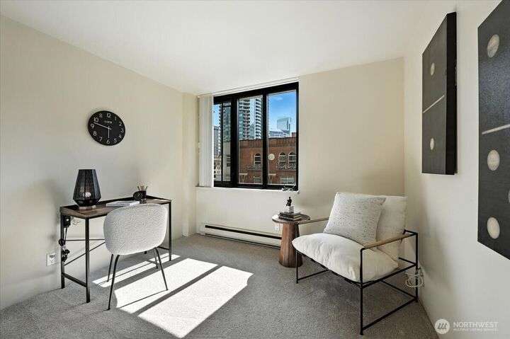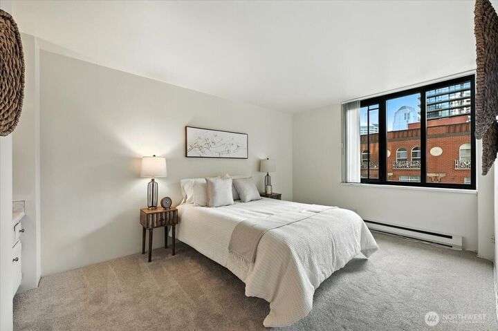 Compelling NEW PRICE! Live beautifully in the heart of Seattle at a value that makes sense. This vibrant Belltown corner-unit condo features 2BD/1.75BA, city & partial Sound views from large, insulated windows, and a private balcony. Fresh paint and new carpet offer a clean slate. Includes deeded covered, secure parking and private storage. HOA covers all utilities—electricity, water, sewer, garbage, earthquake insurance, plus pool, sauna, gym, game room, Amazon lockers & on-site management. No assessments. This refined urban retreat places you just steps from Seattle's icons. From the Space Needle to the Sculpture Park, world-class art, dining, & waterfront, Pike Place Market, public transit and so much more. See today-picture the future!