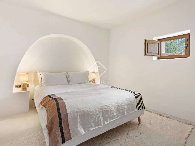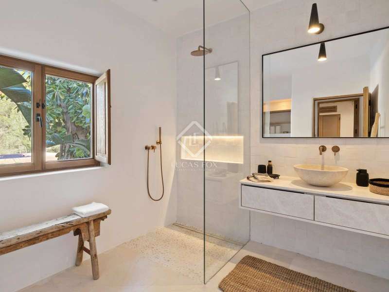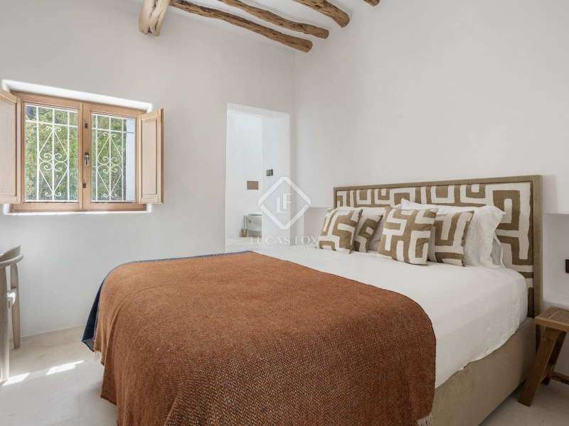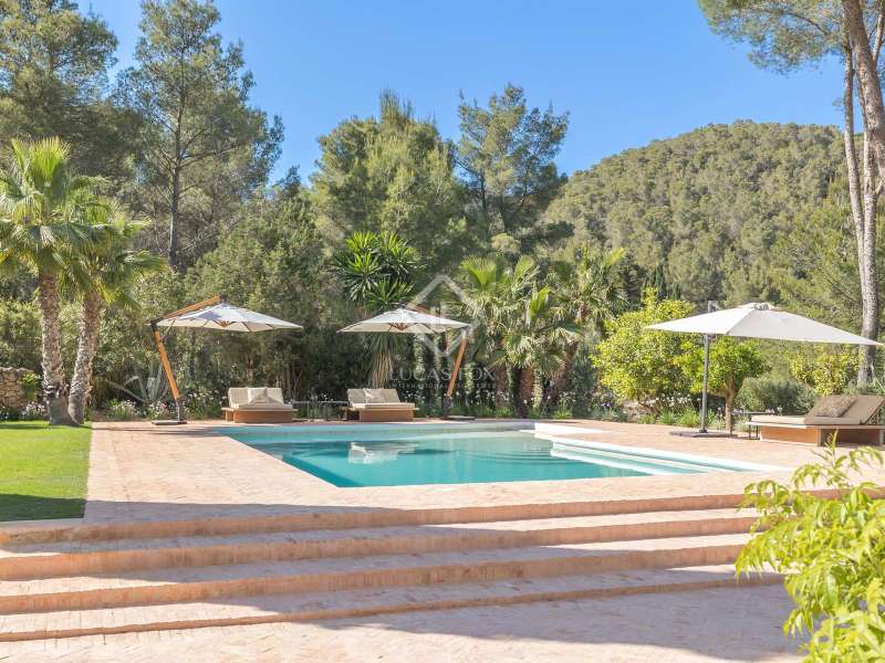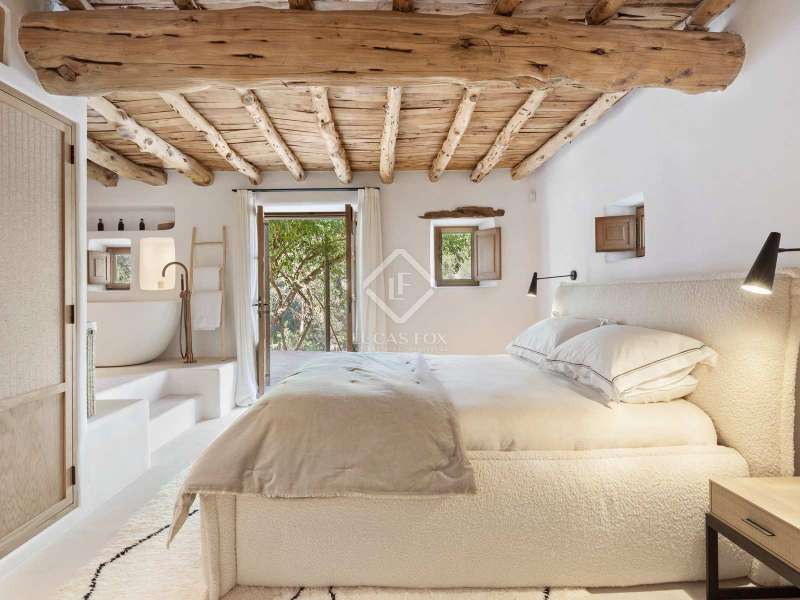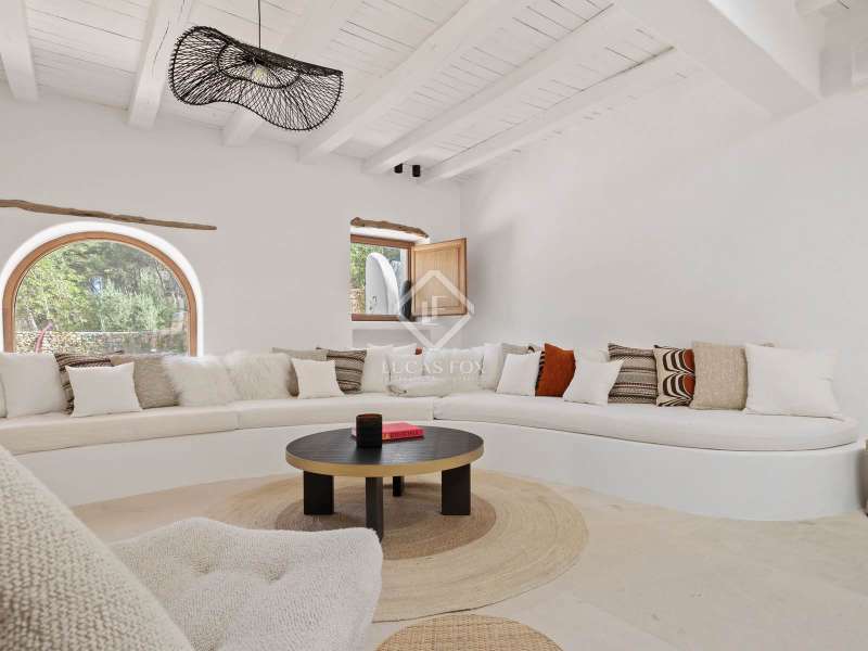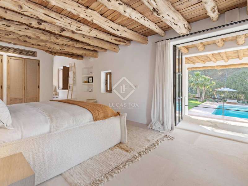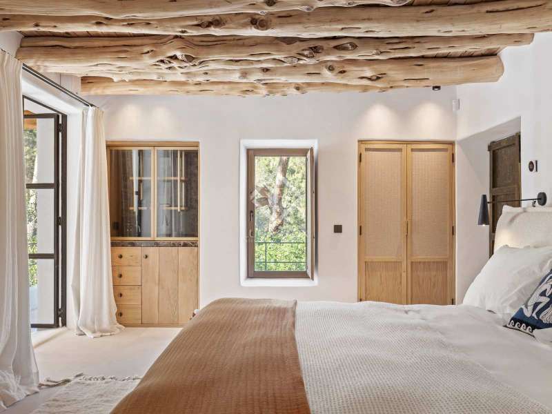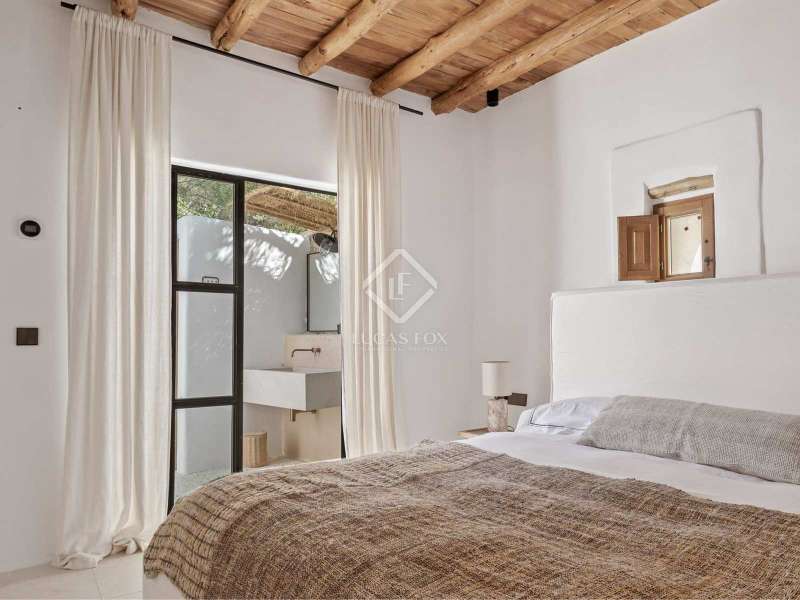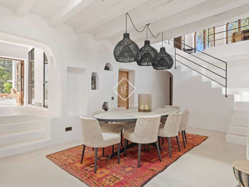This lovely property is nestled amidst pine forests just beyond Ibiza Town. Drawing from the verdant surroundings, the interiors embrace organic shapes and natural elements. Whitewashed walls and stone floors provide serene, unassuming backgrounds. Within the living area, bespoke integrated seating, fashioned from plaster, curves seamlessly along the room's perimeter. While practical shelving blends into the walls and Sabina wood ceilings soften straight lines and angles, preserving the building's heritage. This minimalistic aesthetic extends to the kitchen, a bright and airy space where wooden cabinets and marble surfaces offer a refined yet rustic allure. Integrated appliances, floor-to-ceiling display cabinets, and a breakfast bar elevate the space. For outdoor dining, an external pizza oven awaits. Stepping onto the dining terrace reveals a stunning double-height area, crowned by a Sabina wood roof. The expansive space mirrors the towering trees in the distance, providing a shaded retreat for gatherings or relaxation. A well-groomed lawn and a 10-metre pool complete the outdoor oasis. Tranquility reigns in each of the five bedrooms. The main suite, occupying the entire first floor, exudes perfection with its wooden ceilings, white walls, and stone-coloured tiles. An indulgent en suite, featuring a deep bathtub, awaits up a set of steps. In-built storage adds practicality, while a Juliet-style balcony offers breathtaking views. Throw open the doors and savour the sunrise with a morning coffee - a small fridge and coffee area ensure convenience. Two additional bedroom suites and a guest bedroom, served by a family bathroom, embody simplicity. A final suite boasts a remarkable outdoor bathroom with a rainfall shower, stone sink, and pebble floors, adding a tactile element to the space. Please contact us for further information.