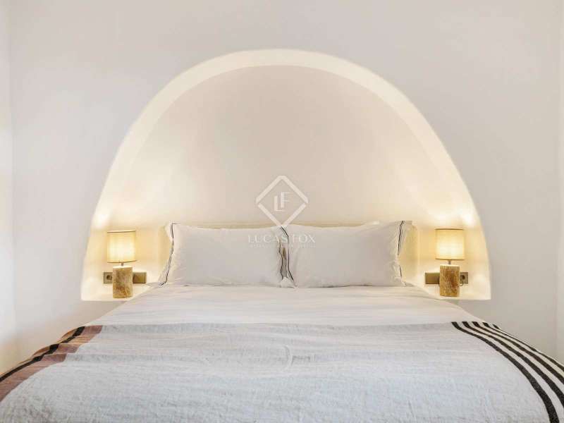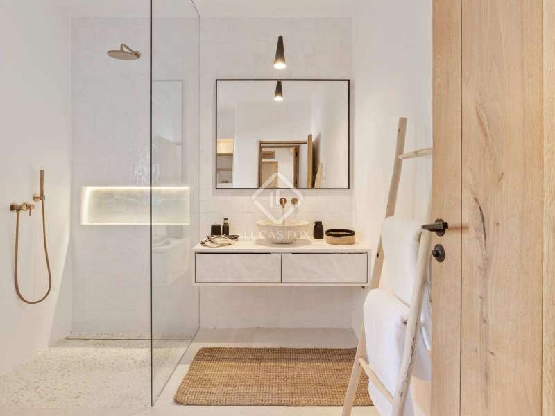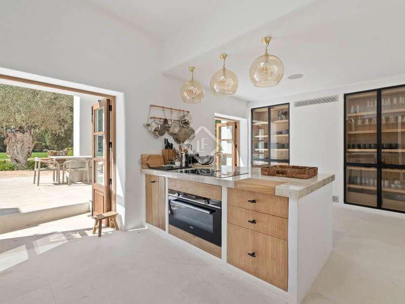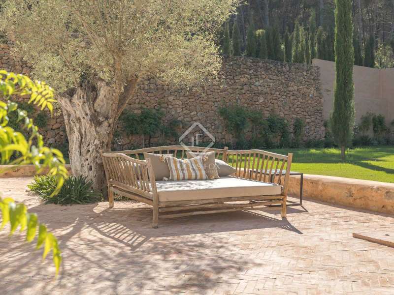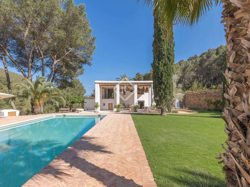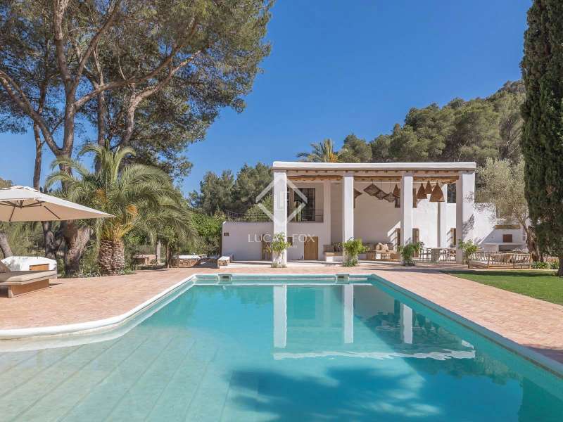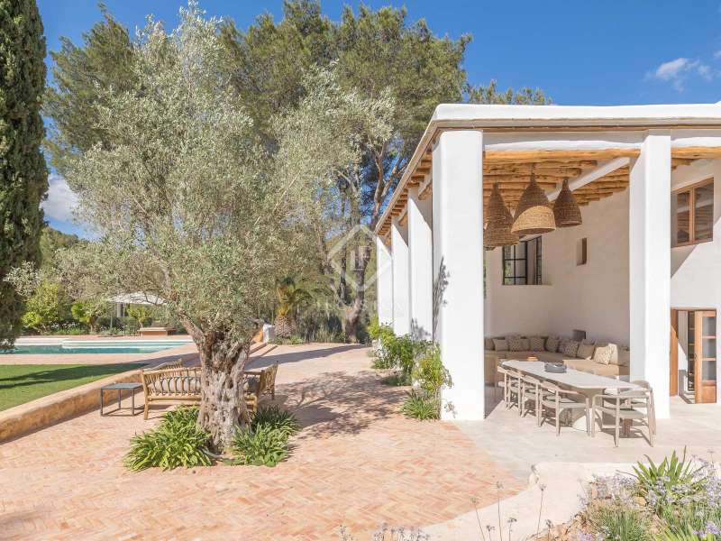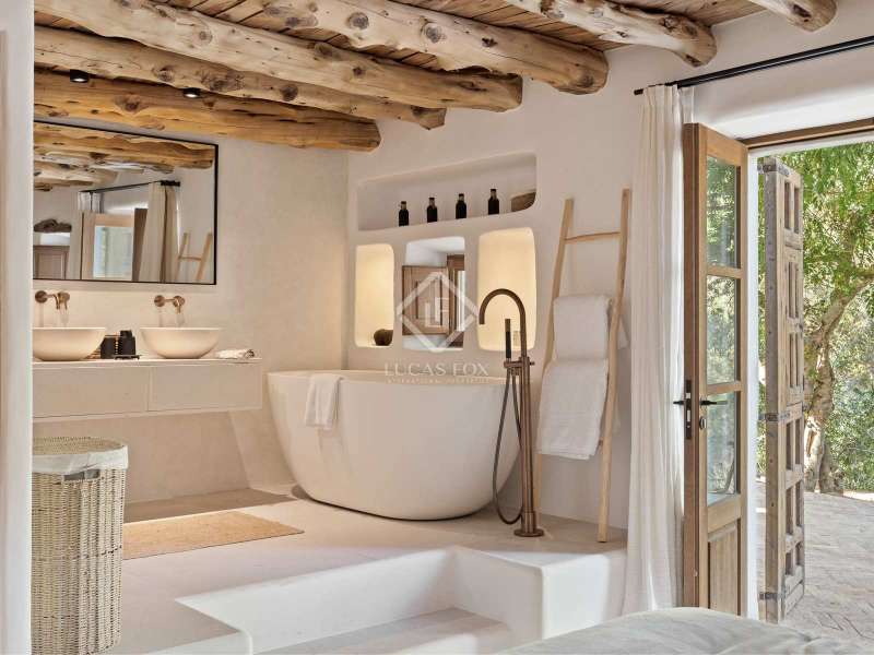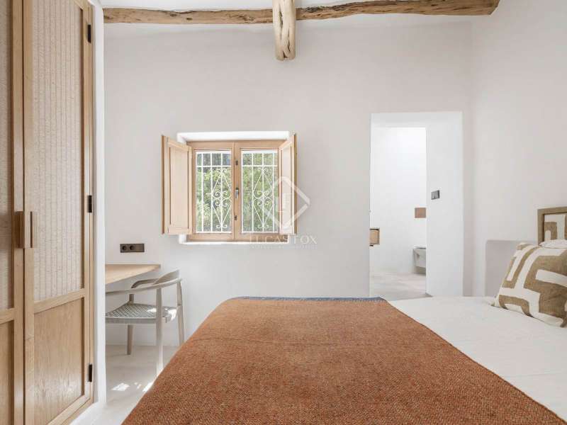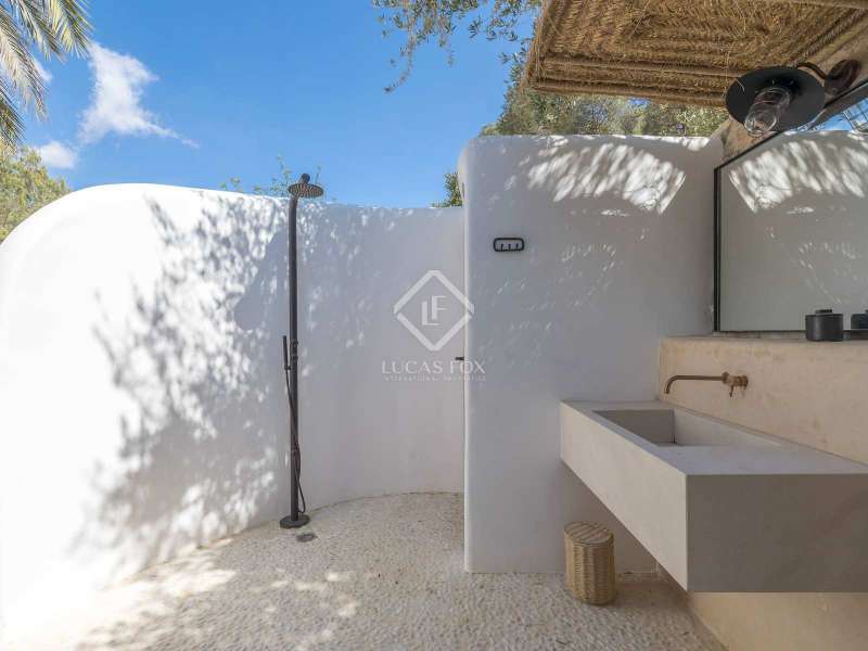 This lovely property is nestled amidst pine forests just beyond Ibiza Town. Drawing from the verdant surroundings, the interiors embrace organic shapes and natural elements. Whitewashed walls and stone floors provide serene, unassuming backgrounds. Within the living area, bespoke integrated seating, fashioned from plaster, curves seamlessly along the room's perimeter. While practical shelving blends into the walls and Sabina wood ceilings soften straight lines and angles, preserving the building's heritage. This minimalistic aesthetic extends to the kitchen, a bright and airy space where wooden cabinets and marble surfaces offer a refined yet rustic allure. Integrated appliances, floor-to-ceiling display cabinets, and a breakfast bar elevate the space. For outdoor dining, an external pizza oven awaits. Stepping onto the dining terrace reveals a stunning double-height area, crowned by a Sabina wood roof. The expansive space mirrors the towering trees in the distance, providing a shaded retreat for gatherings or relaxation. A well-groomed lawn and a 10-metre pool complete the outdoor oasis. Tranquility reigns in each of the five bedrooms. The main suite, occupying the entire first floor, exudes perfection with its wooden ceilings, white walls, and stone-coloured tiles. An indulgent en suite, featuring a deep bathtub, awaits up a set of steps. In-built storage adds practicality, while a Juliet-style balcony offers breathtaking views. Throw open the doors and savour the sunrise with a morning coffee - a small fridge and coffee area ensure convenience. Two additional bedroom suites and a guest bedroom, served by a family bathroom, embody simplicity. A final suite boasts a remarkable outdoor bathroom with a rainfall shower, stone sink, and pebble floors, adding a tactile element to the space. Please contact us for further information.