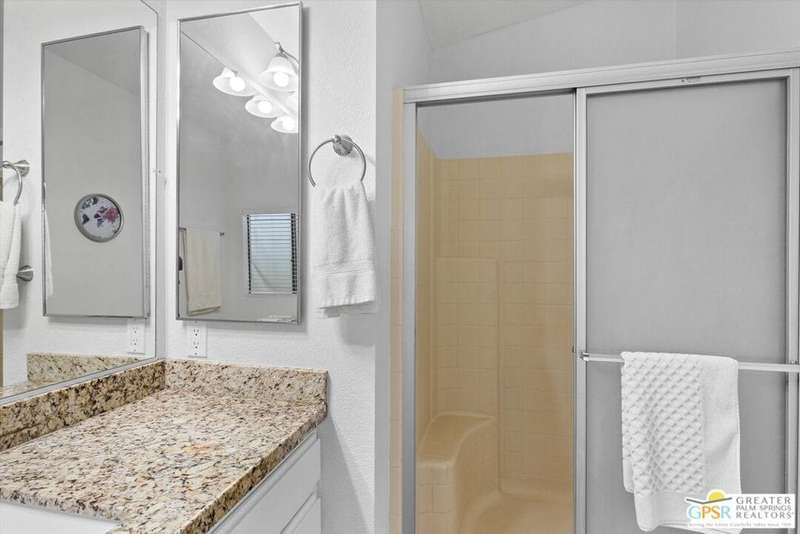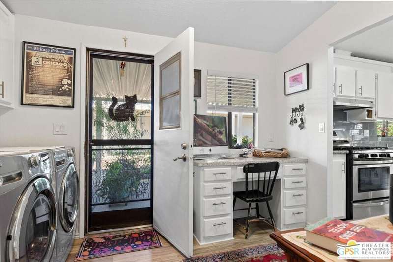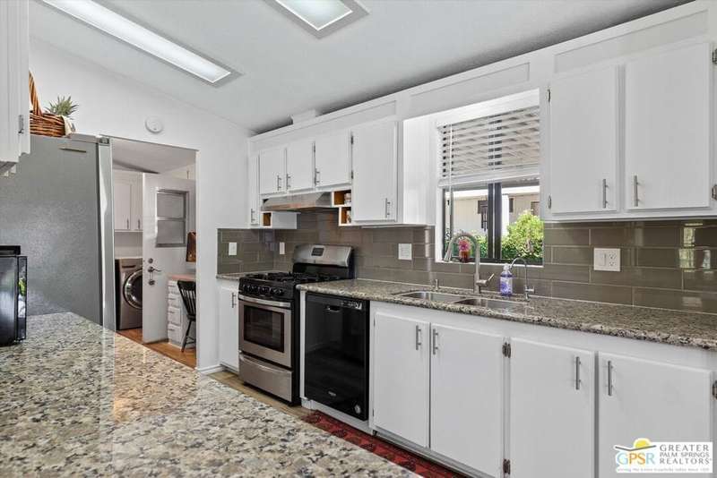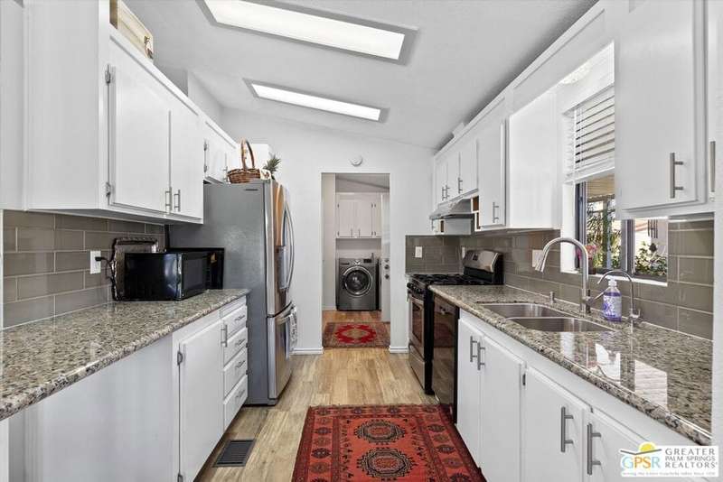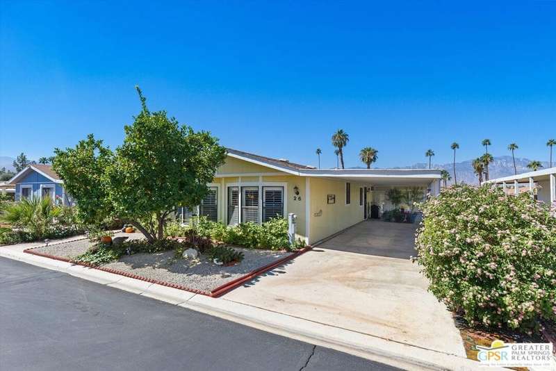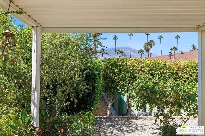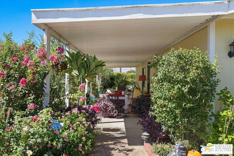Embraced by colorful gardens, mountain views and shaded outdoor spaces on both sides, this move-in-ready residence elevates indoor/outdoor living to new heights at Palm Desert's 55-and-better Suncrest Country Club. Built in 1986, the manufactured home is open and bright, with two bay windows welcoming natural light into the seamless living and dining room space and vaulted ceilings lending a sense of openness throughout. Approximately 1,344 square feet, the residence showcases newer woodgrain laminate flooring, upgraded granite countertops in the kitchen and baths, a NU Aqua water filtration system, plantation shutters, mirrored wardrobe doors, ceiling fans and fresh paint. The kitchen flows directly to the dining room and hosts white cabinetry, stainless steel appliances, a peninsula, and full tile backsplash. An oversized laundry room off the kitchen opens to the outdoors and presents a built-in desk with granite top. Two private bedrooms and two baths include a spacious primary suite with generous closet, a soaking tub and separate shower. Settled in a quiet and serene area of the community, this lovingly maintained home offers a seating area, large storage space and golf cart parking on the carport side, while the entry side features a full-length patio that is primed for entertaining. Located in the western end of Palm Desert near Rancho Mirage and Palm Springs, Suncrest Country Club is home to a luxurious clubhouse with billiards, library, pro shop and the popular Jazzy J's cafe. Residents appreciate having easy access to three swimming pools, in-ground spas, lighted tennis and pickleball courts, and a gorgeous 9-hole golf course. Premium resorts, abundant shopping, countless restaurants, and Eisenhower Medical Center are moments from home.
